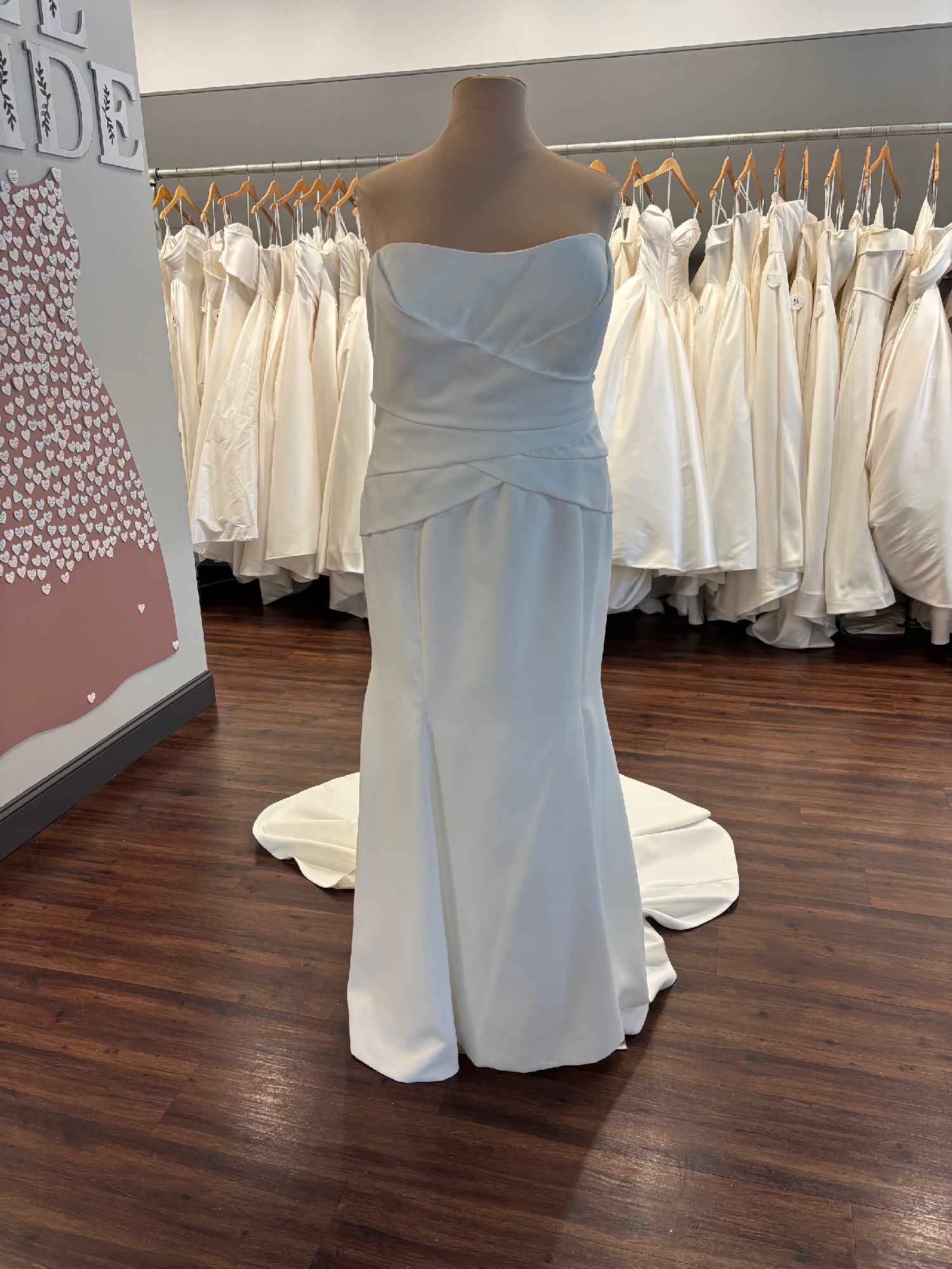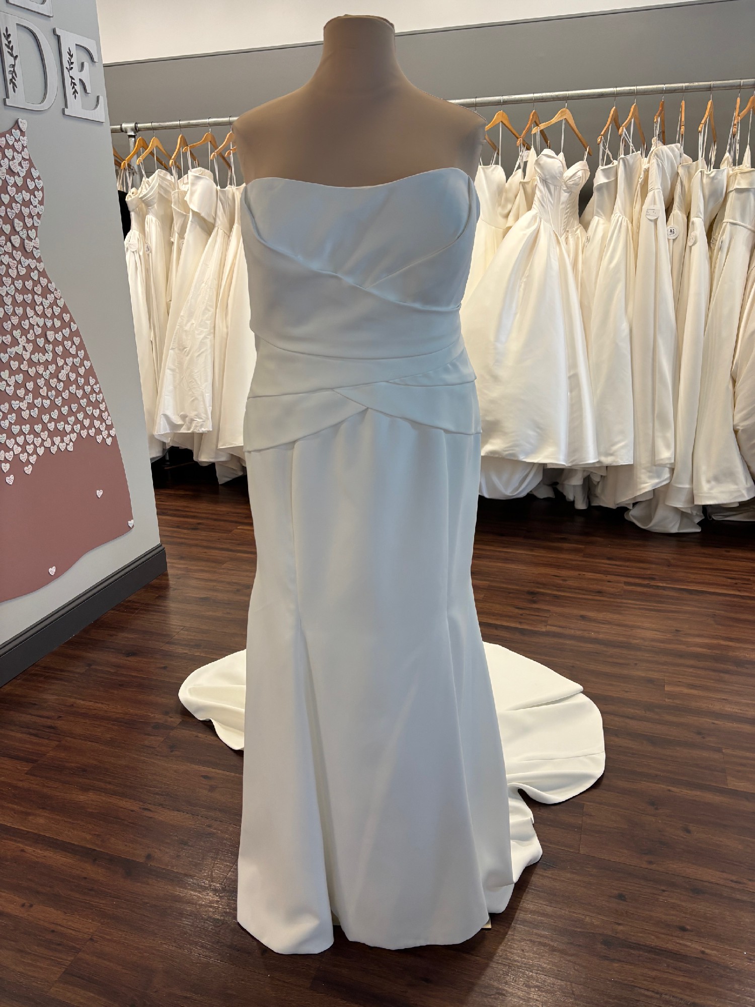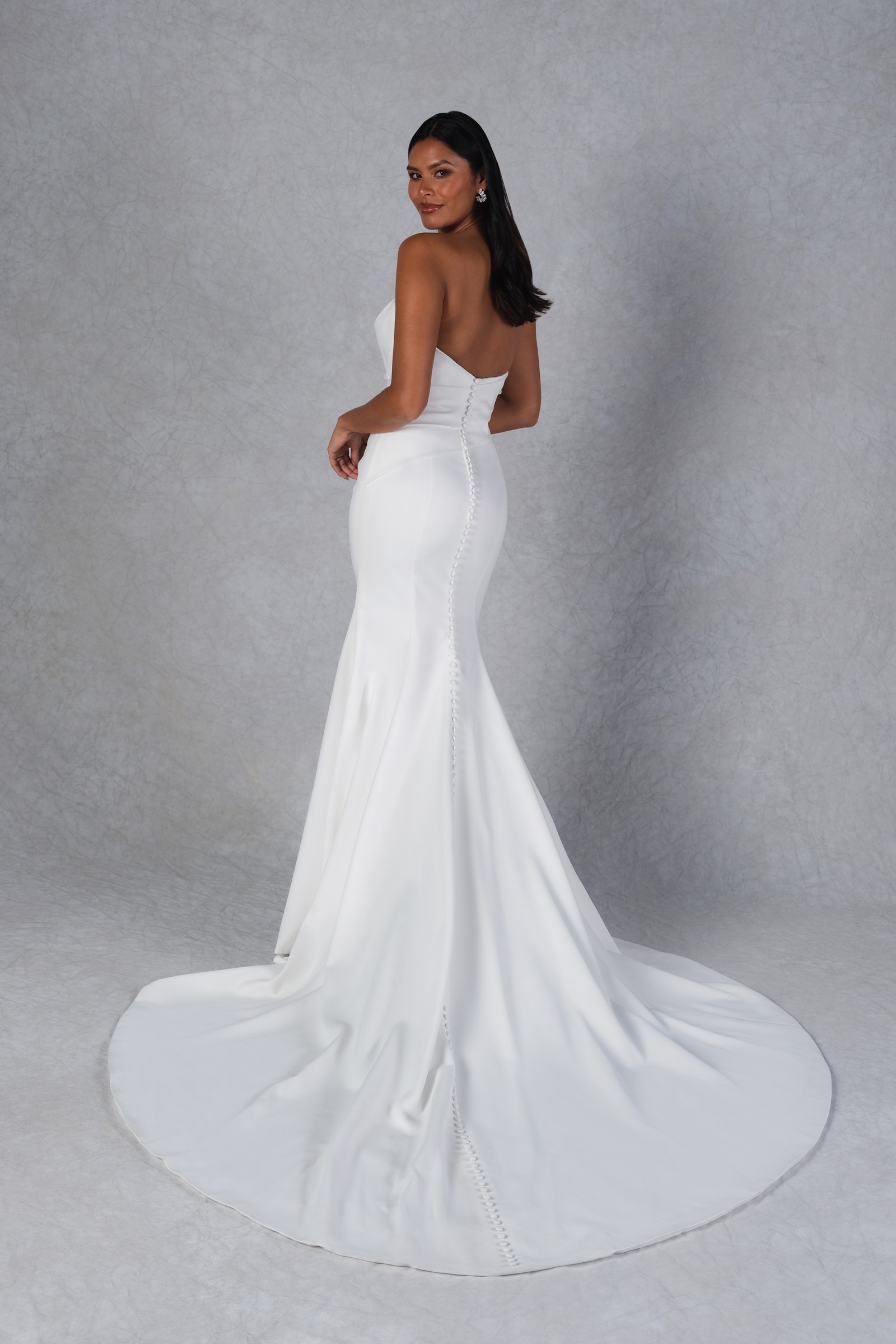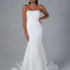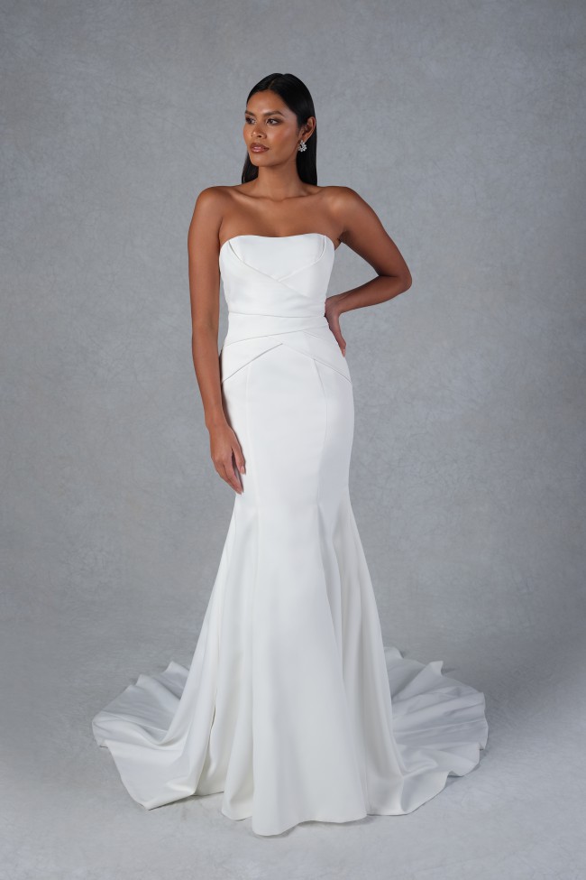 Designed specifically for the curvy bride, this fit-and-flare silhouette elegantly hugs your curves, creating a flattering shape that enhances your natural beauty. The straight neckline adds a touch of sophistication, while the strapless design showcases your shoulders and collarbone beautifully.