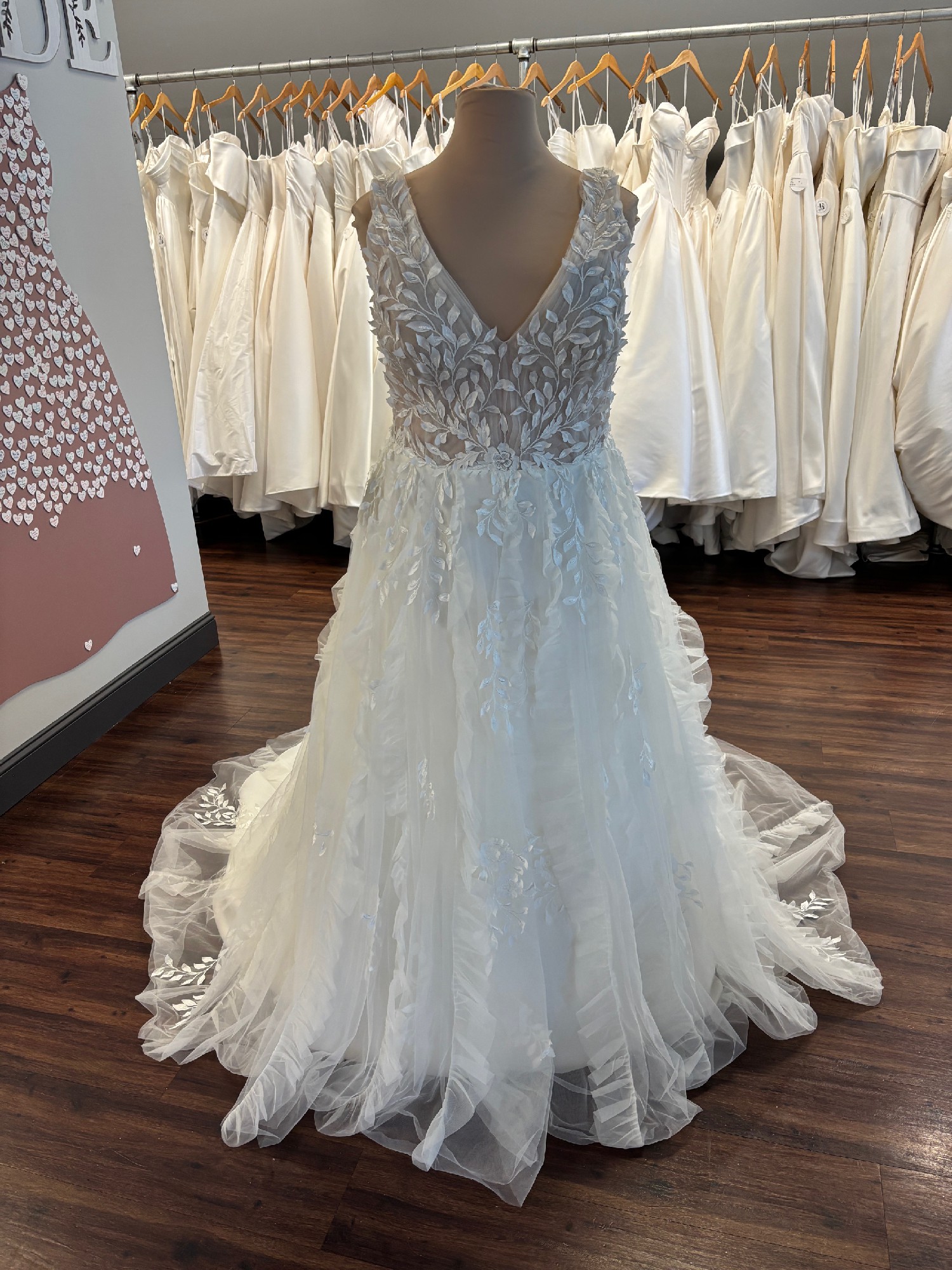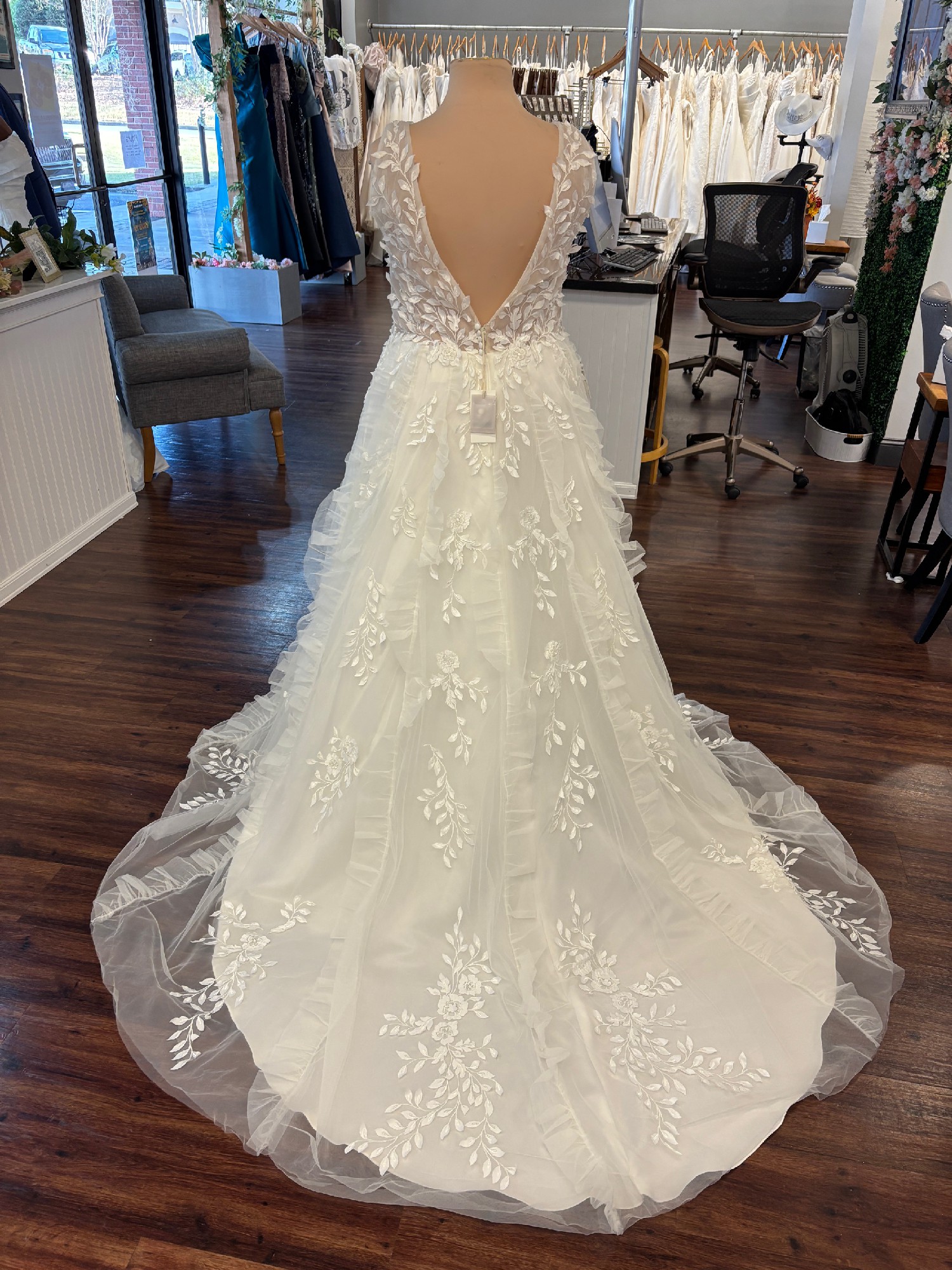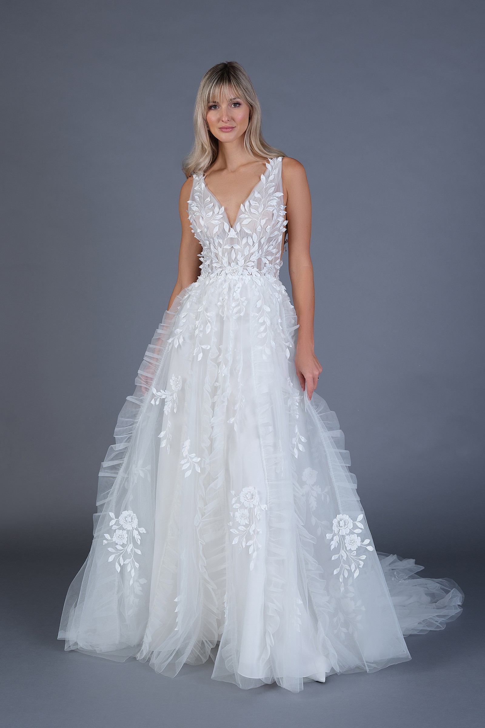 Tulle A-line featuring pleated tulle ruffle skirt. Sheer bodice designed with plunging V-neckline, V-side cutouts, and V-back. Adorned with embroidered 3D satin appliques. Finished with tulle covered buttons and chapel length train.