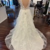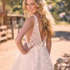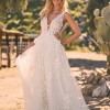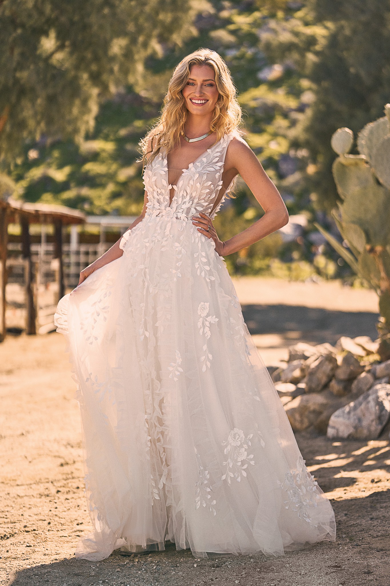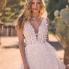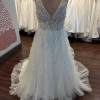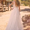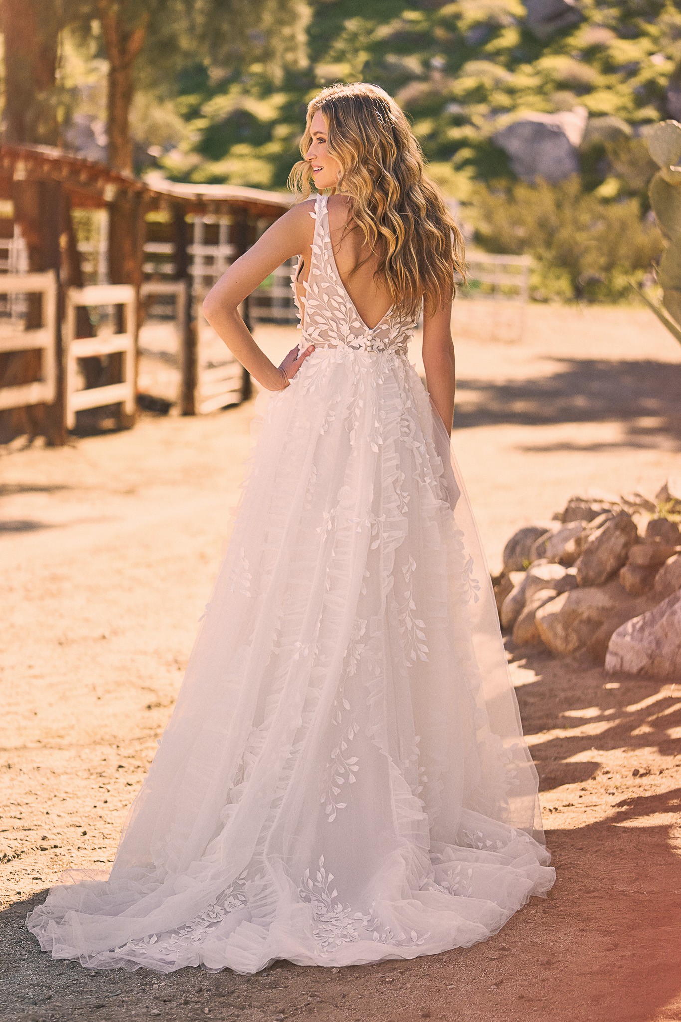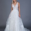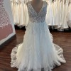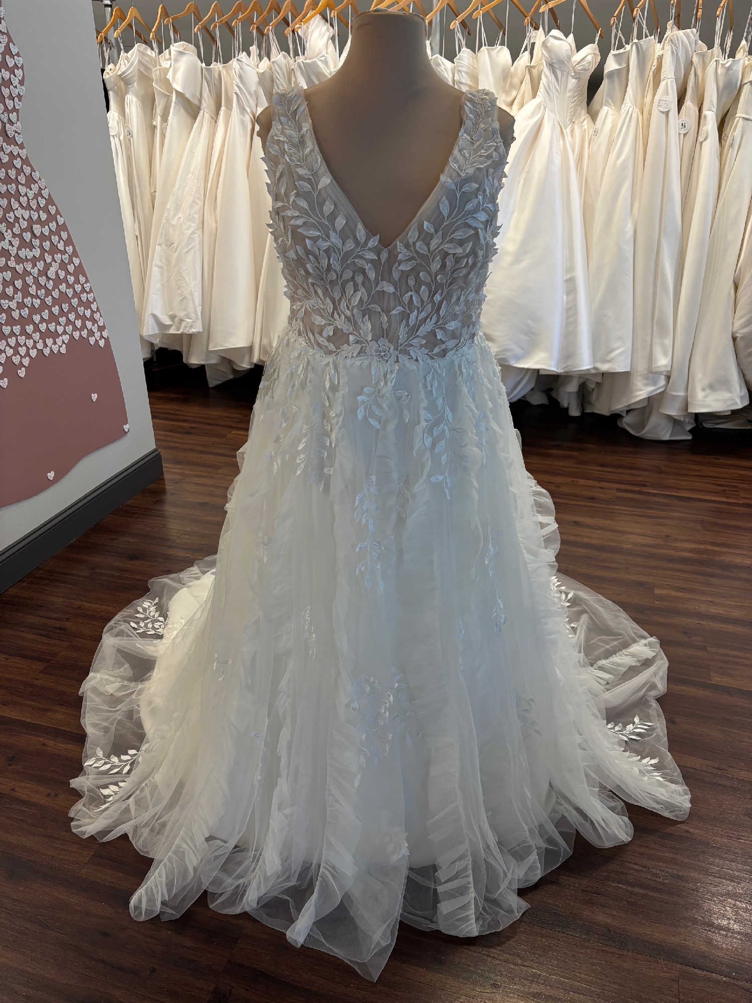 Tulle A-line featuring pleated tulle ruffle skirt. Sheer bodice designed with plunging V-neckline, V-side cutouts, and V-back. Adorned with embroidered 3D satin appliques. Finished with tulle covered buttons and chapel length train.