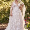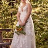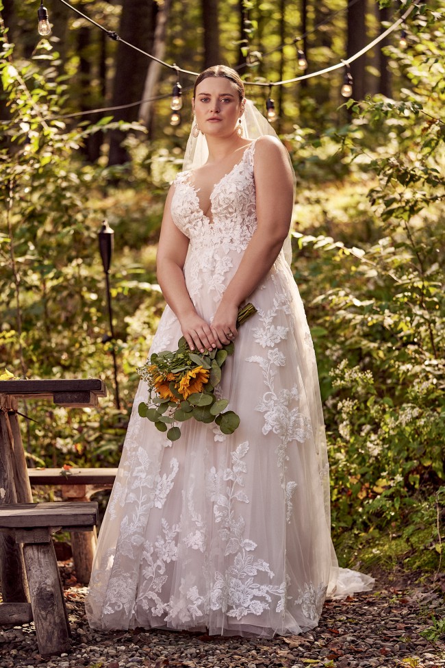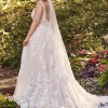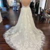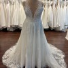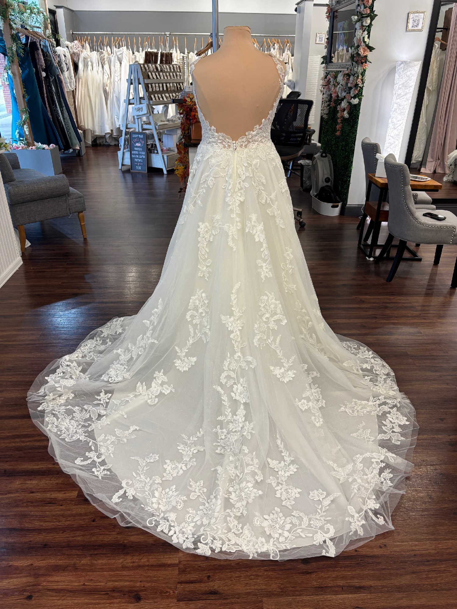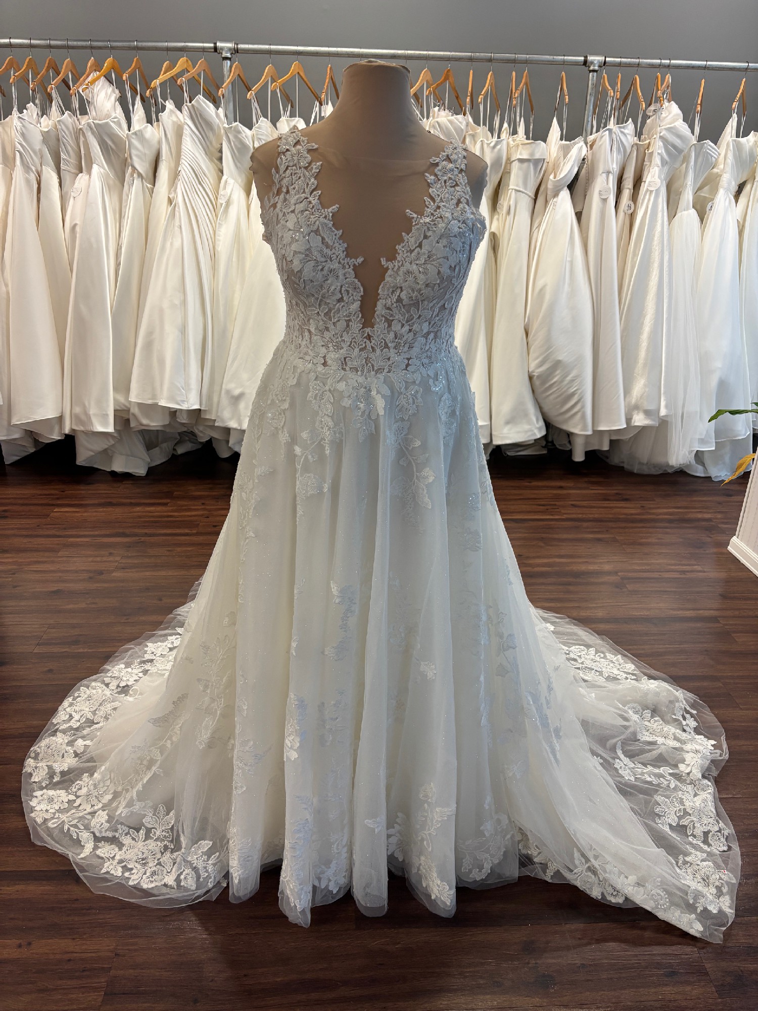A-line gown with square cut plunging illusion Sabrina neckline, illusion side inserts and open scoop back. Sheer bodice detailed with Chantilly lace underlay and adorned with sequined embroidered lace appliques. Finished with tulle pockets in skirt and tulle covered buttons on back. Version with sparkle tulle underlay available. Version with raised back neckline available. Version with sparkle tulle underlay and raised back neckline available.