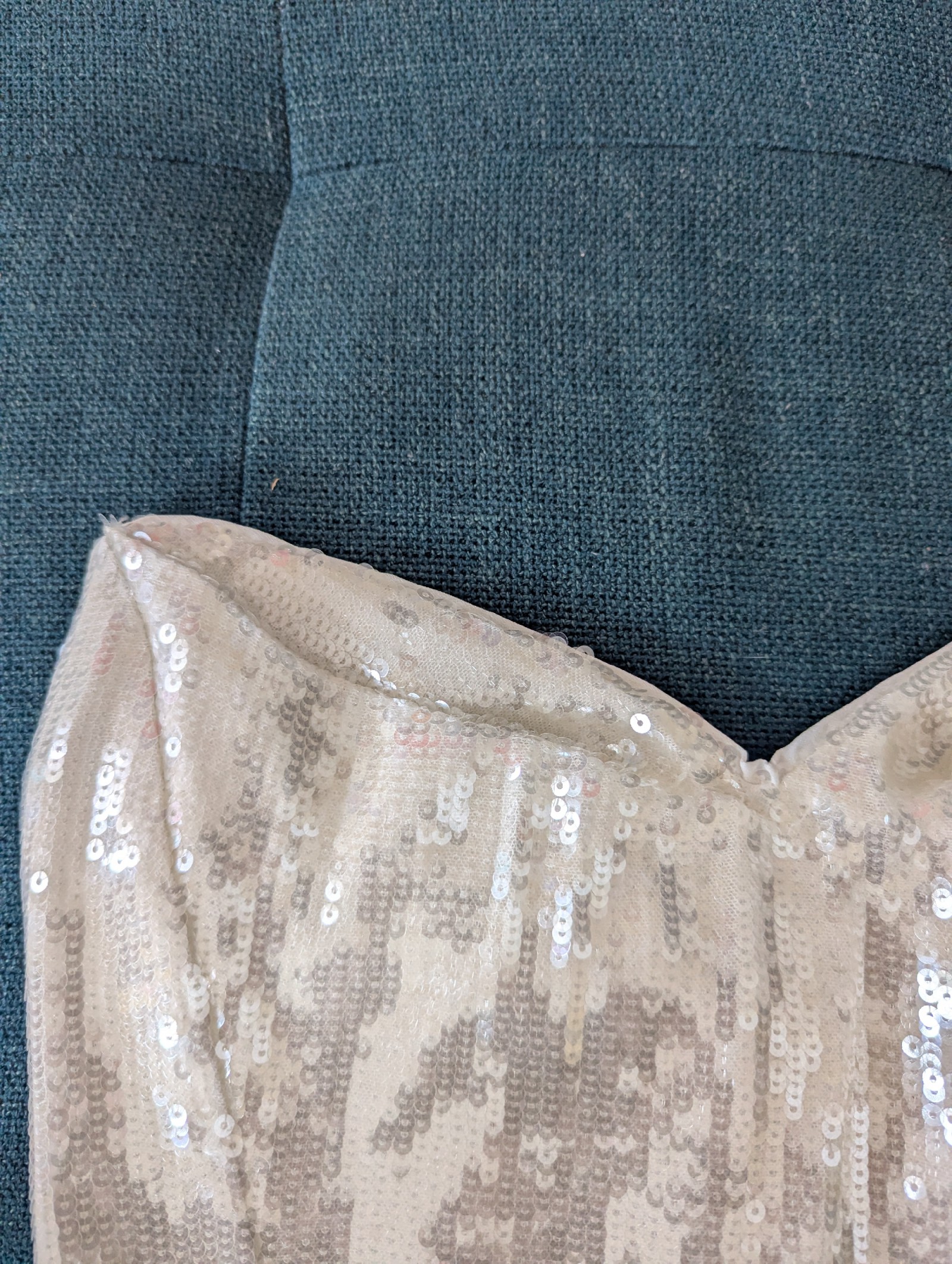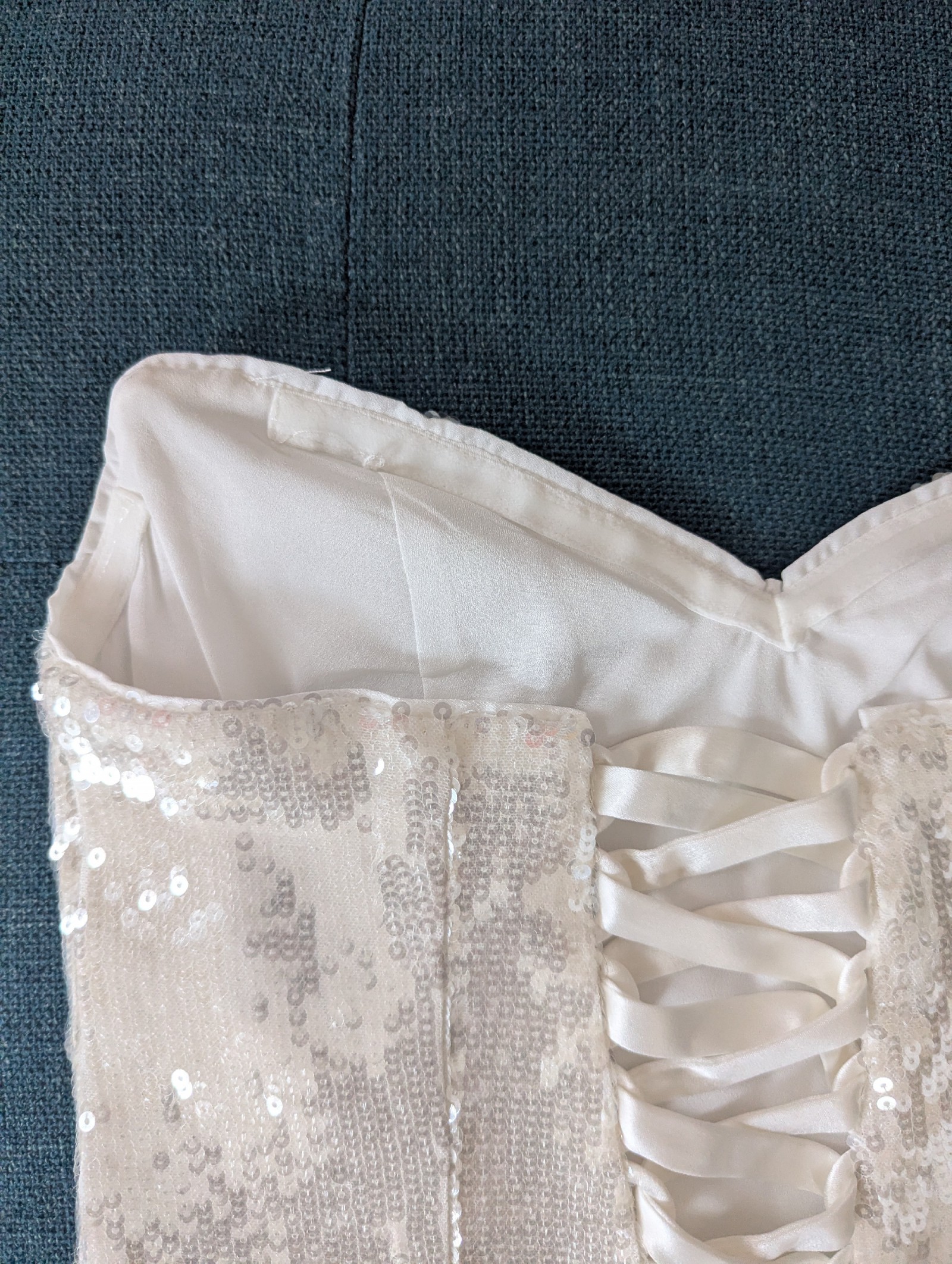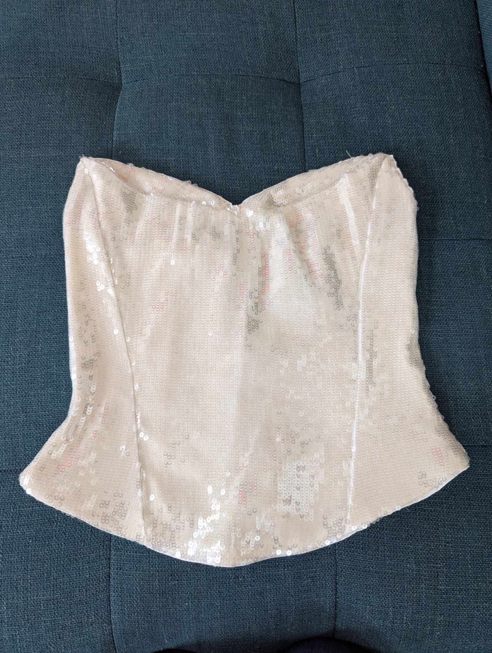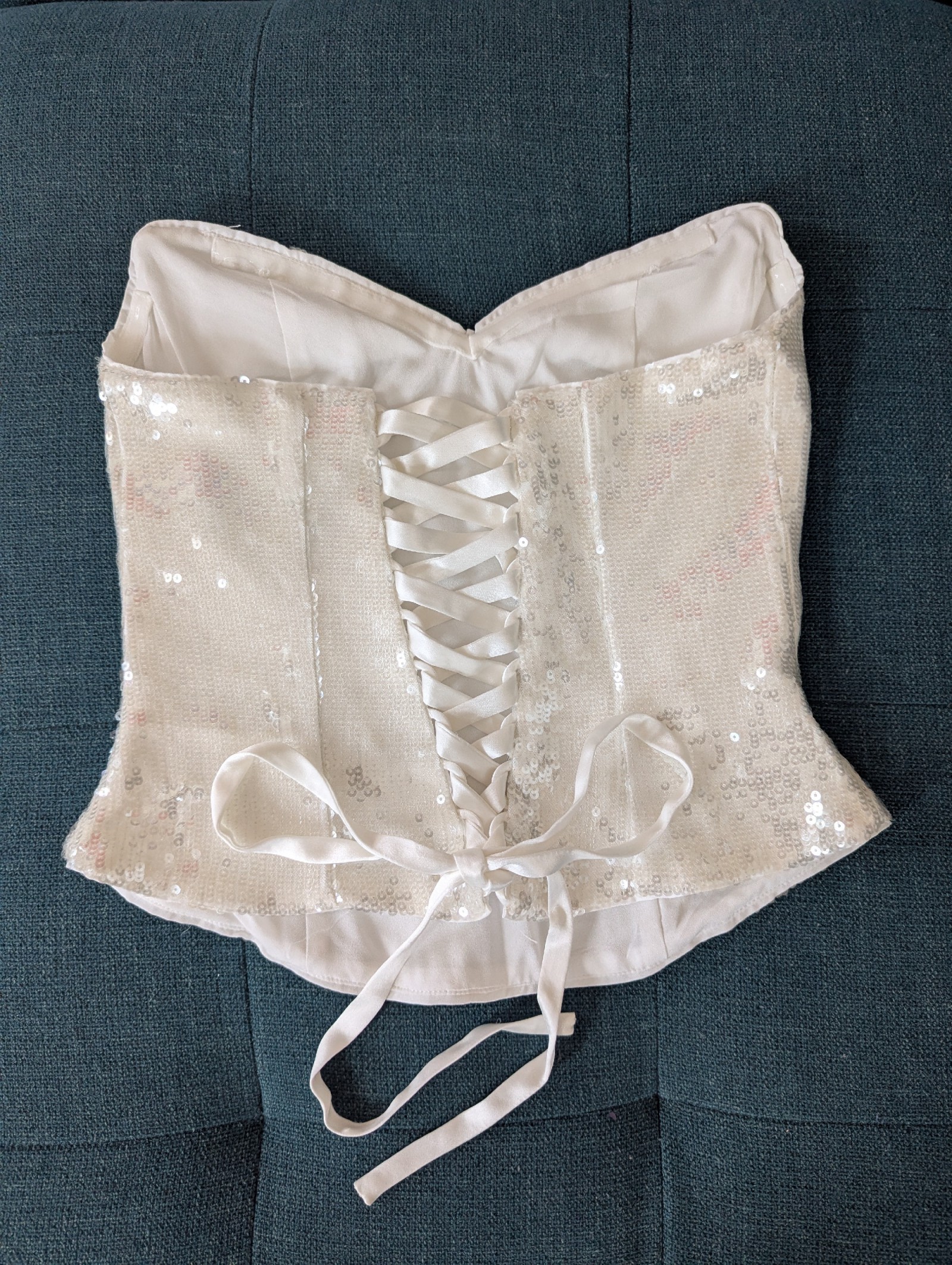 Sequin corset with a sweetheart neckline and satin tie. Only worn to try on once or twice, but decided to wear something else that was more my style. Corset has been stored flat (not on a hanger) in a smoke free home. Please DM me if you'd like any measurements or have any questions!