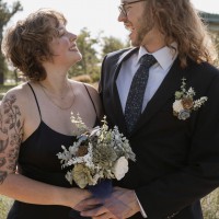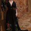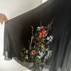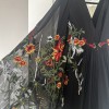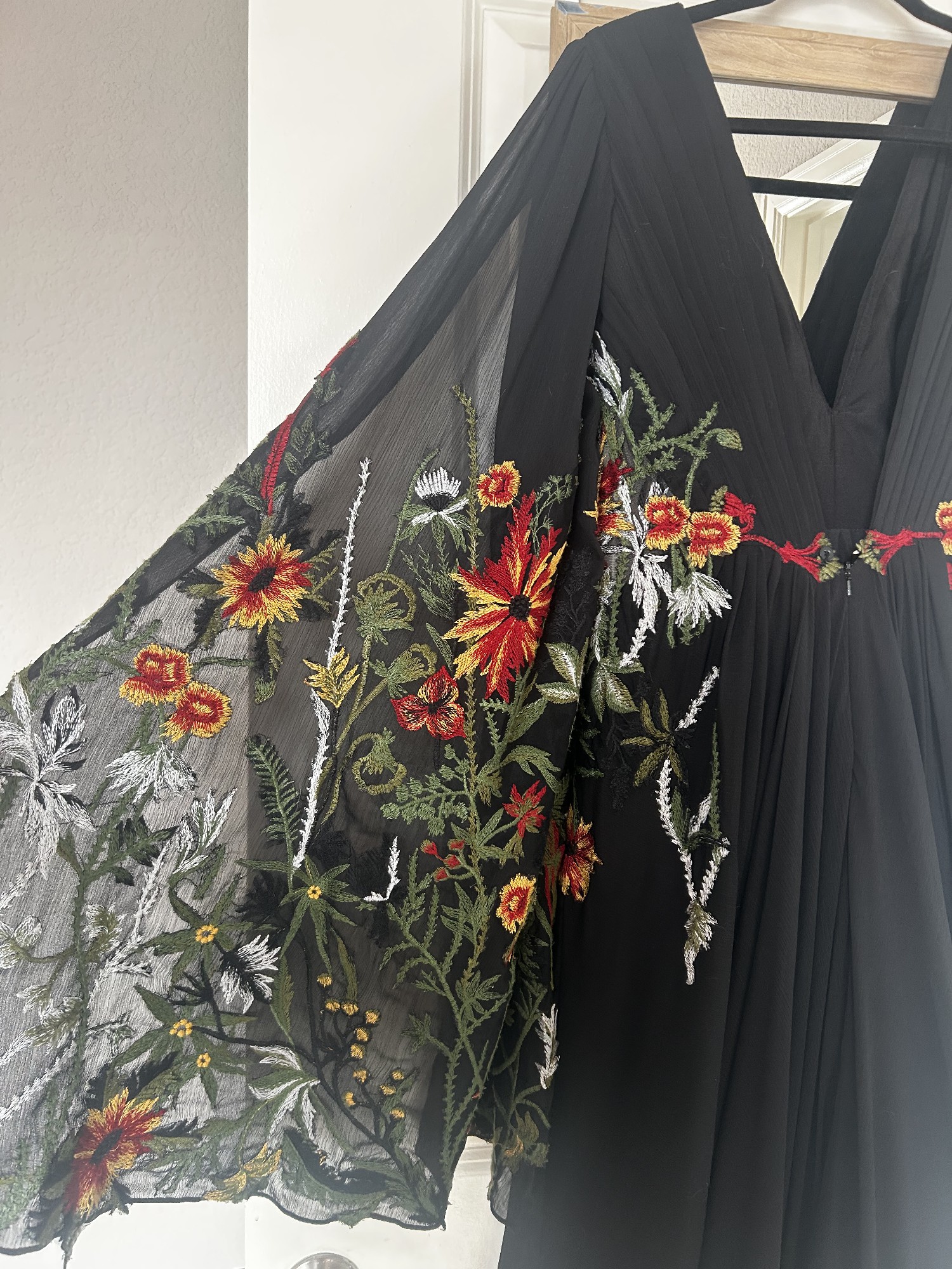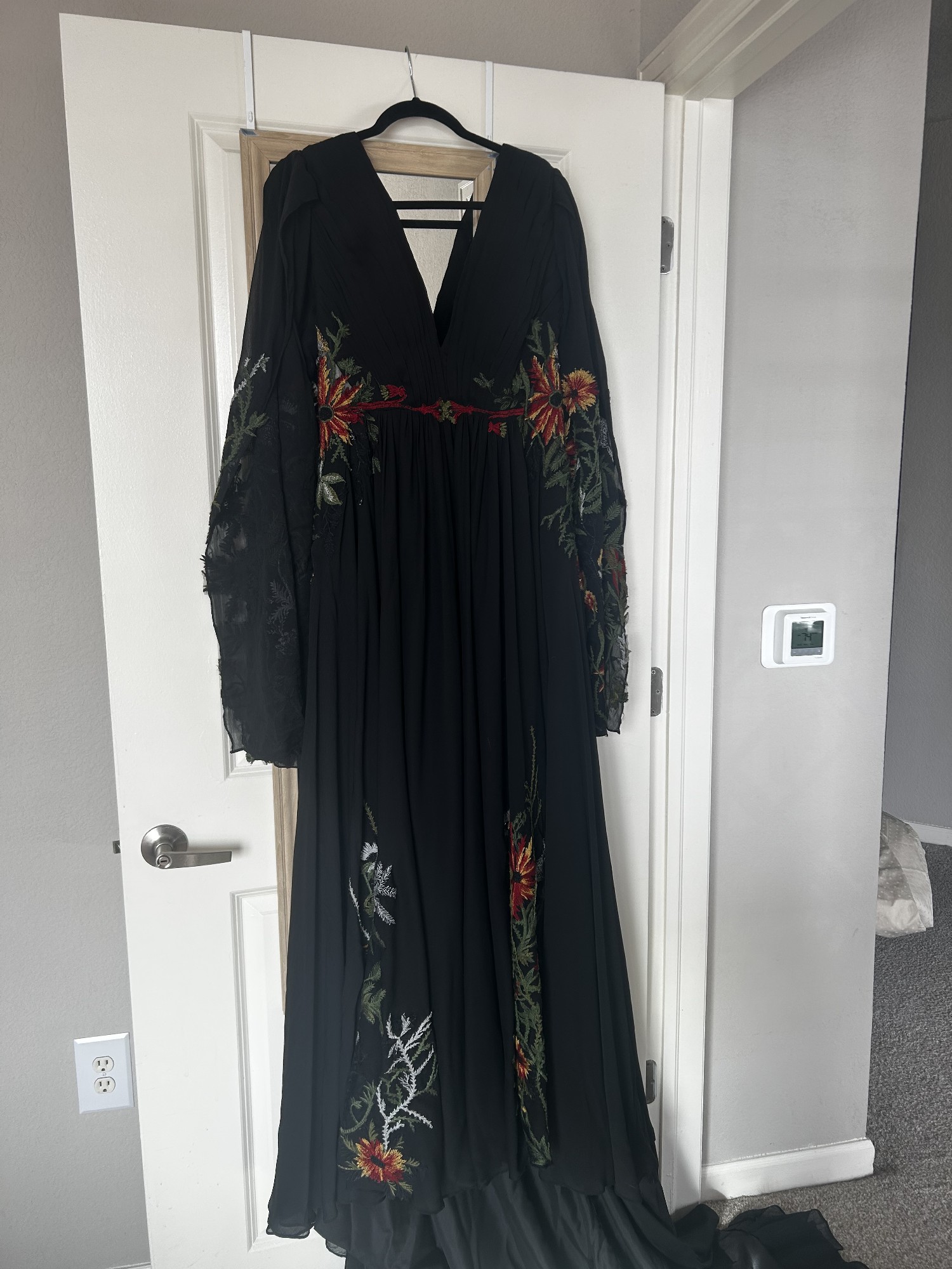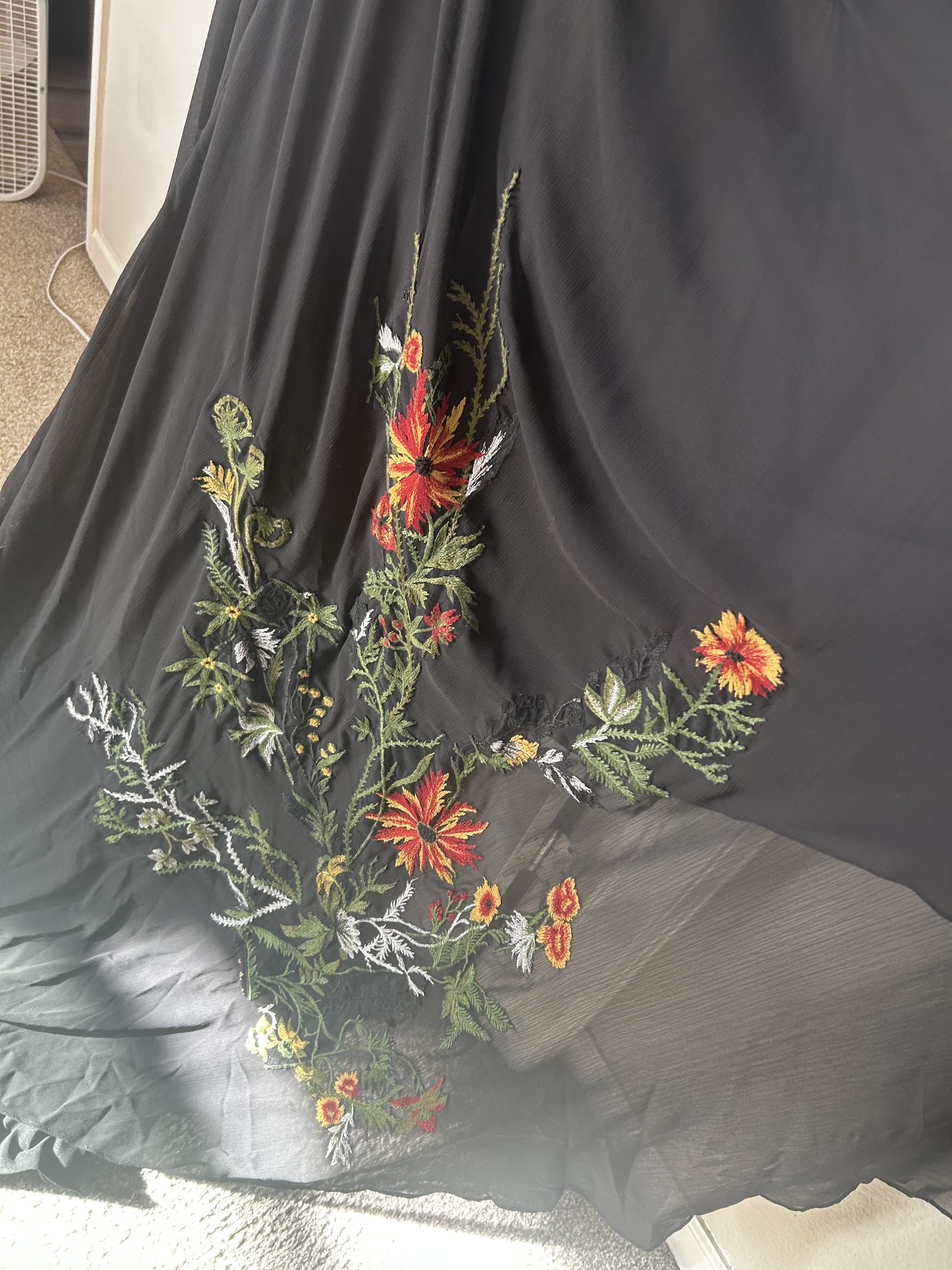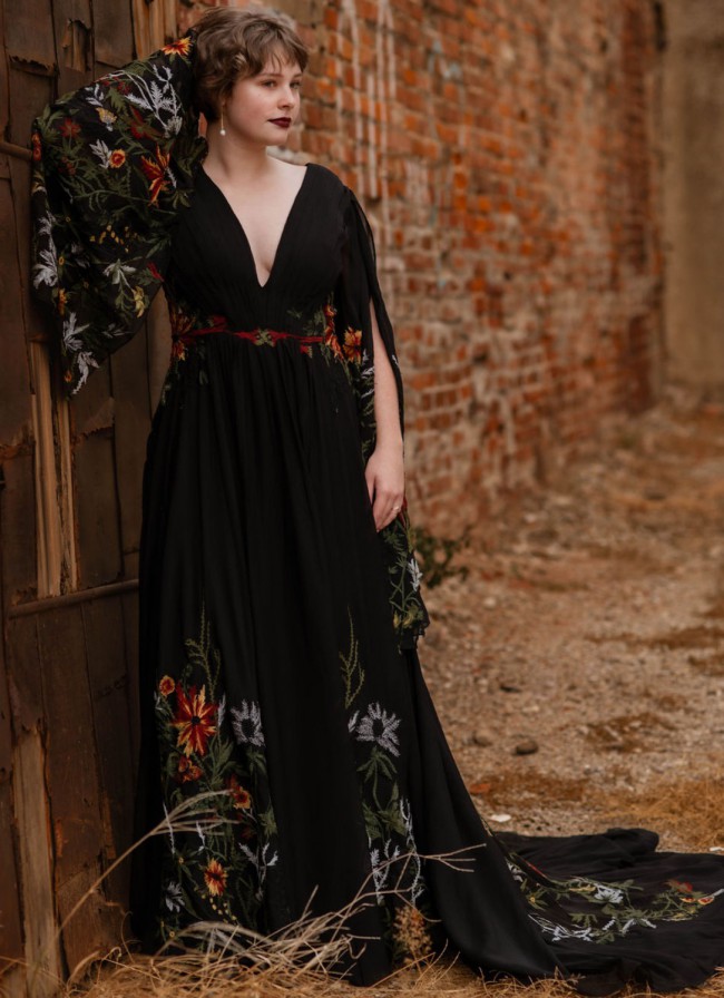 The back features a daring V design, creating a dramatic yet classy look. Crafted from crepe fabric, this dress is not only comfortable but flows beautifully. What truly makes this gown stand out is the orange and red floral vine embroidery, perfect for a fall wedding.
