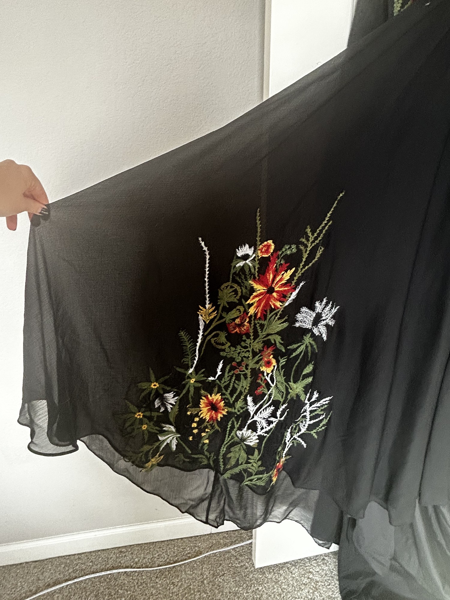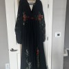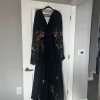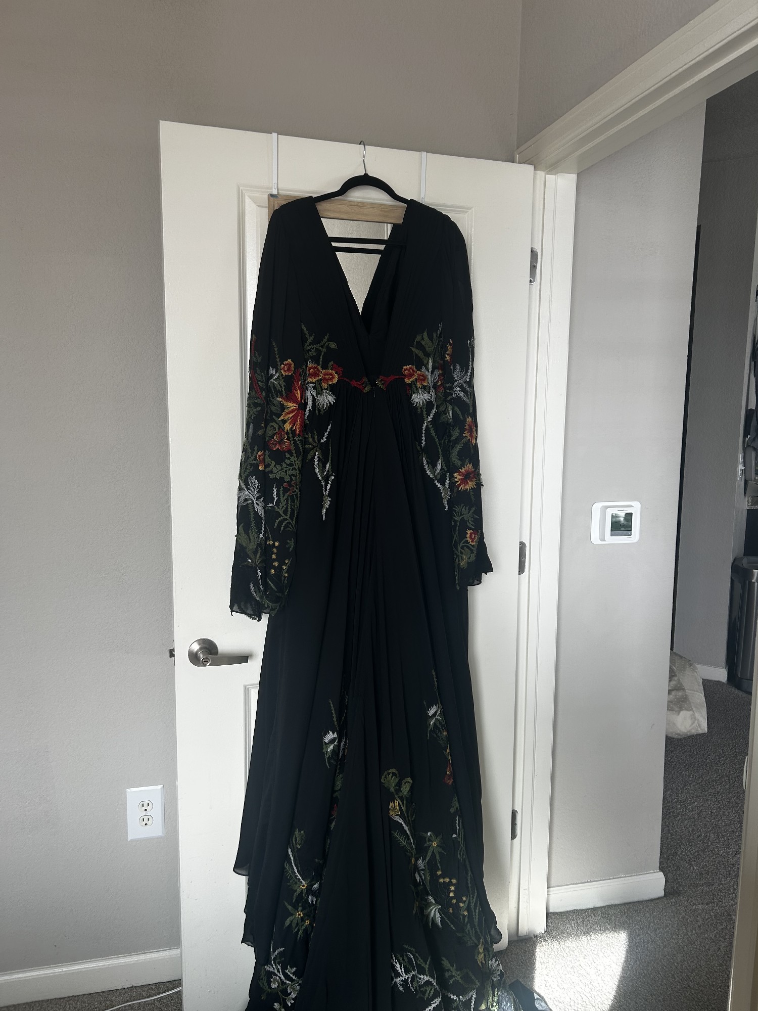 Inspired by the Flora and Lane “Meadow”, this stunning black custom gown is a reflection of elegance and style that I am excited to share with someone special. The flattering A-line silhouette drapes beautifully, accentuating the waist while flowing gracefully to the floor. The striking V-neckline and sheer side cutouts add a touch of allure, perfectly complemented by long, split sleeves.