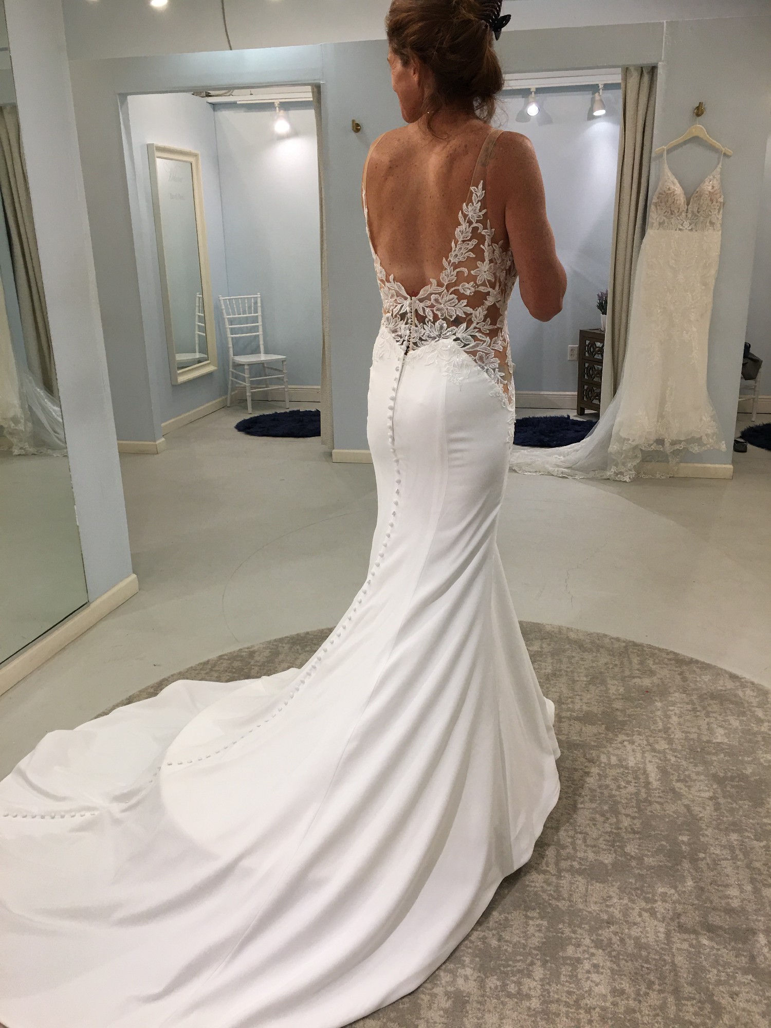 The long traditional train is made of a lightweight knit. Buttons down the length of the train offer and added dimension. This fit and flare style is one not to miss! This dress made me so happy and will make you feel beautiful!