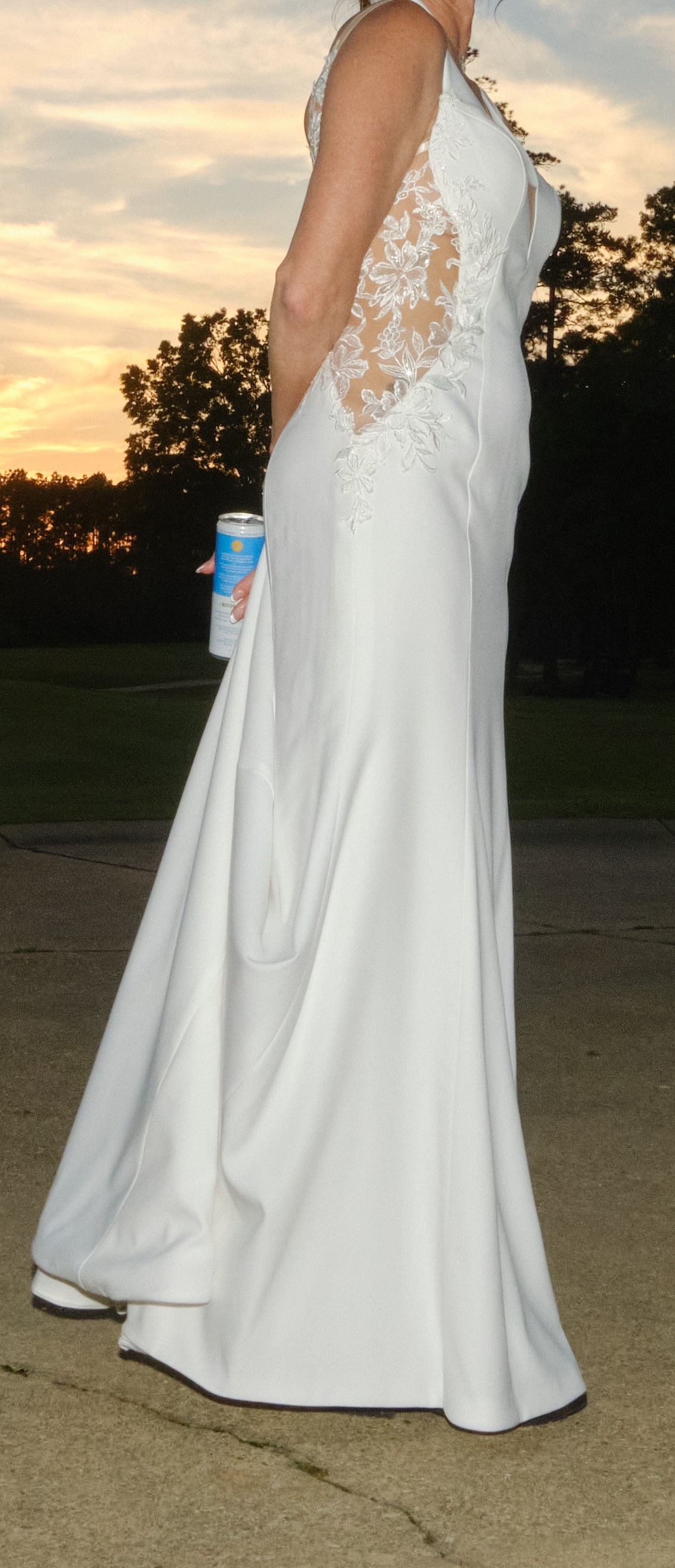 Elegant and timeless, this open back and daring side lace enhances a sleek design that is exceptionally slimming. It hugs the figure and incorporates a plunging V Neck line.