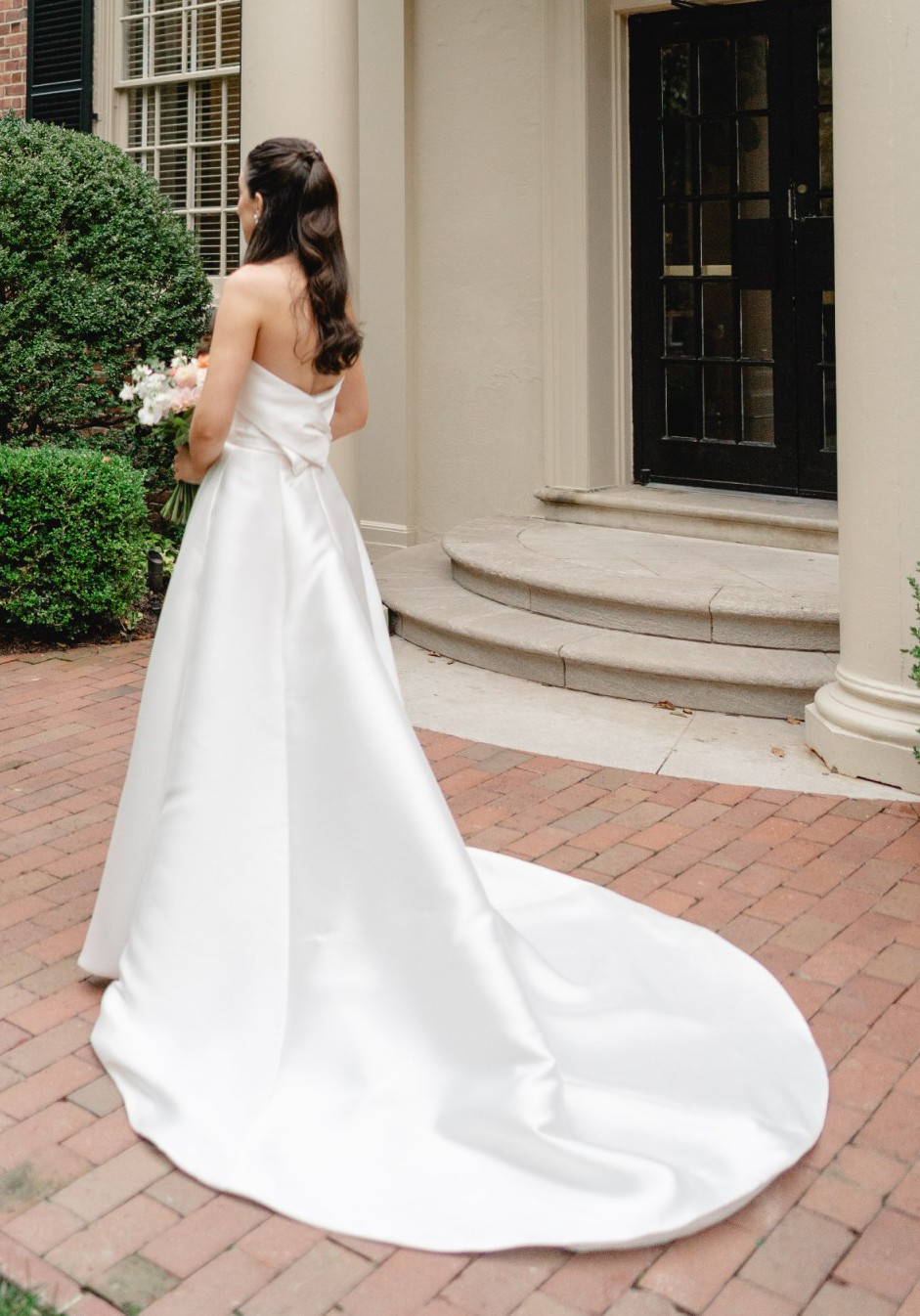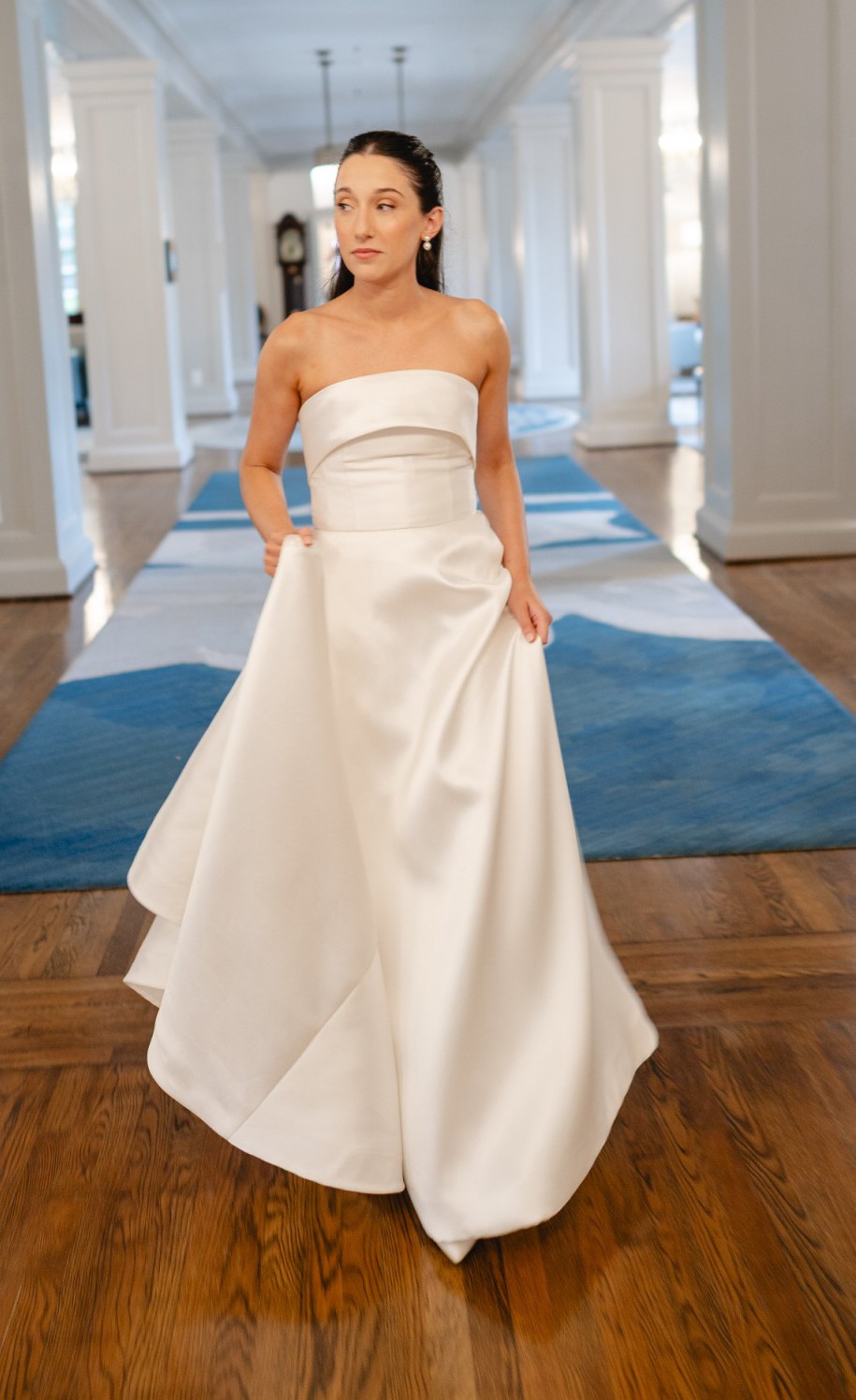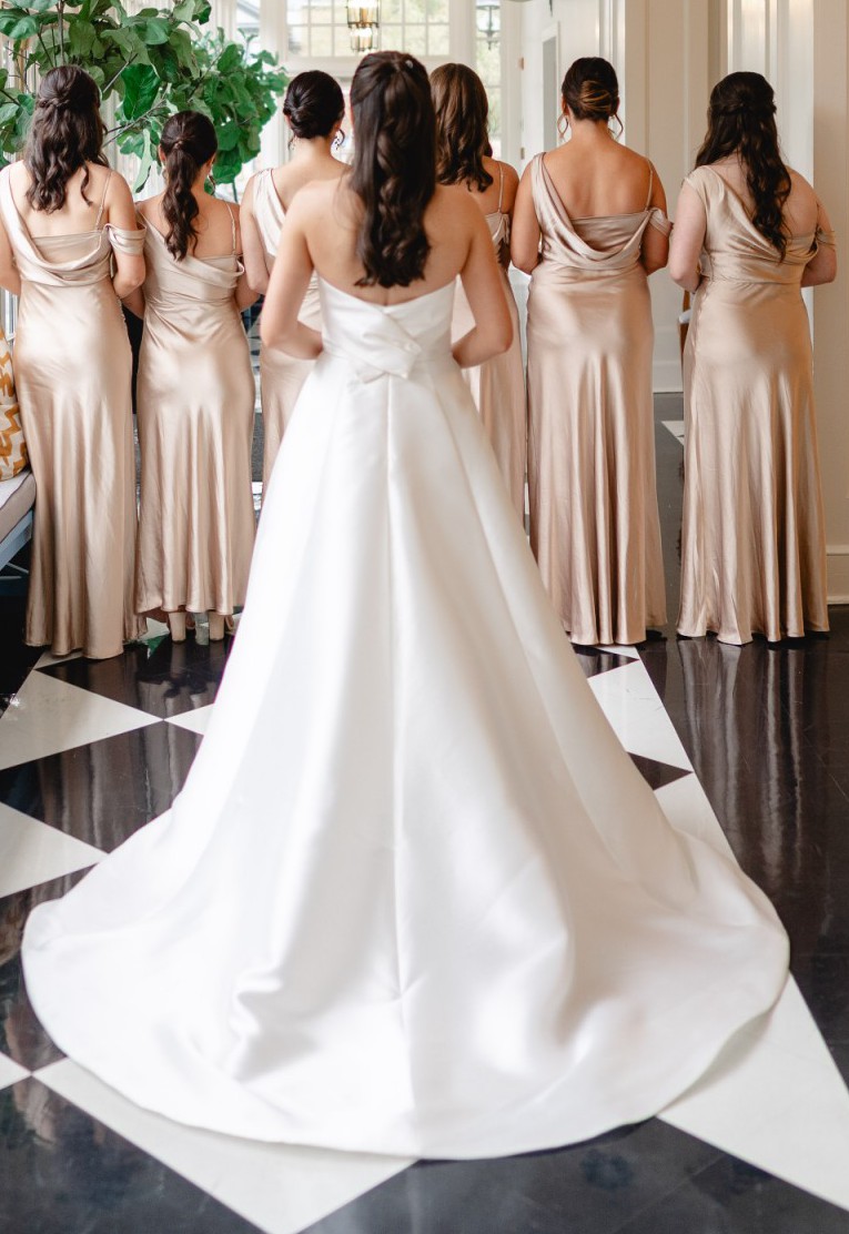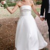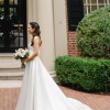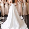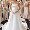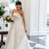 Mikado strapless A-line ballgown with band on neckline, back bow detail and side seam pockets.