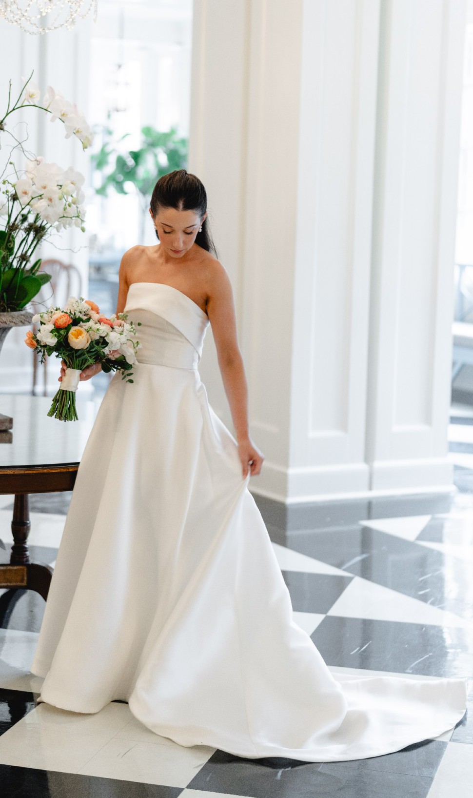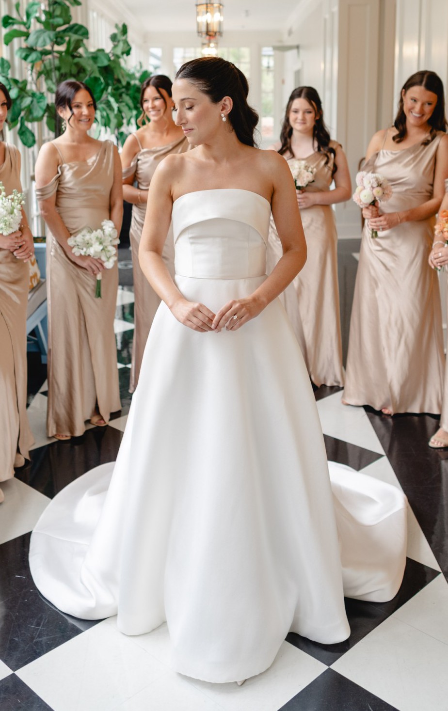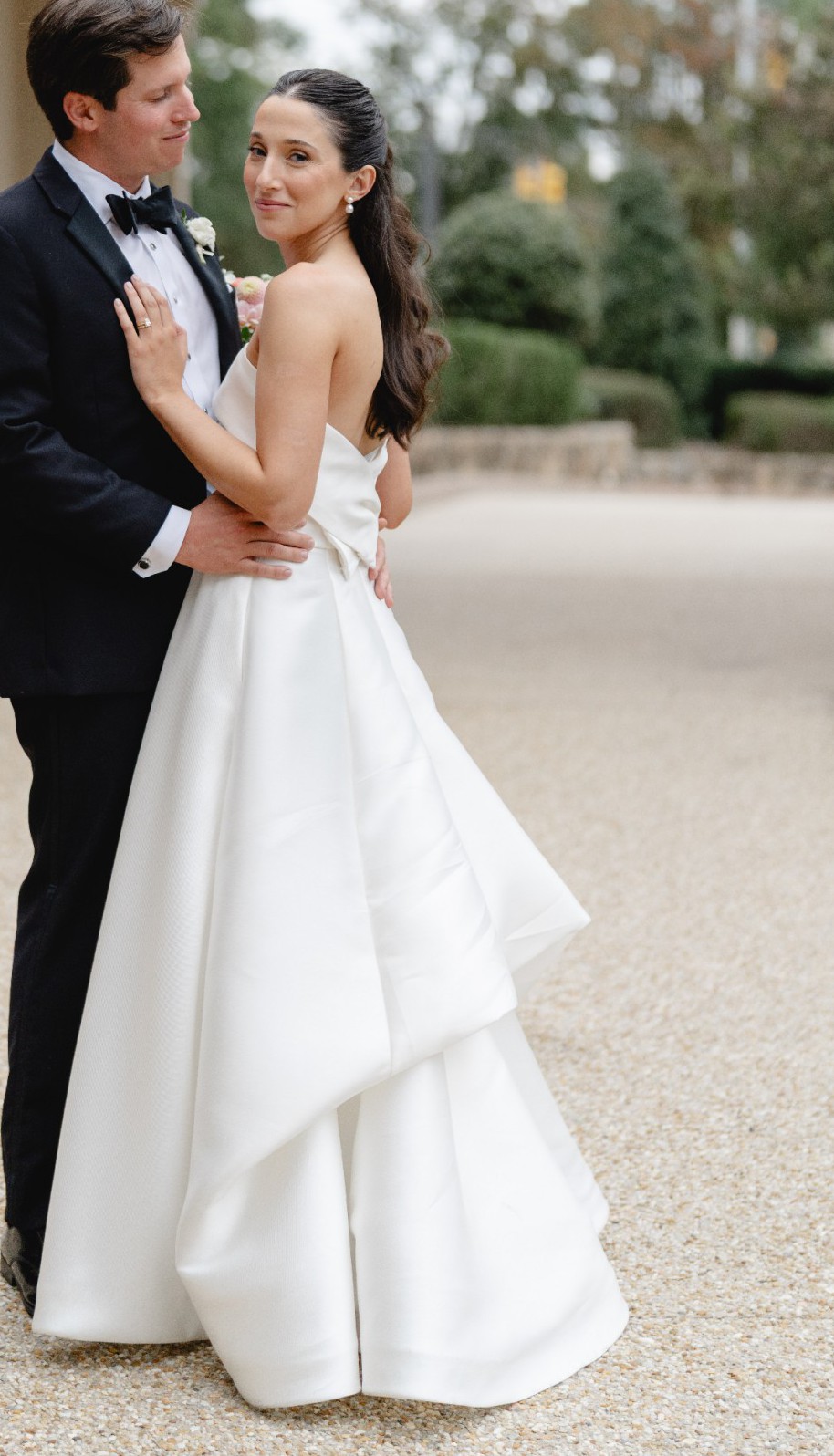 Mikado strapless A-line ballgown with band on neckline, back bow detail and side seam pockets.