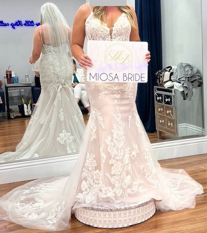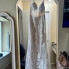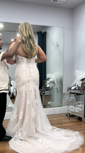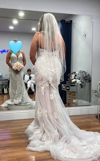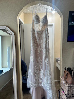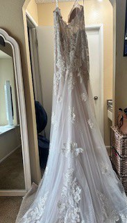 This dress is brand NEW, never worn, and never altered. It's in the original protective bag. Here's the story: I rushed when I chose my dress, I ended up with second thoughts, and couldn't cancel the order! Sol here it is, brand new, still in the bag! I ended up with a different dress; however, I still love it and think it's so special. I just wanted a different look!