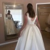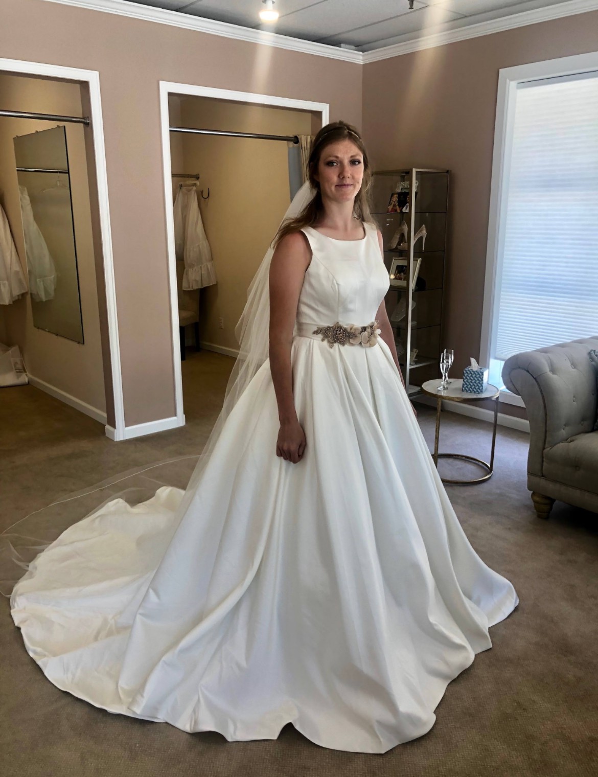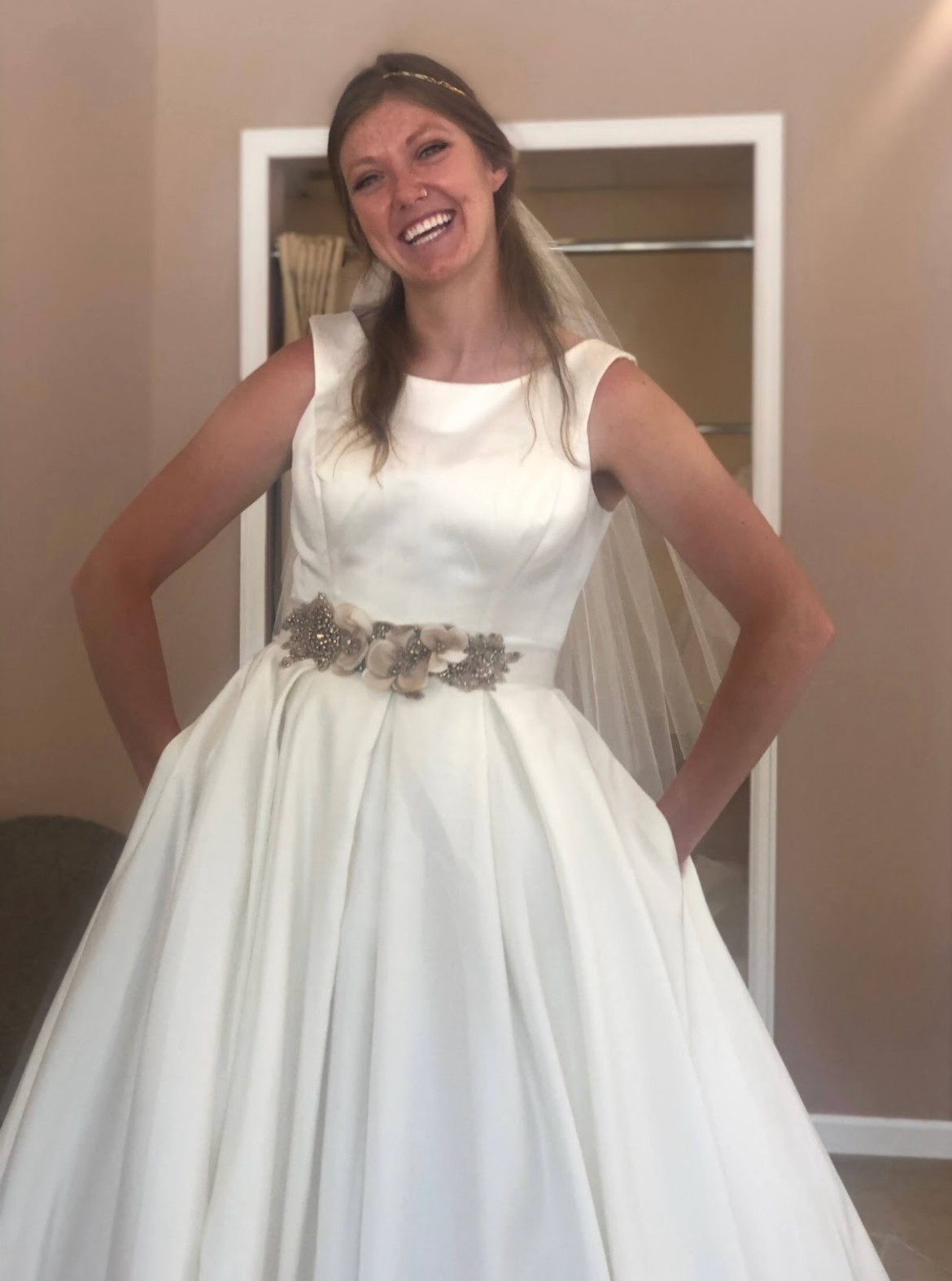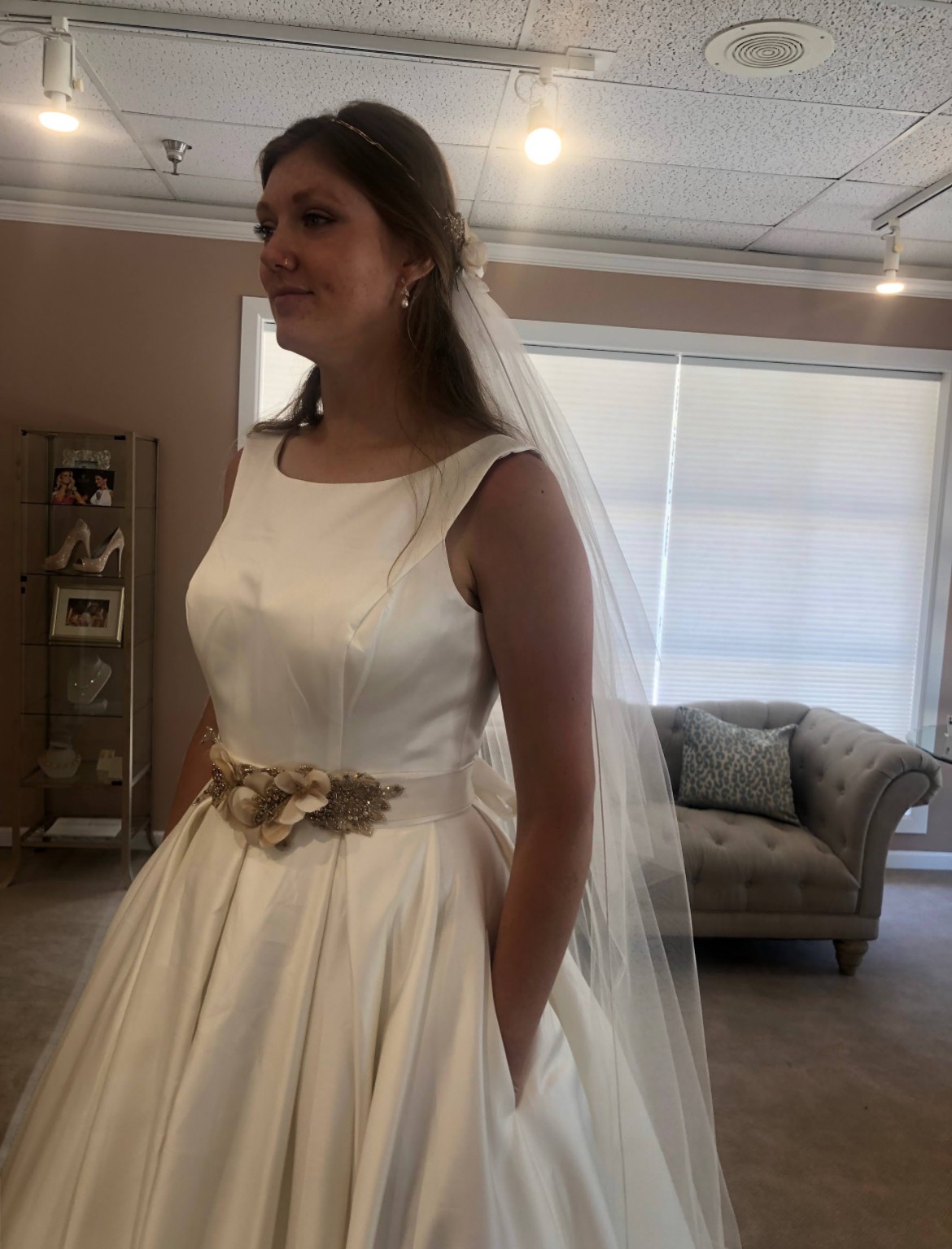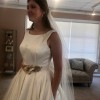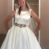 Includes a piece of extra material for belt or alterations. Brand new, never altered. Only worn once for these try-on photos. Photo of size chart is specifically for Kathryn Elizabeth dresses. Flower belt in photos is lying on top of another belt of same fabric as dress. Neither belt is attached to dress. Fabric belt included, flower belt/headpiece not included. Would consider selling for additional cost.