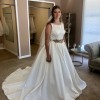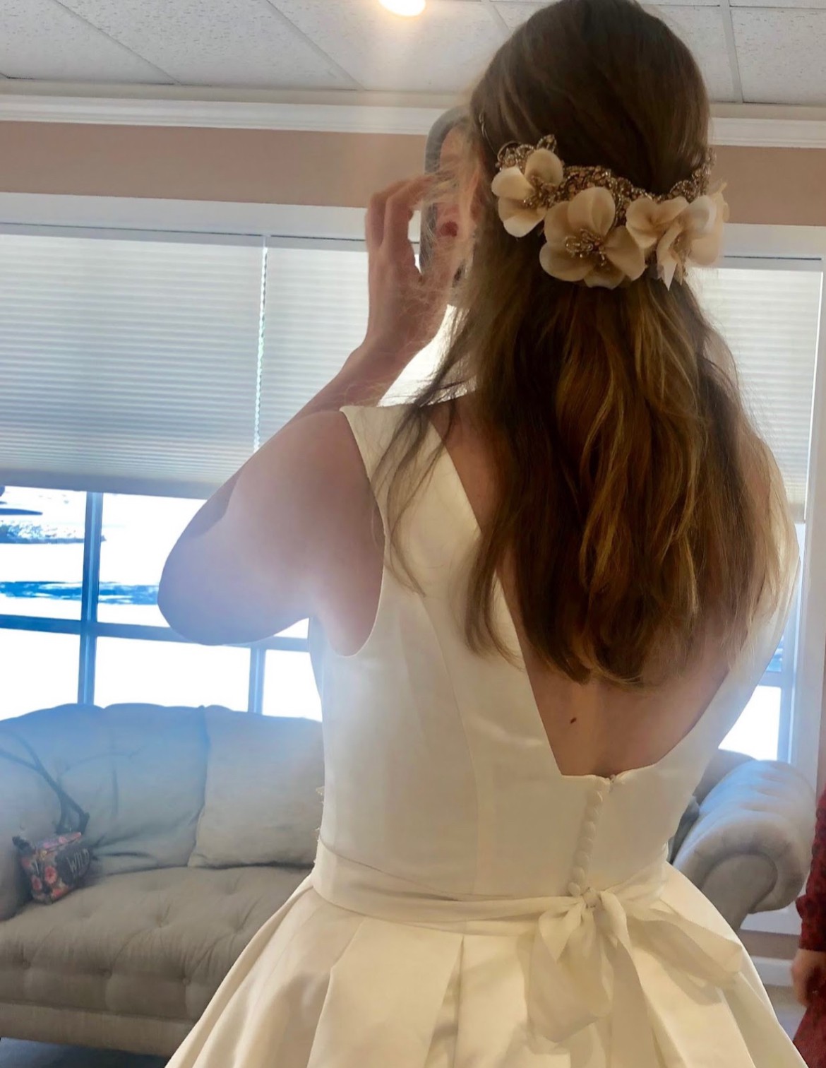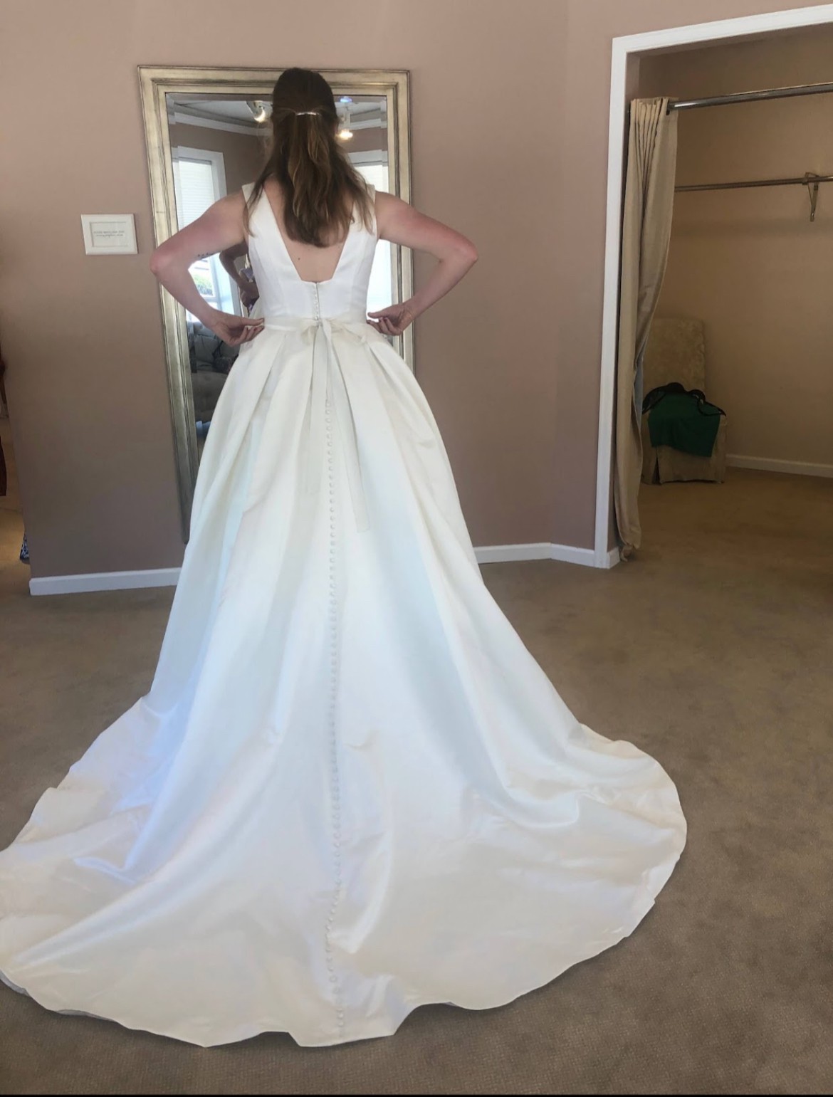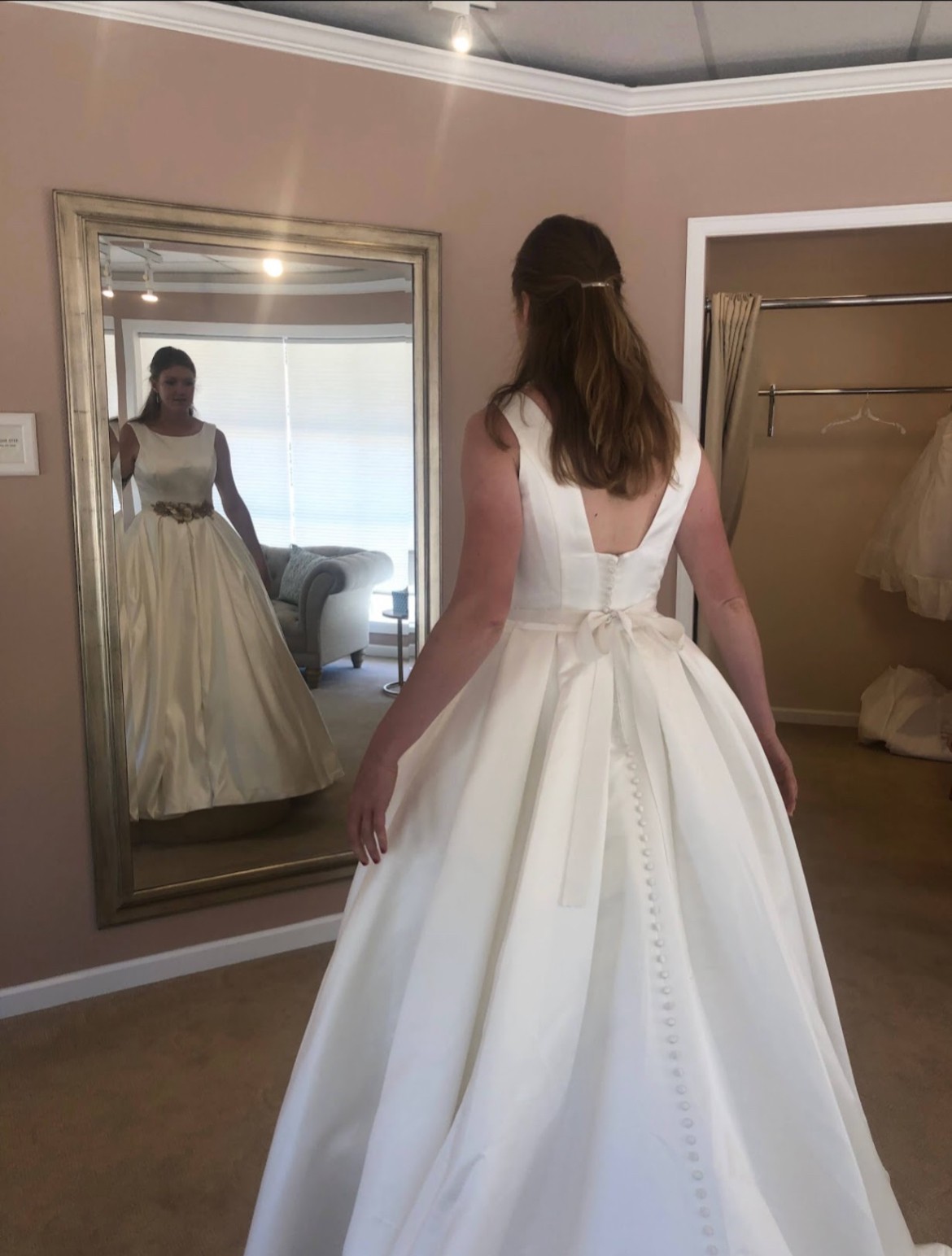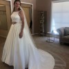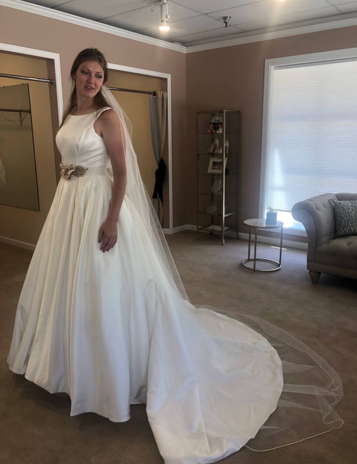 Includes a piece of extra material for belt or alterations. Brand new, never altered. Only worn once for these try-on photos. Photo of size chart is specifically for Kathryn Elizabeth dresses. Flower belt in photos is lying on top of another belt of same fabric as dress. Neither belt is attached to dress. Fabric belt included, flower belt/headpiece not included. Would consider selling for additional cost.