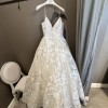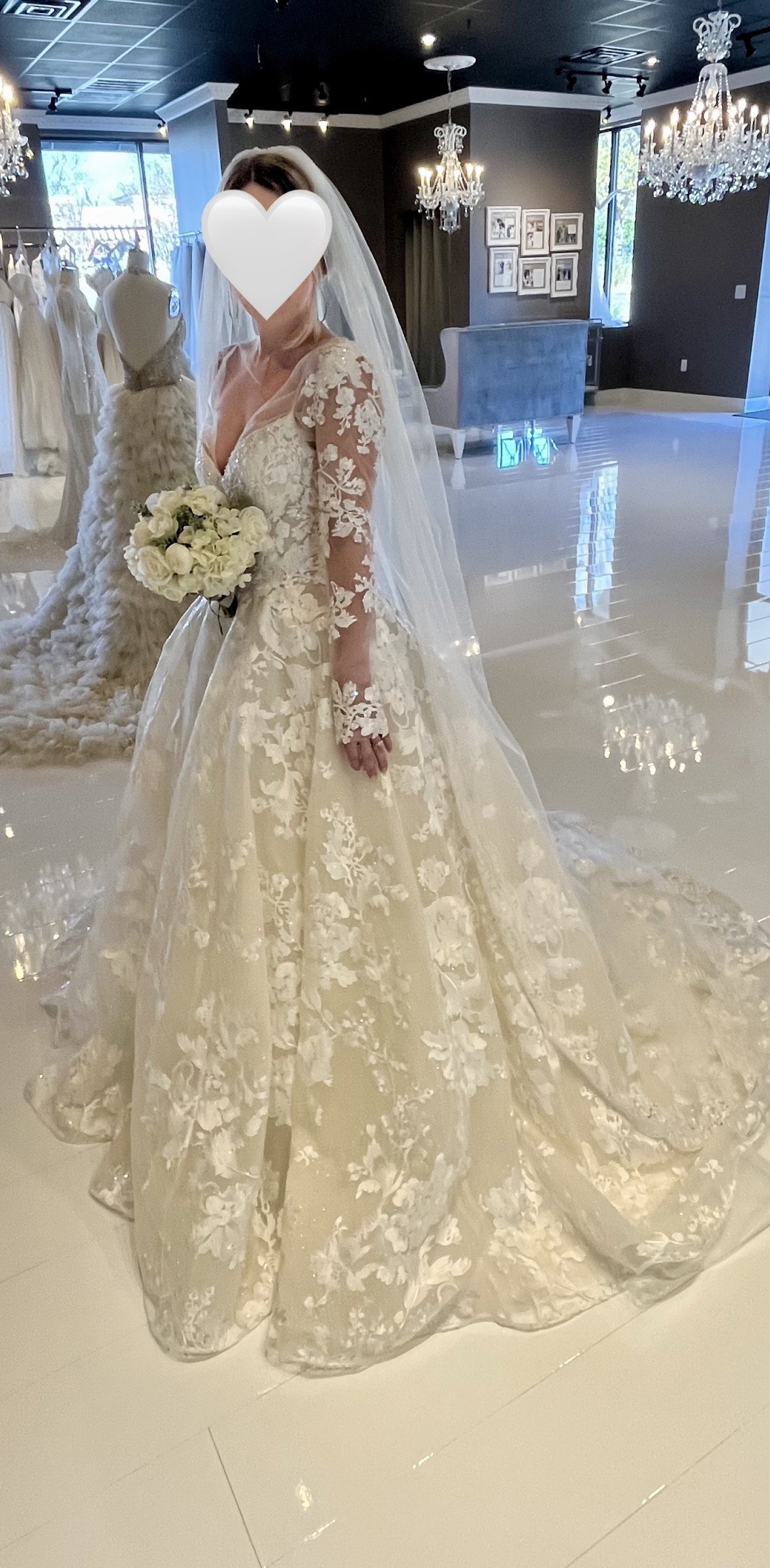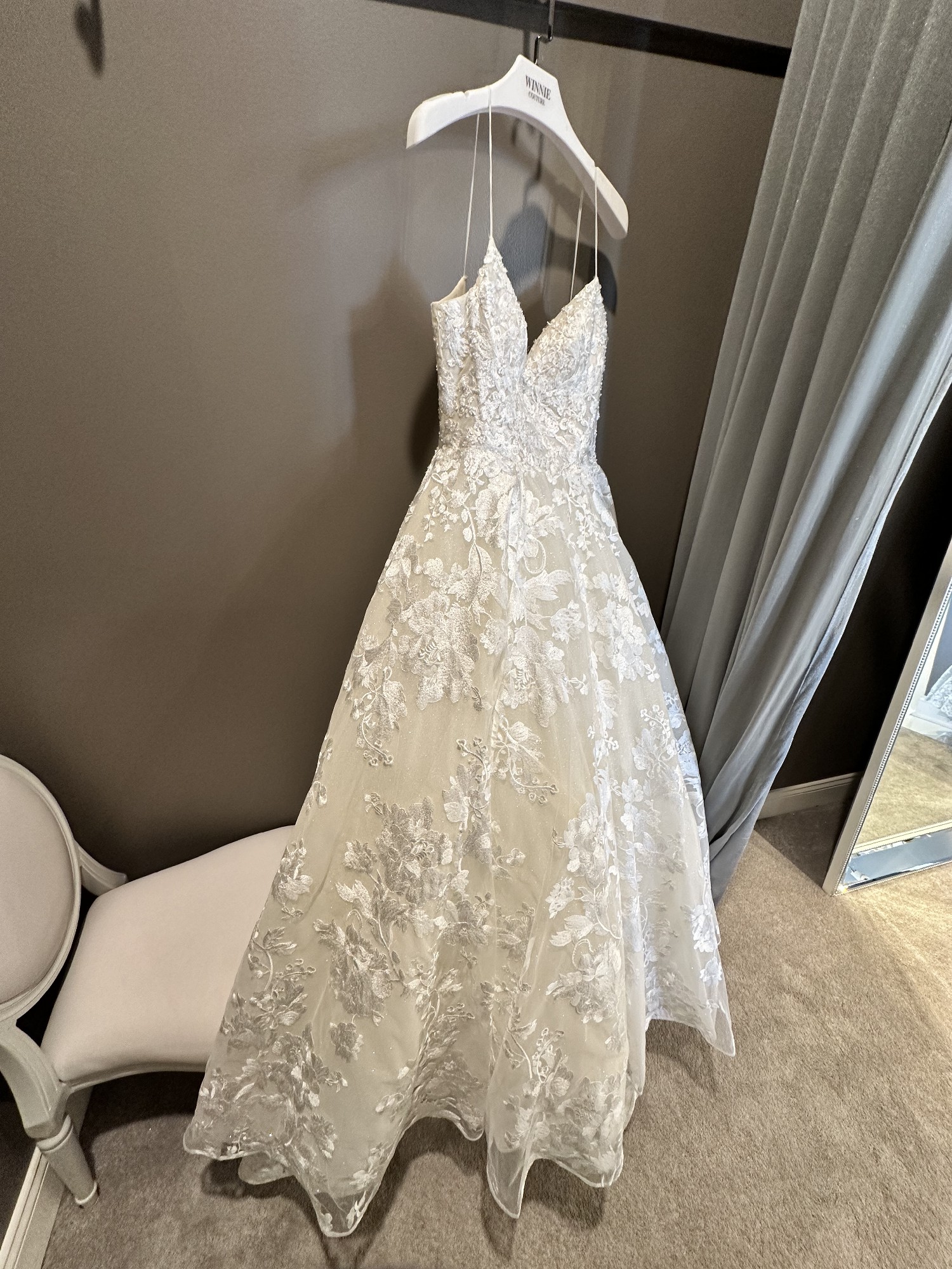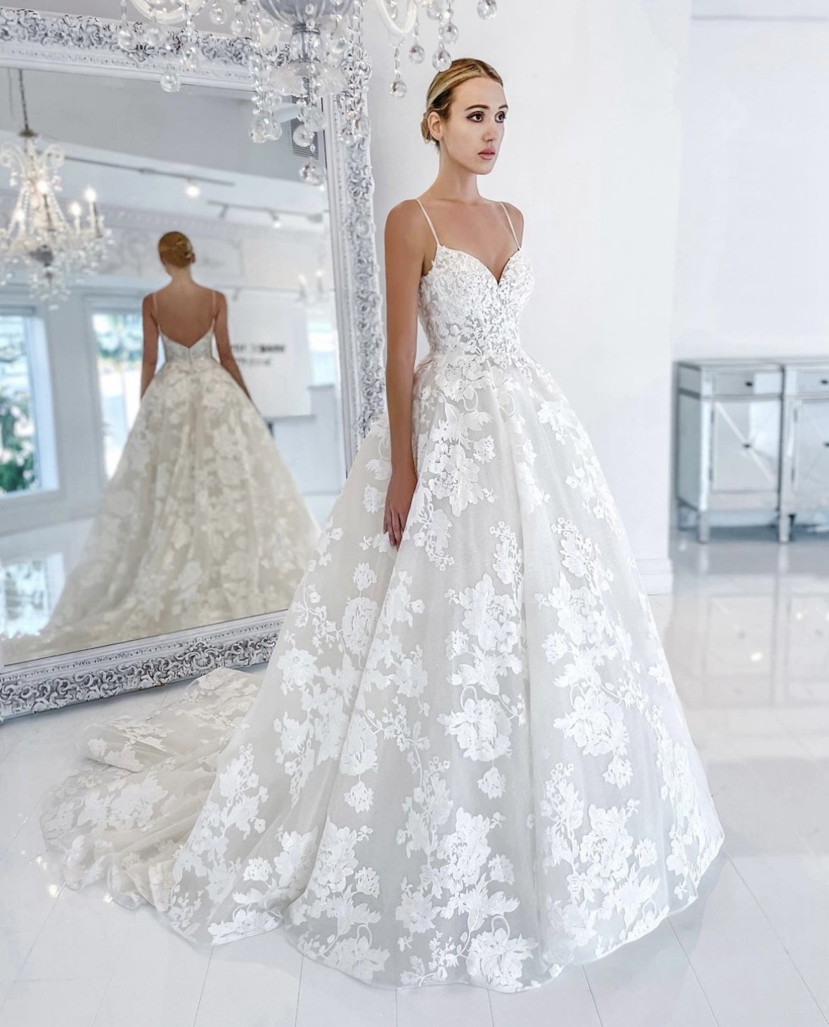 ‘The 3507 Iselin is a classic ball gown with a modern twist. It features a soft v-neckline with delicate tulle straps, a fitted bodice, and a voluminous skirt with layers of glitter tulle and embroidery. The gown’s bodice is beautifully designed with delicate beading and lace that gives it a touch of glamour and sophistication. The skirt has layers of tulle that create a breathtaking effect as the bride walks down the aisle.