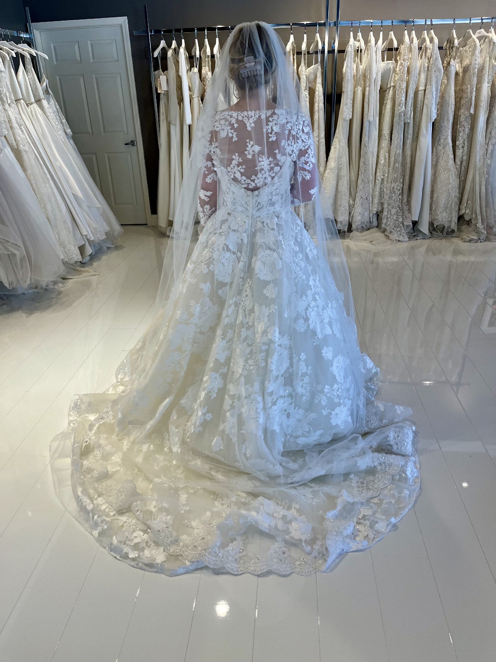 One of the standout features of the 3507 Iselin is the detachable long sleeve bolero. The sleeves are made of delicate tulle and feature lace appliqués that match the bodice. They give the bride the option to have a classic spaghetti strap look or add a touch of drama to her gown. This is the perfect way to change your look from ceremony to reception without removing the dress of your dreams!’
