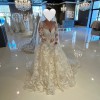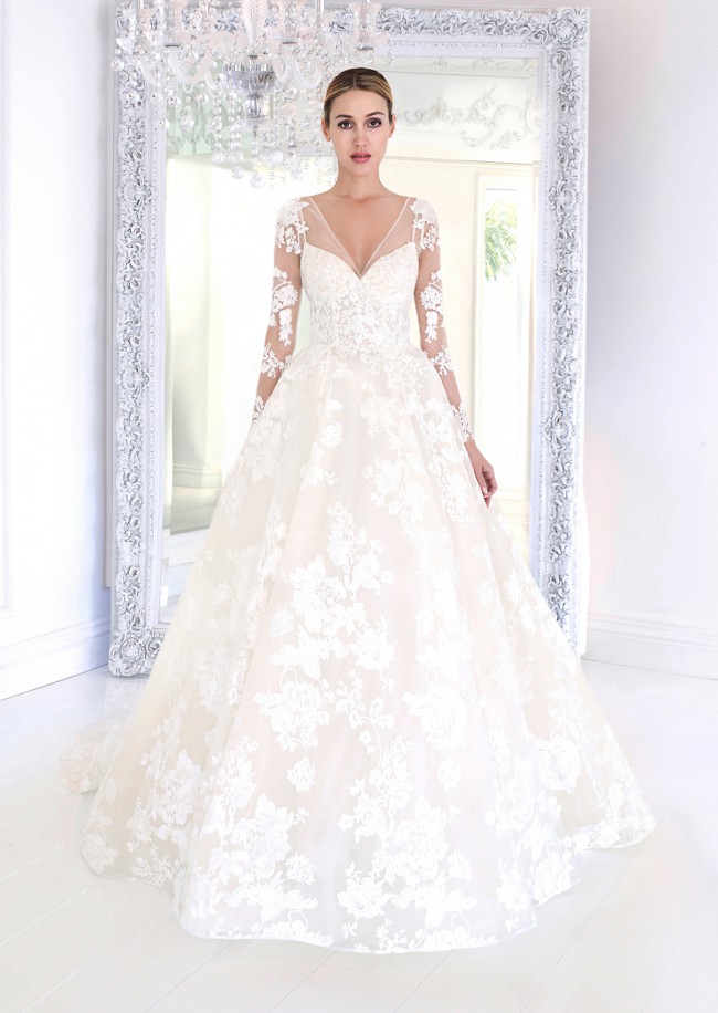 Winnie Couture description: “Iselin 3507 : Enchanting ball gown style with a statement lace motif and delicate shimmer. Complete with a detachable lace bolero.”
