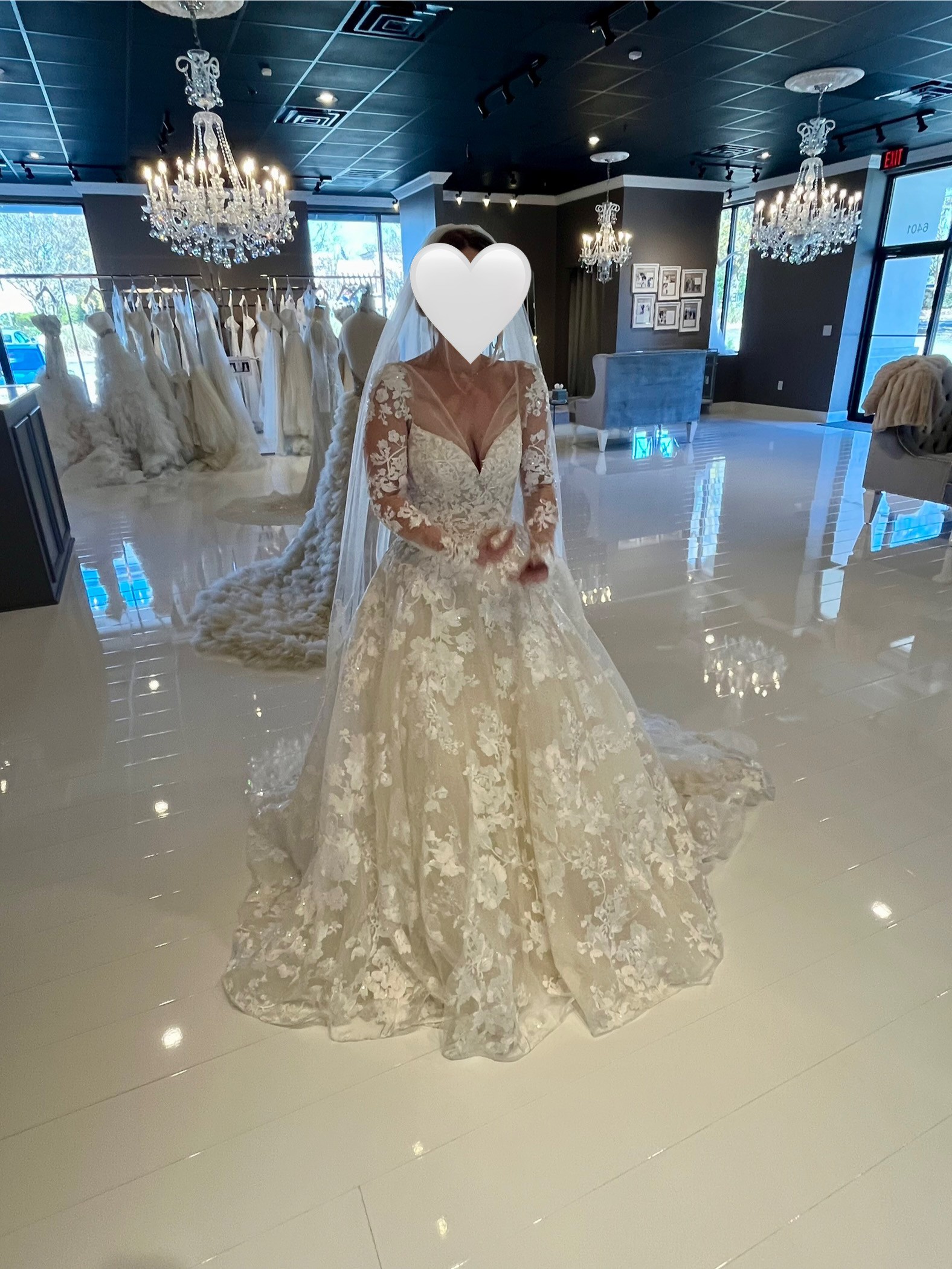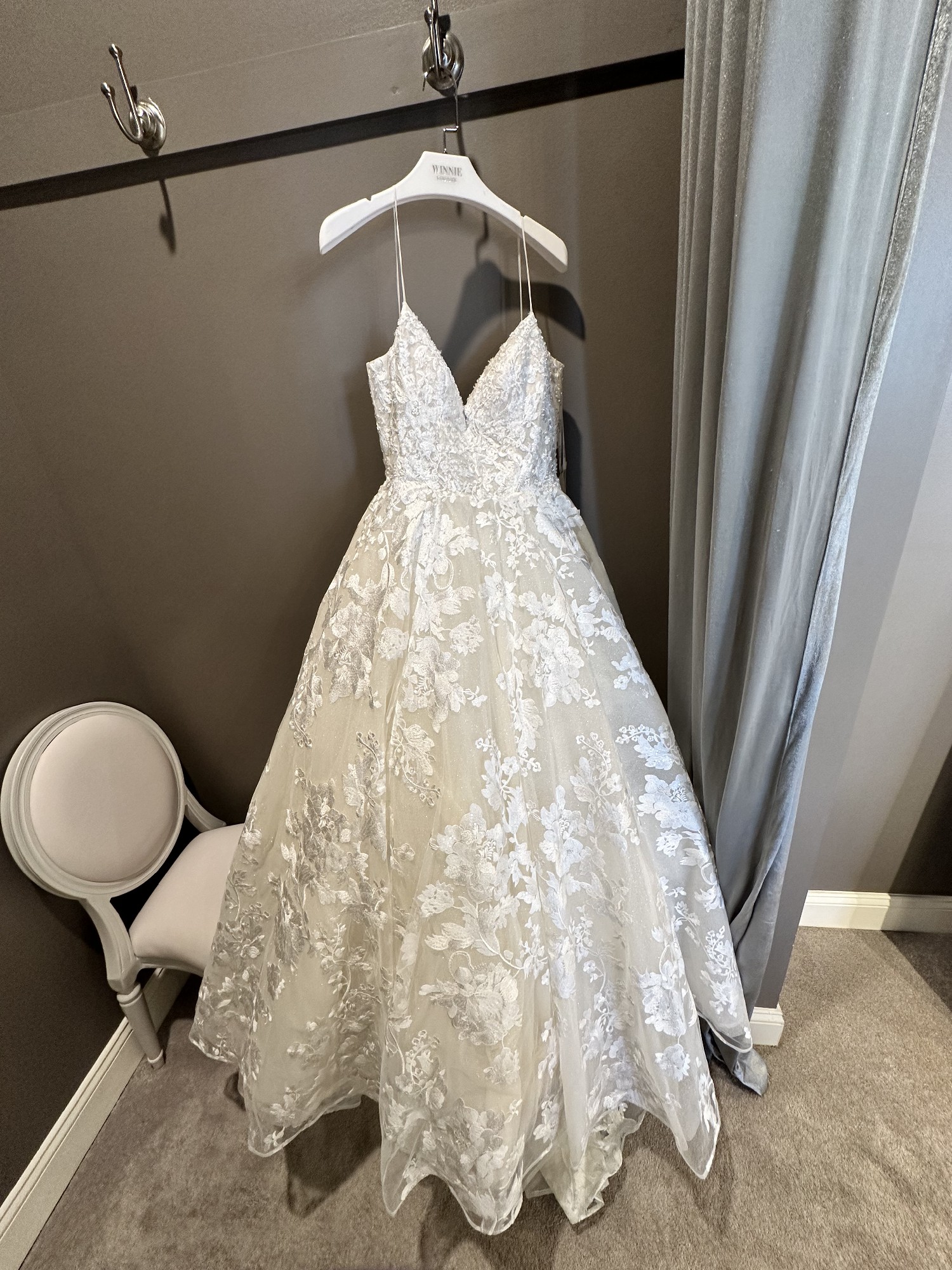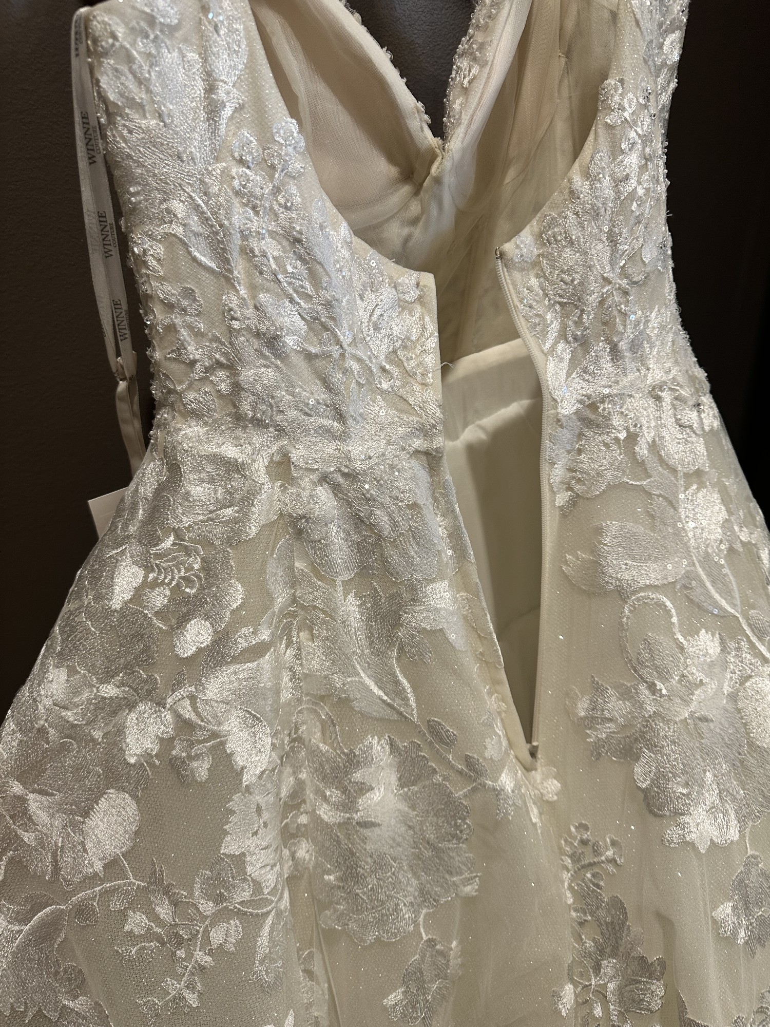 Never worn. Has not been altered. Still in original Winnie Couture bag. Absolutely gorgeous gown. The main dress has very thin spaghetti straps and is designed to go on top of a sheer, beaded, embroidered long-sleeve bolero underneath (snaps into main dress, creating a deep V, but still conservative!). It can be worth with or without the bolero. The skirt is full, not too sparkly, small train. Back is pictured.