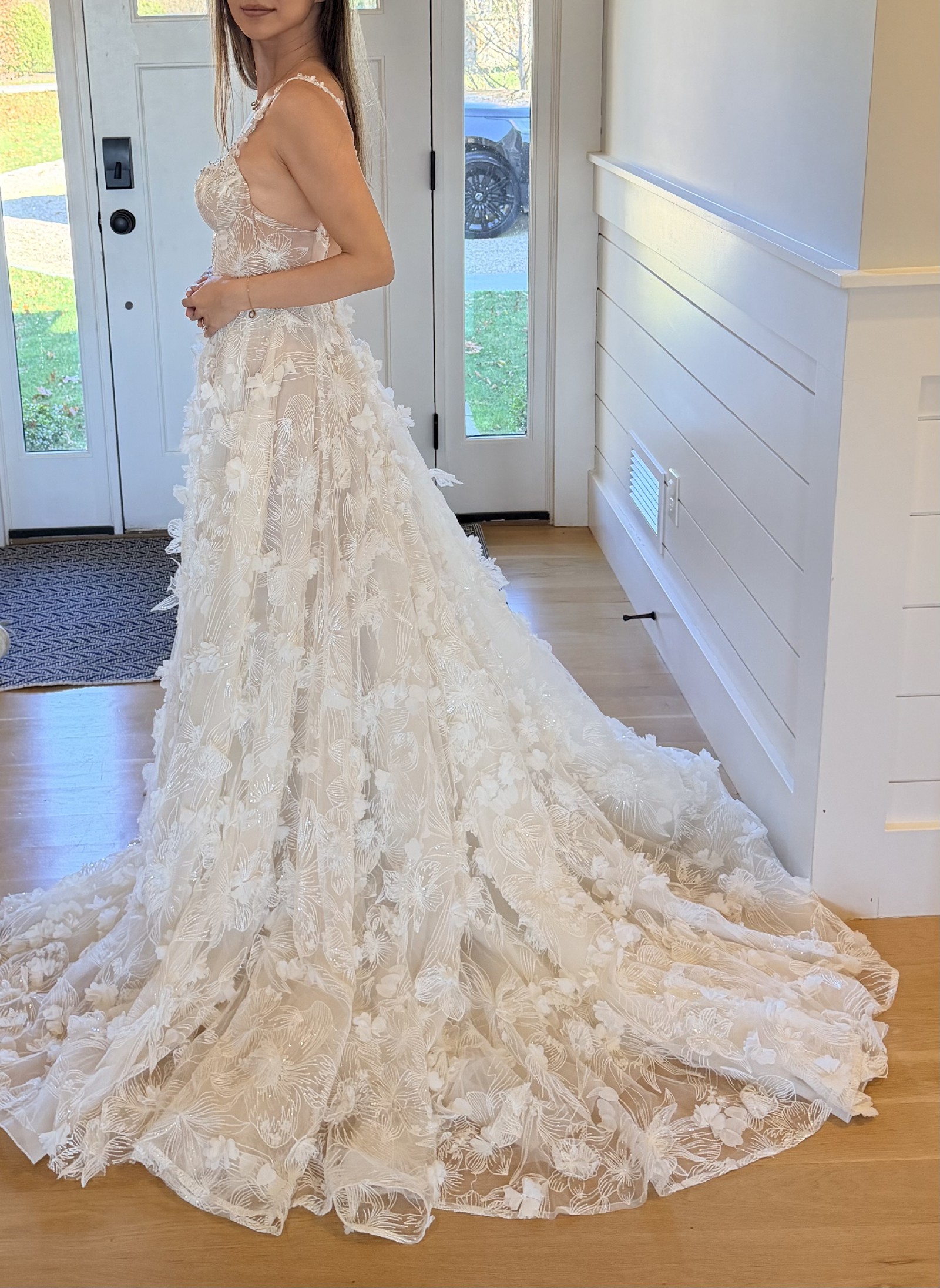 Unfortunately after I purchased the dress we decided to forgo a traditional wedding ceremony in favor of a civil one so ultimately I never wore the dress, and never had it altered in any way. The prior bride mentioned she had the front hemmed slightly and there were cups added to the bust. I am 32-24-35 and 5'5'' without heels. The dress fits perfectly if I wear 3-4 inch heels. I am so sad to let this dress go having never worn it, but am excited for another bride to be able to experience it in all its beauty.