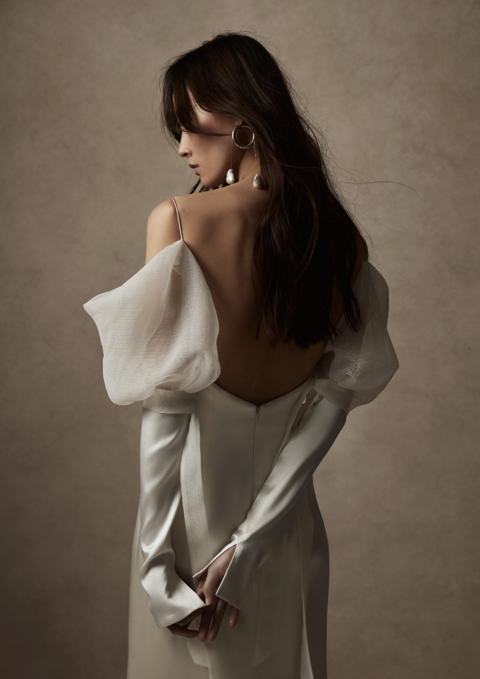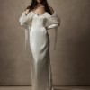 Stunning, minimalist silk gown with an off-the-shoulder neckline and low back accented by delicate spaghetti straps. The sheath silhouette drapes beautifully and moves with effortless elegance — romantic, timeless, and ultra-flattering.