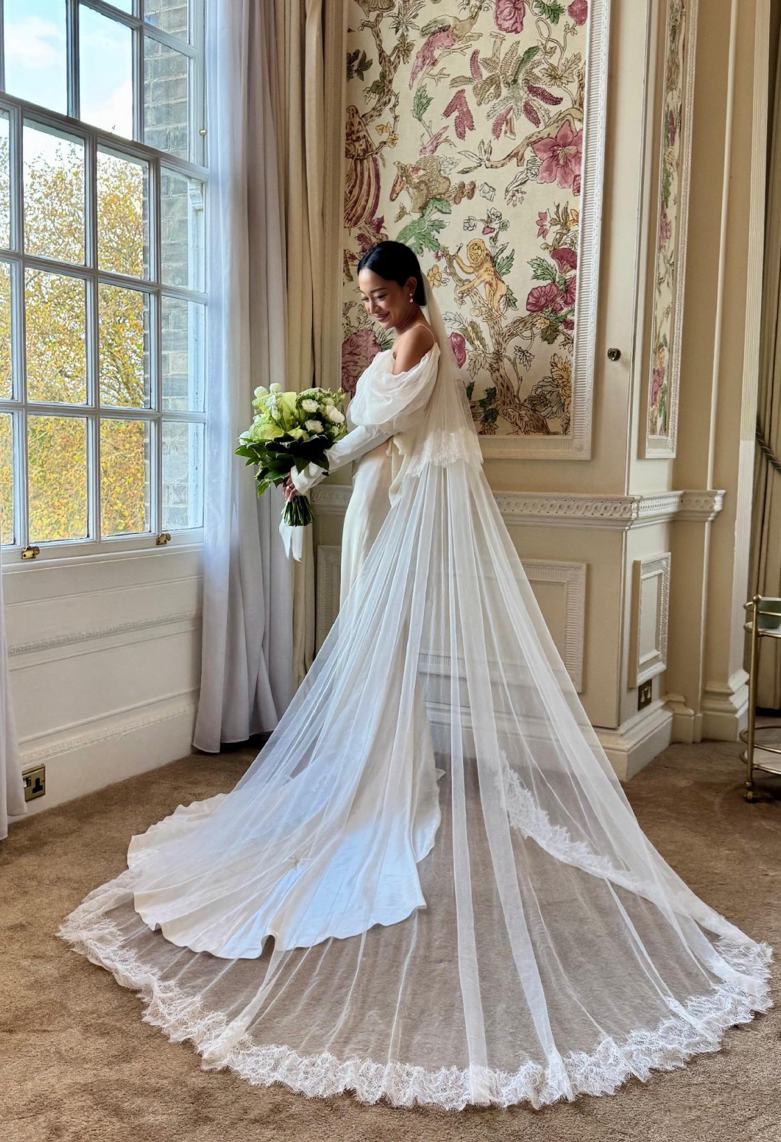 Worn for just 2 hours for photos and the ceremony, then professionally cleaned — the gown is in excellent condition with a few minor pulls that are not noticeable (photos can be provided). The two-tier Chantilly eyelash lace cathedral veil with blusher is also available for purchase for an additional fee.