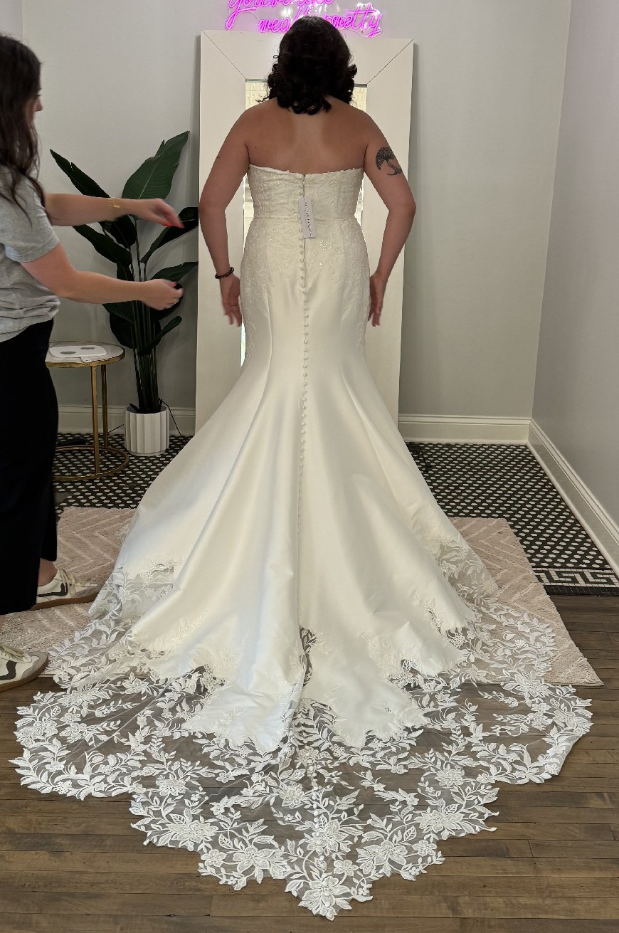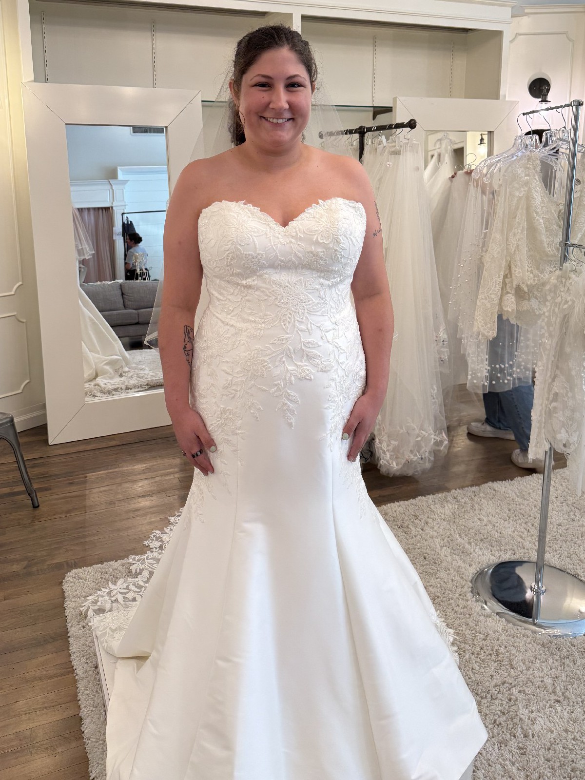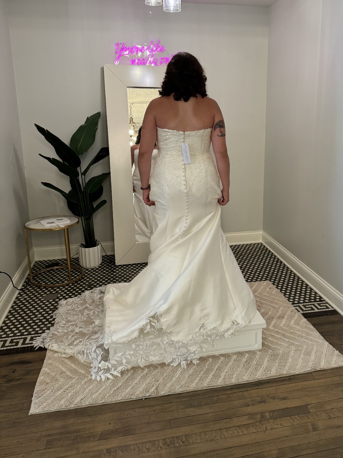 Crafted for the bride who desires a blend of tradition and contemporary flair, this strapless design ensures you’ll move with confidence as you dance the night away. The mid back provides comfort and sophistication, ensuring a seamless fit. Stunning sequins adorn the gown, catching the light at every turn and creating a dazzling effect that is sure to wow your guests.