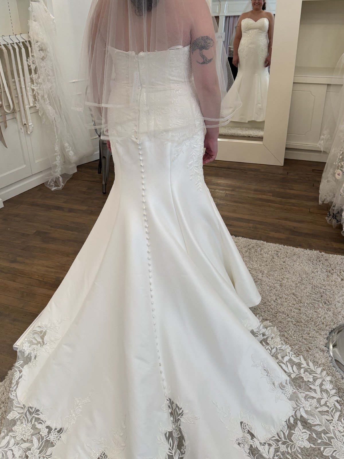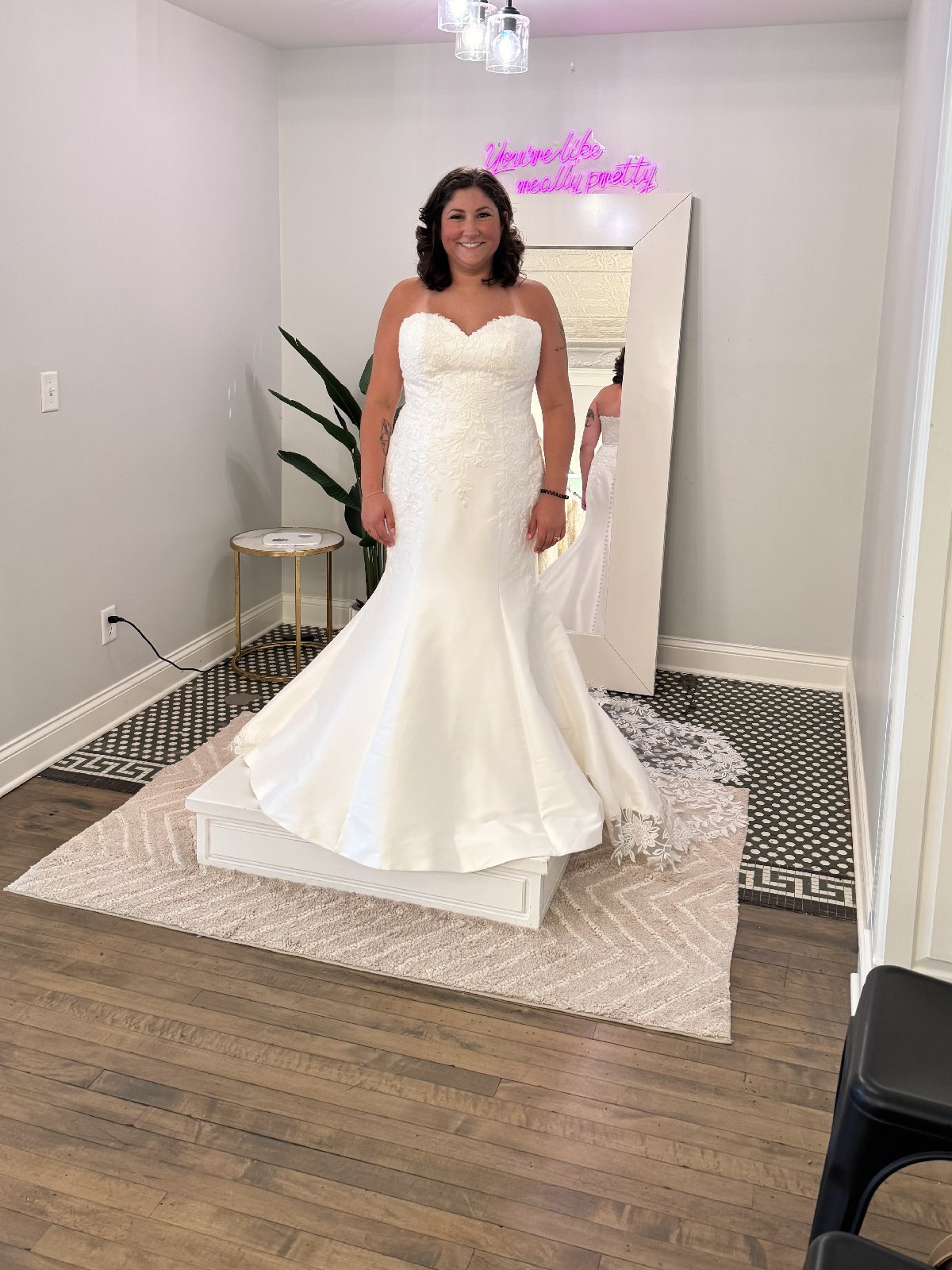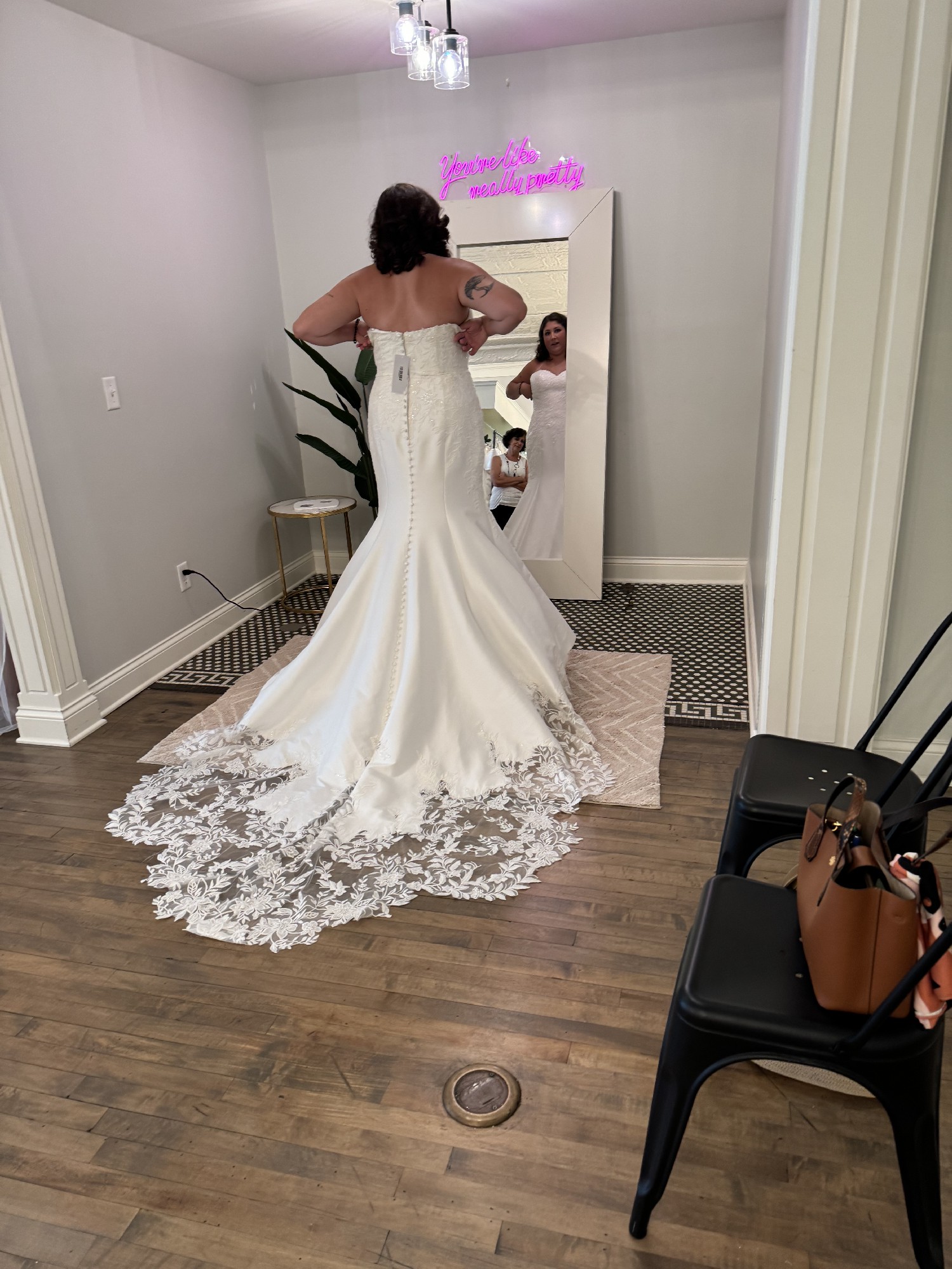 Crafted for the bride who desires a blend of tradition and contemporary flair, this strapless design ensures you’ll move with confidence as you dance the night away. The mid back provides comfort and sophistication, ensuring a seamless fit. Stunning sequins adorn the gown, catching the light at every turn and creating a dazzling effect that is sure to wow your guests.