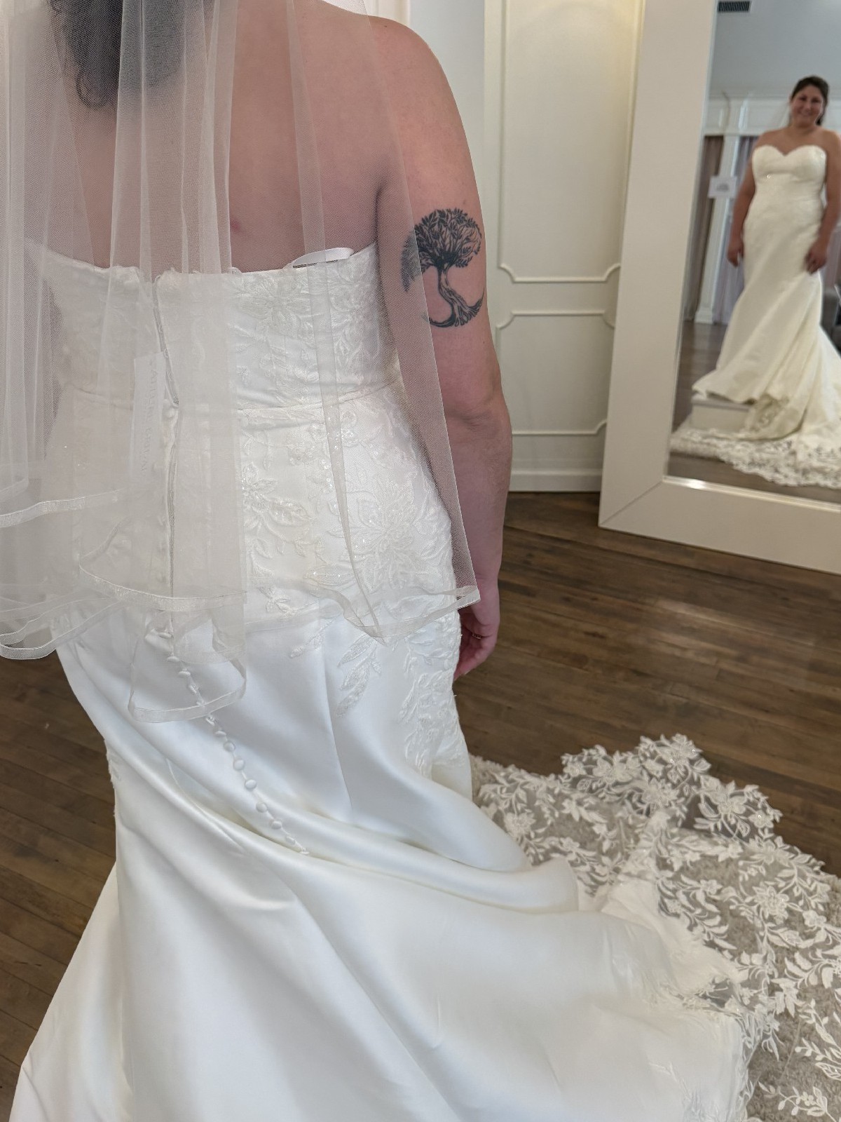 This exquisite Allure Bridals A1110L-IV-18 wedding dress effortlessly combines elegance and modern allure. The fit and flare silhouette beautifully accentuates your curves, creating a flattering and feminine shape that will make you feel stunning on your special day. The sweetheart neckline adds a romantic touch, allowing for a graceful display of your décolletage while providing the perfect canvas for your favorite statement jewelry.