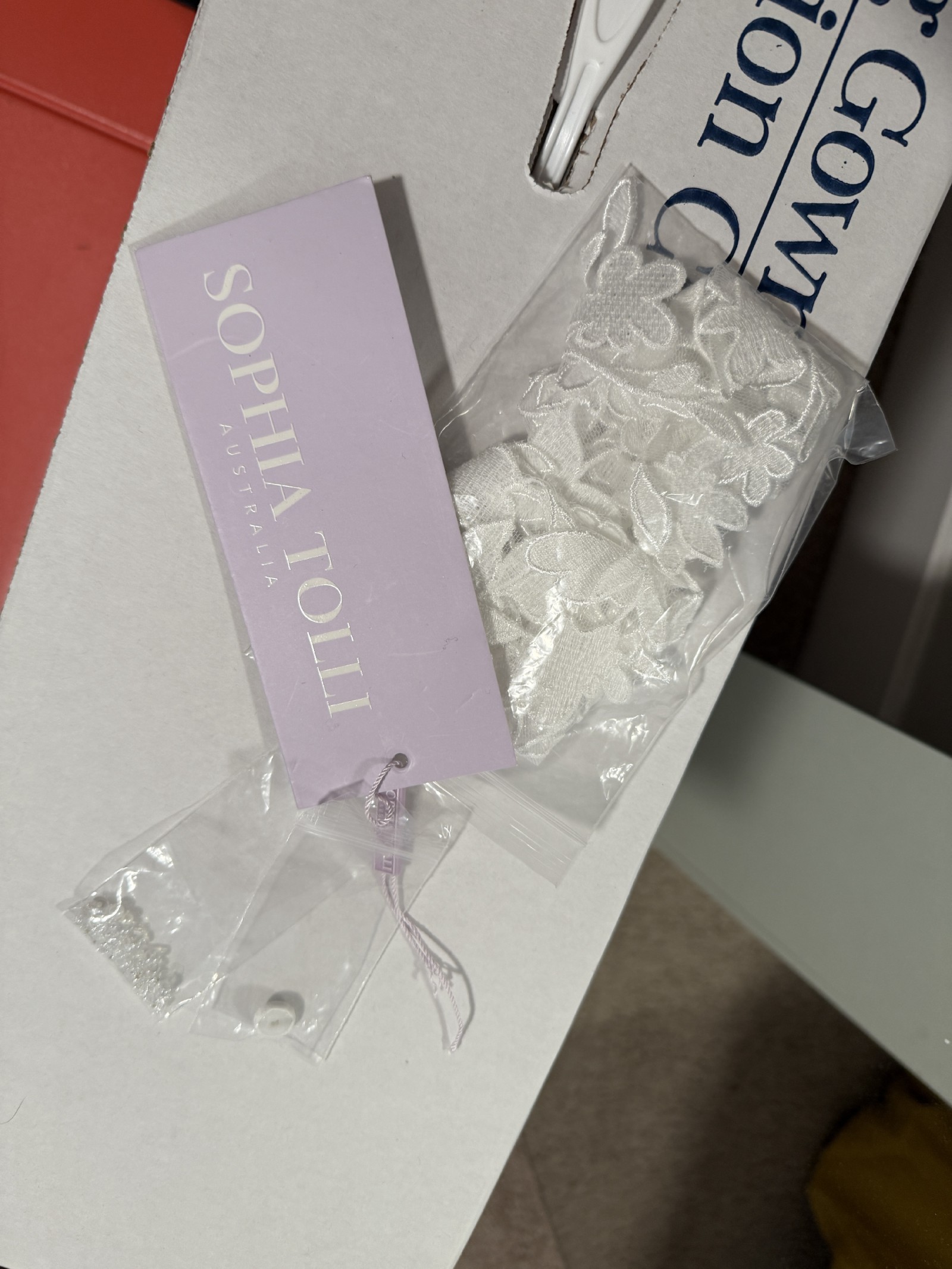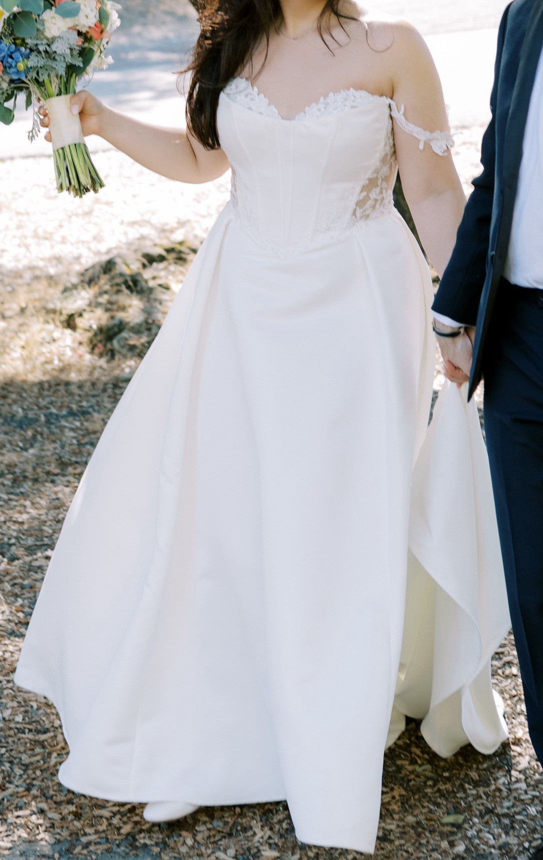 Beautiful Sophia Tolli Rue wedding dress, worn once and in excellent, like-new condition, professionally cleaned and preserved. Features a lace floral sweetheart peek-a-boo neckline with structured scoop bust and basque waist, intricate floral lace detailing on the sheer sides and back of the bodice, detachable off-the-shoulder floral lace sleeves, and a soft A-line ball gown silhouette in luxurious satin. Very flatting on all body types. Plus, it has discreet and useful pockets, perfect to carry a tissue for those happy tears!
