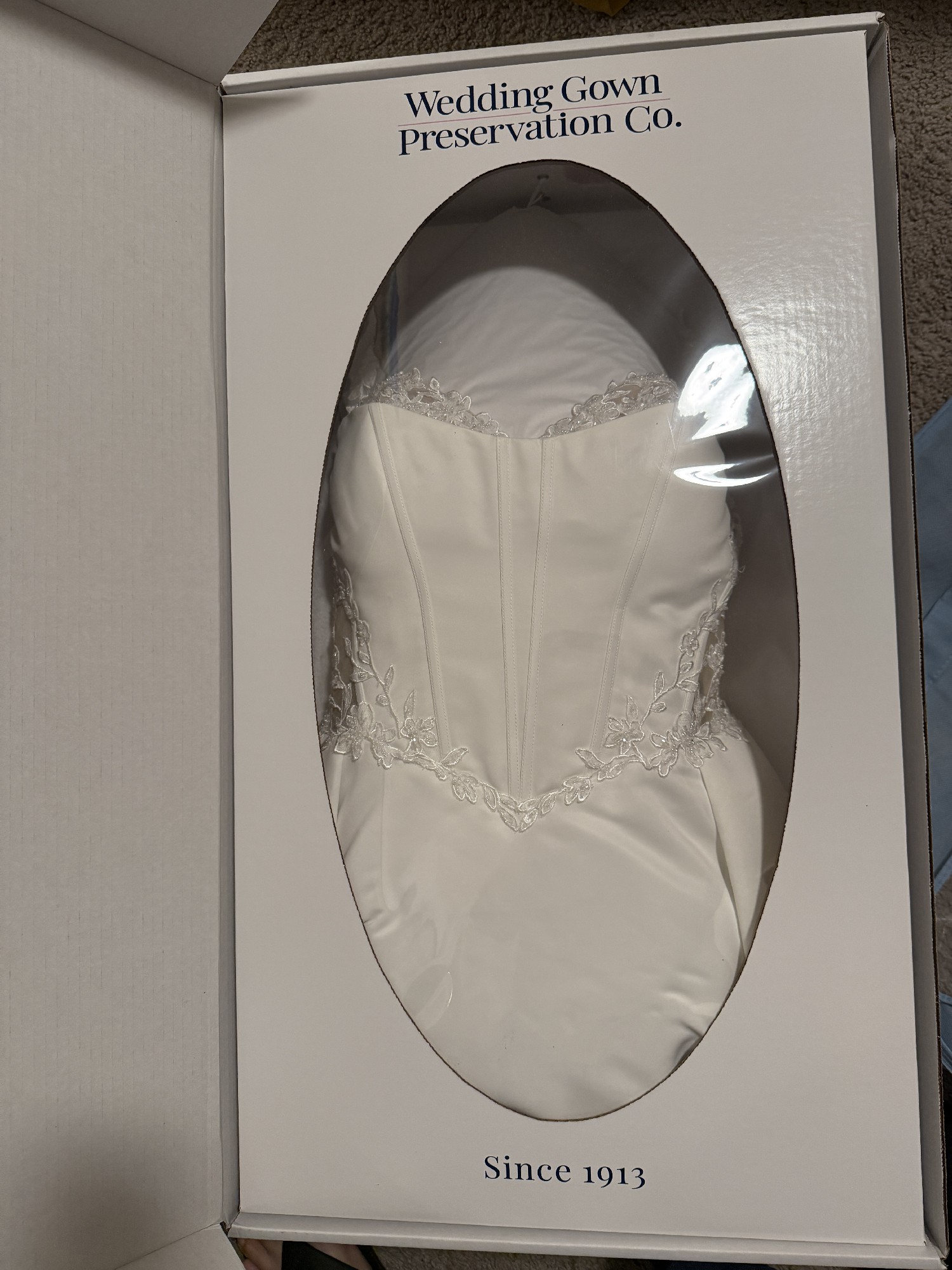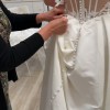 Professionally altered ($750 total) with a 3-point bustle, hemmed to fit 5'9” in heels, bust taken in, and a built-in wrist loop for easy train management during photos. Includes original unused floral lace, buttons, and beading, and comes in the preservation box.