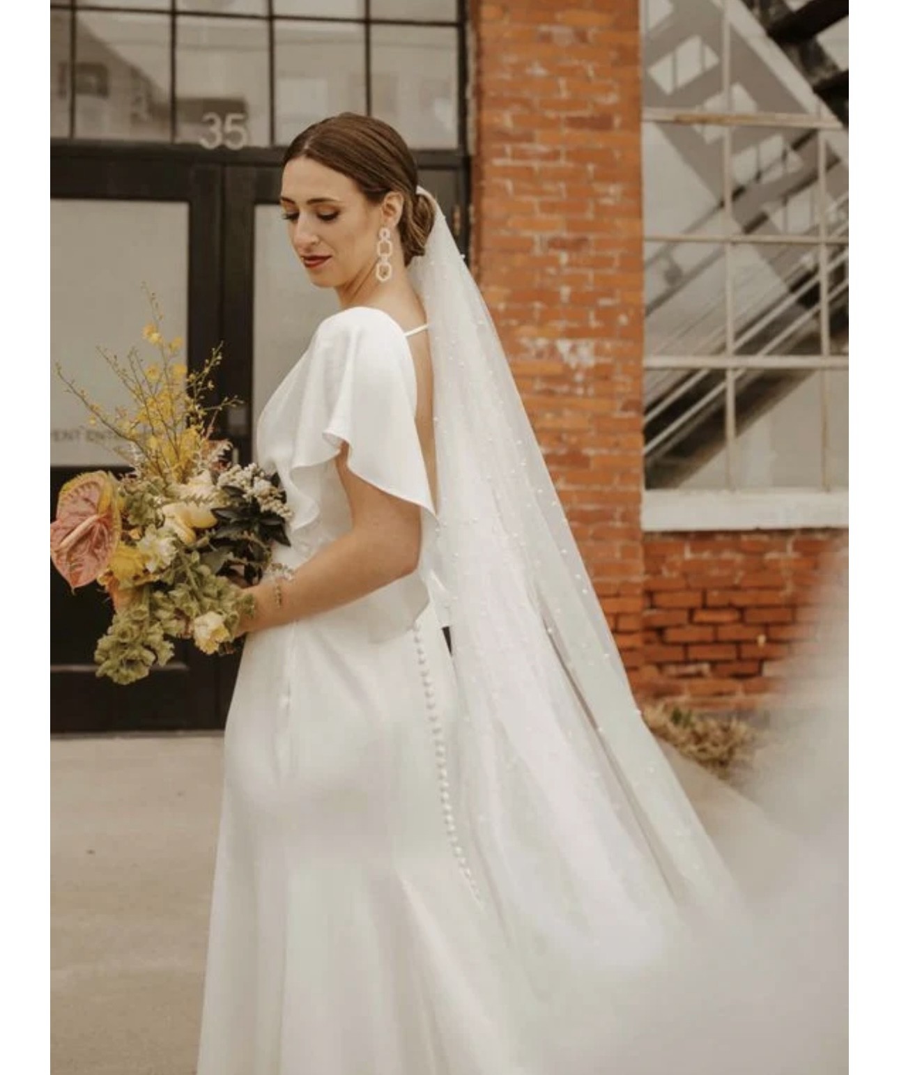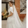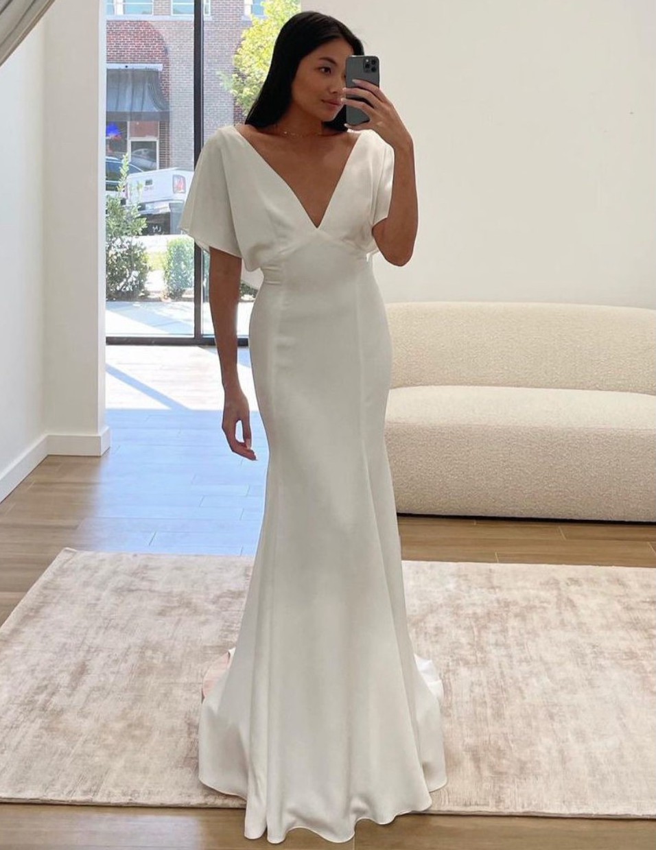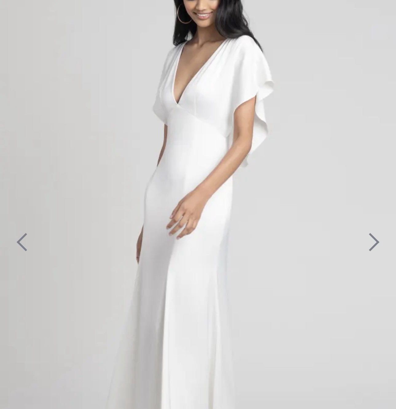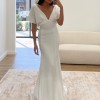 Features: Elegant V-neckline:Flutter sleeves/Beaded train/Luxe satin fabric