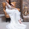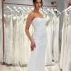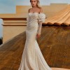 The Pronovias Caledonia is a glamorous beaded fit-and-flare wedding gown with a scoop neckline and a chapel-length train. The gown is crafted from embroidered tulle with on-trend asymmetrical hand draping and internal boning for a perfect fit. Crafted in luxurious embroidered tulle. Hand sewn beading throughout the whole gown catches light with every movement.