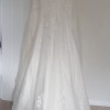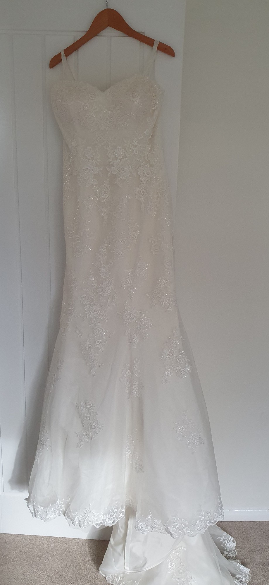 Crafted in a soft ivory hue, this dress flows effortlessly to the floor, creating a timeless silhouette that radiates romance. The low back adds an alluring charm that will leave your guests in awe. It fit me like a glove in size 12, enhancing my figure while allowing for comfort throughout the day. From the moment I walked down the aisle to our first dance, this dress made me feel truly beautiful.