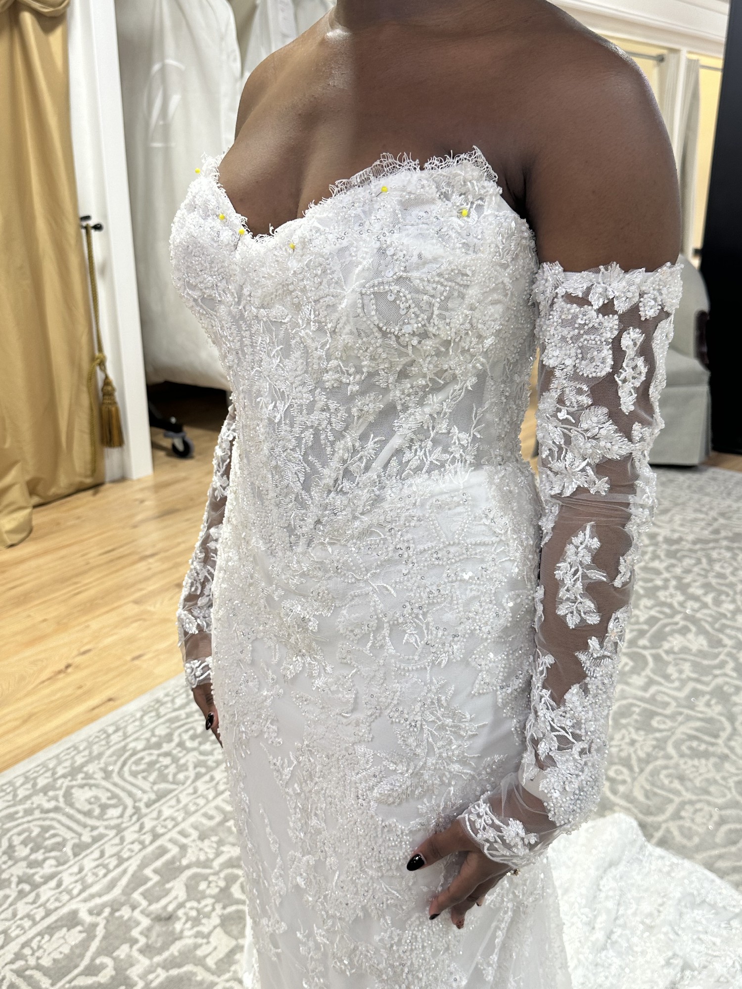 Worn for my ceremony and my getting ready pics. Color is ivory with ivory undertones. Measurements on wedding day were 32.5 inch bust (D cups within and can be removed); 27 inch waist; and 38 inch hips. Height is 5’1” and I was wearing 2.5” heels