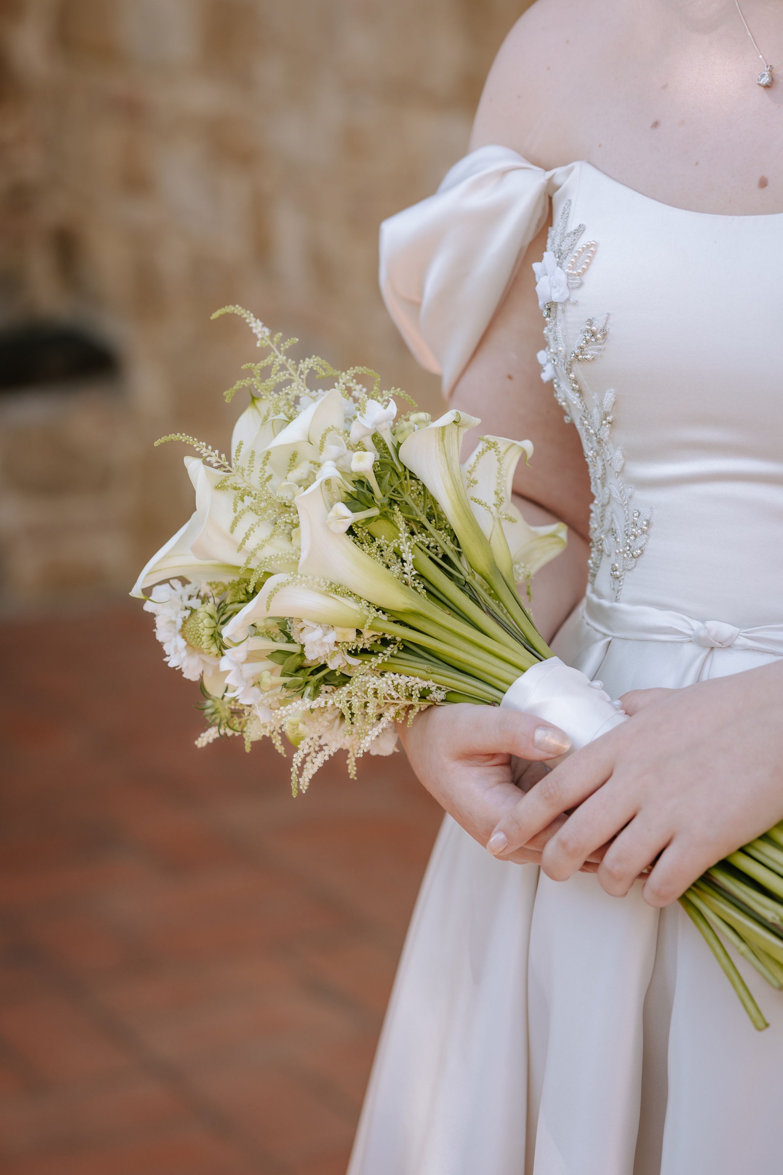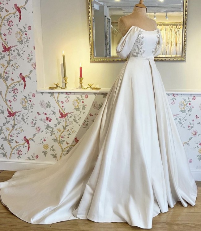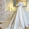 This dress has a timeless elegance, a luxury bridal gown designed to be modern and romantic, sophisticated and luxurious. This off-shoulder satin wedding dress features soft draped sleeves, a flattering fitted bodice, and exquisite hand-beaded floral embroidery that adds a touch of sparkle to the bodice.