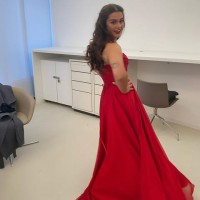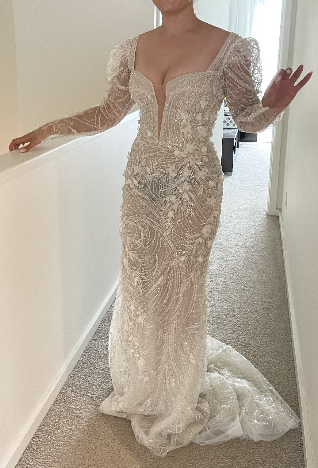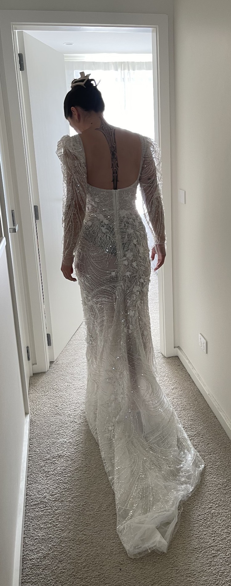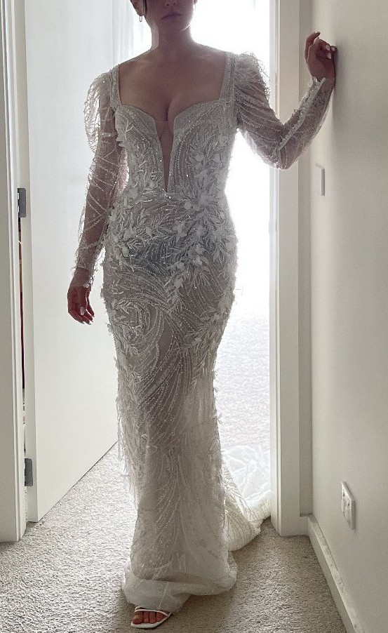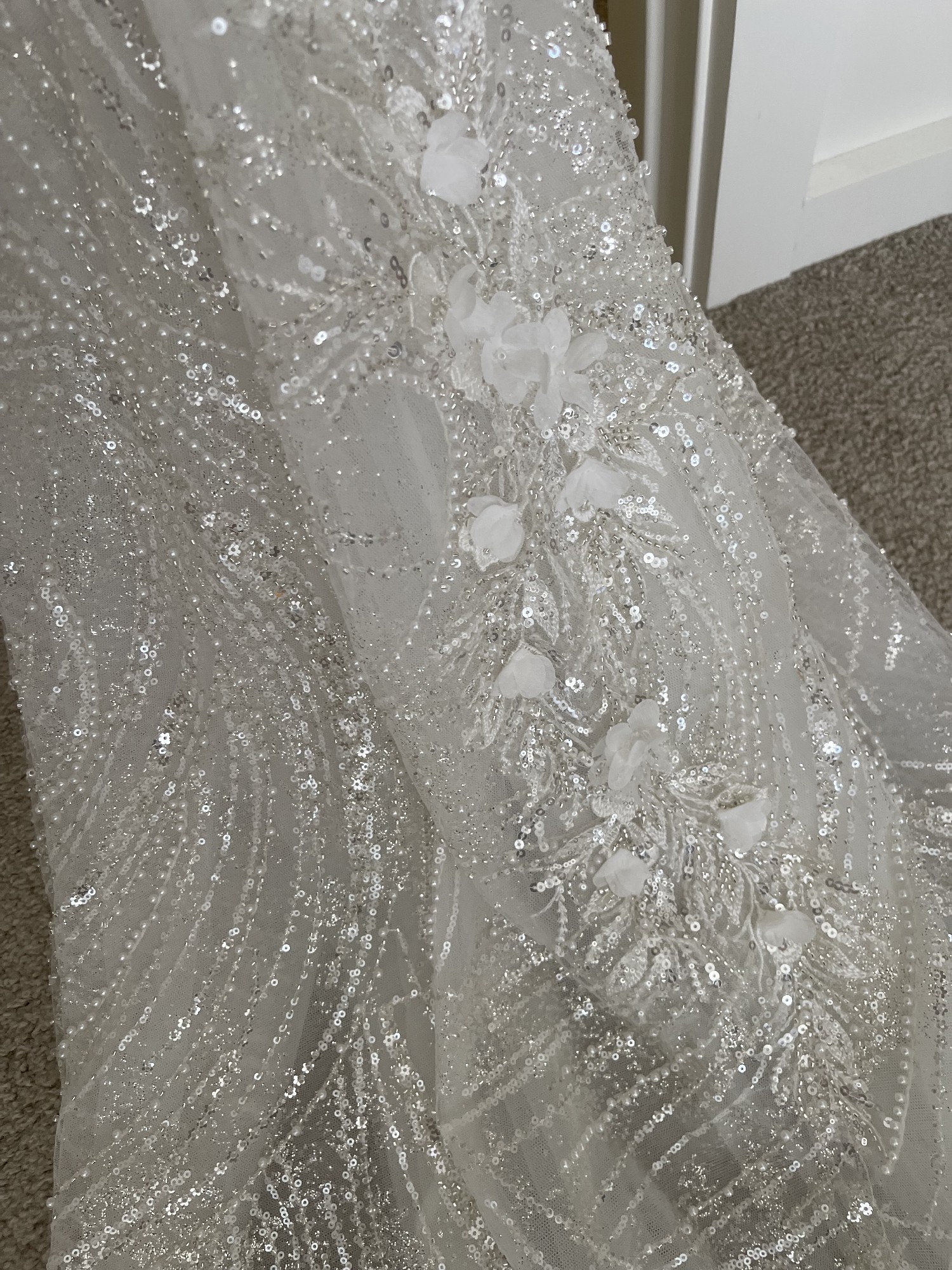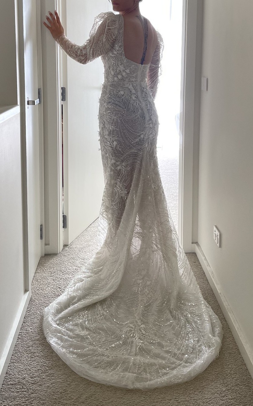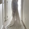 The mermaid silhouette hugs the body in all the right places, fitting like a small EU 38, before flaring gracefully into a chapel-length train that ensures an unforgettable entrance from every angle. With its supportive back neckline and exquisite craftsmanship, this gown is ideal for the bride who wants to feel beautiful, empowered, and impossible to forget.