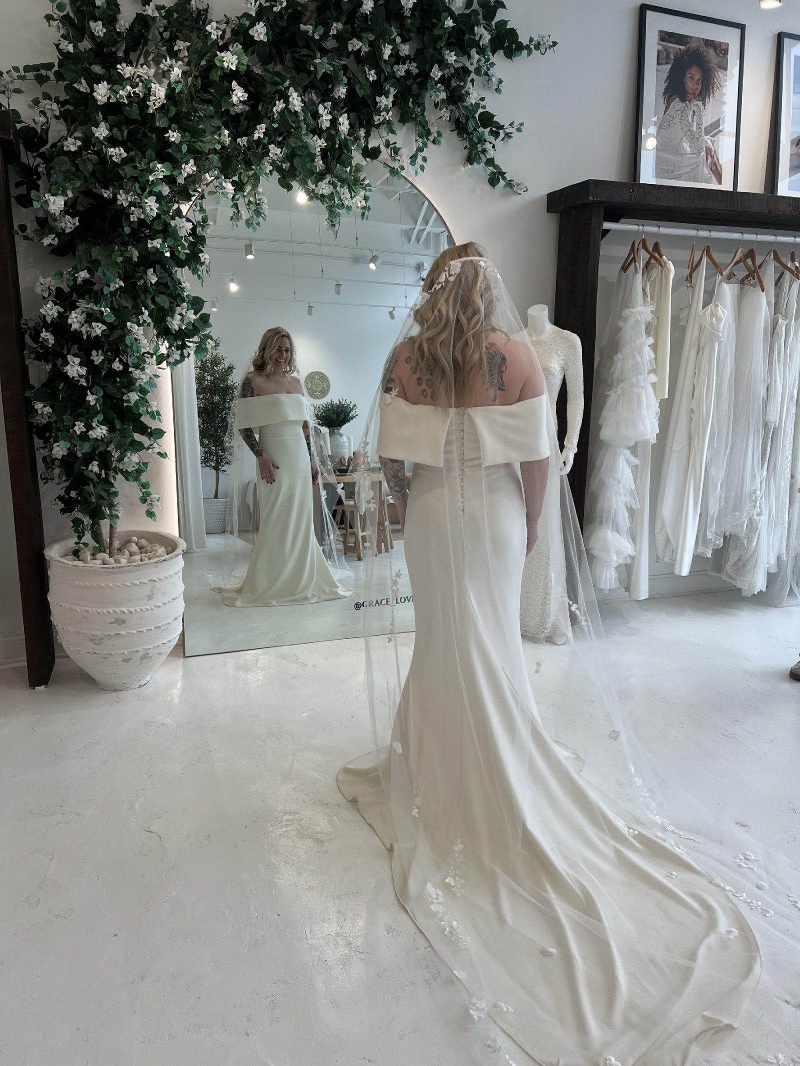 This Mila gown from Grace Loves Lace truly made my wedding day unforgettable. As soon as I slipped into this exquisite dress, I knew it was the one. The fit and flare silhouette hugged my curves in all the right places while allowing me to move freely on the dance floor. The off-the-shoulder neckline added a touch of romance and elegance that I adored.
