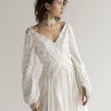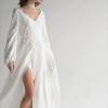 Dress details: V-shape necklines, back bow, long sleeves, slits, long train.
