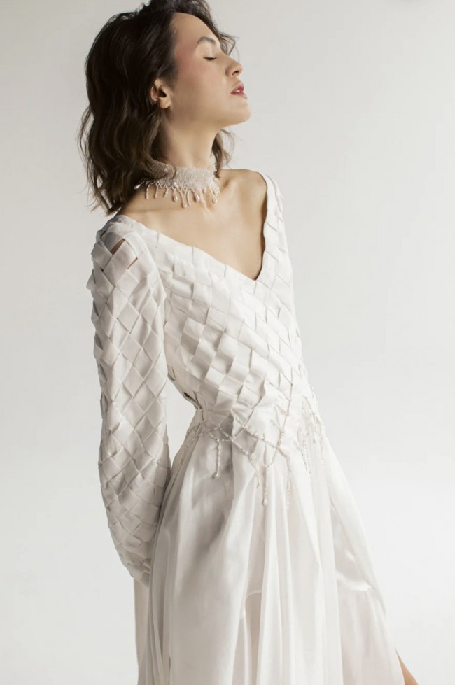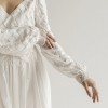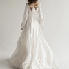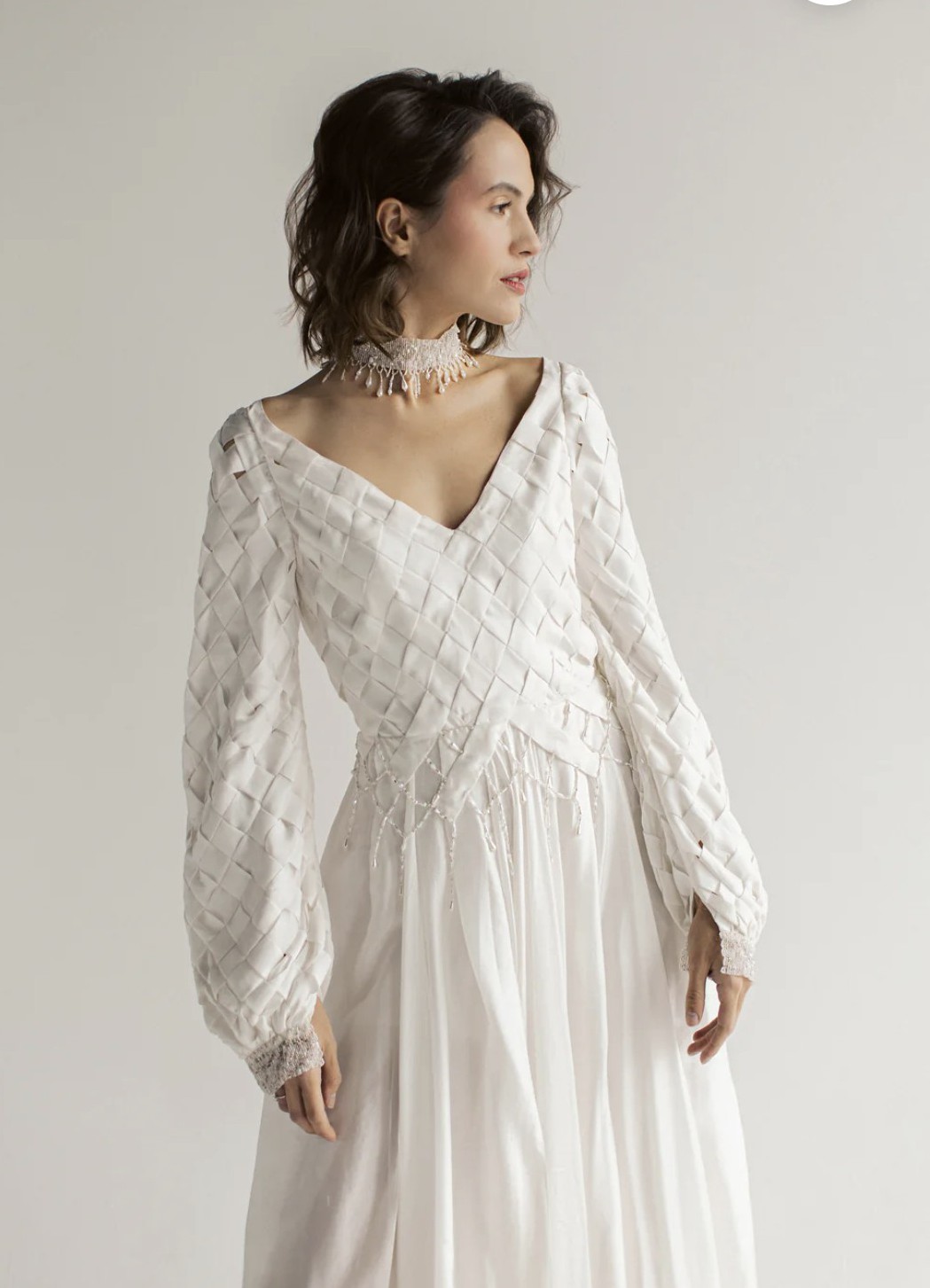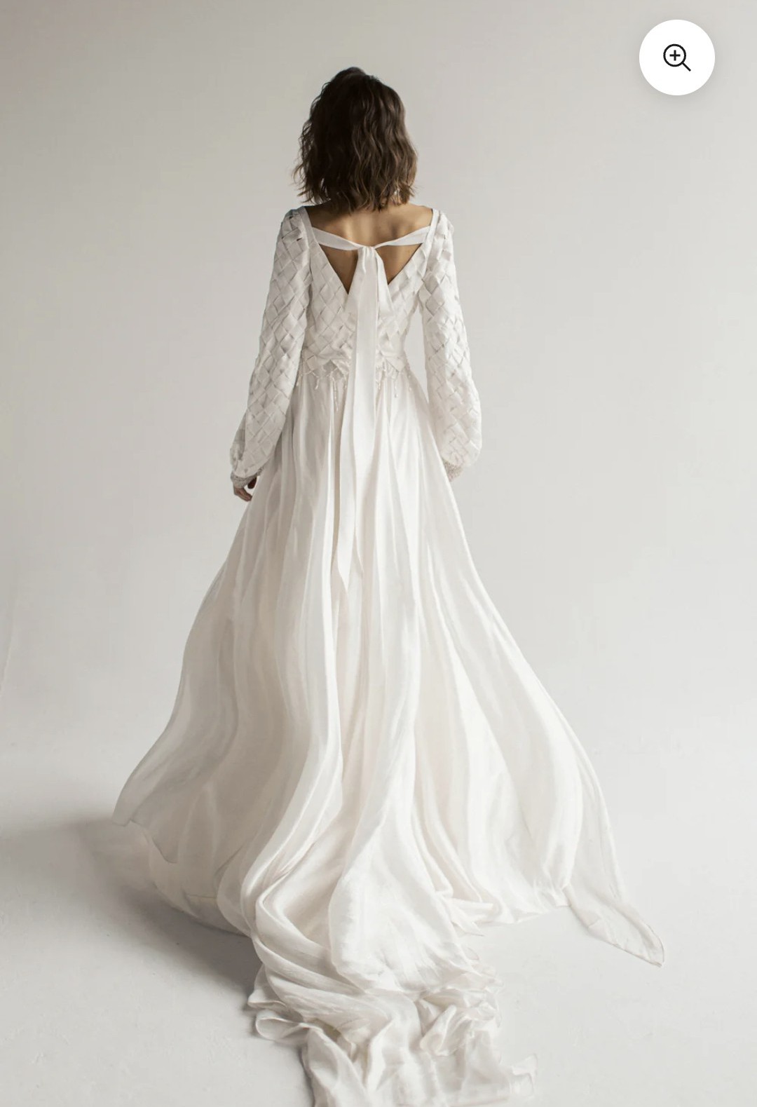 Embrace the enchantment of the "Nieve" wedding dress, inspired by the Celtic goddess of love and beauty. This gown features a pleated ivory chiffon top and a V-front and back bodice that highlights your figure. Symbolic ribbons tie into a bow at the back, representing eternal love. Long bishop sleeves and a beaded wristband add a celestial touch, reflecting the goddess's heavenly beauty. The flowy chiffon skirt with subtle slits ensures grace and freedom of movement. "Nieve's Whimsical Whispers" is a celebration of love, inviting you to dance through your wedding day with the magic of Nieve's spirit.