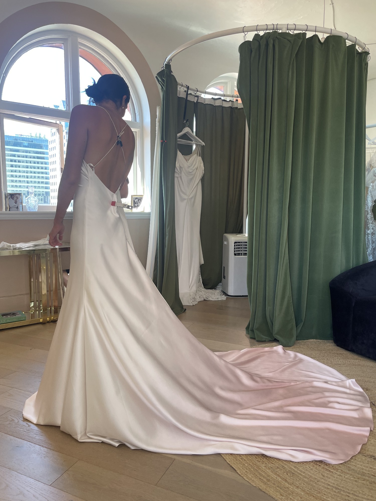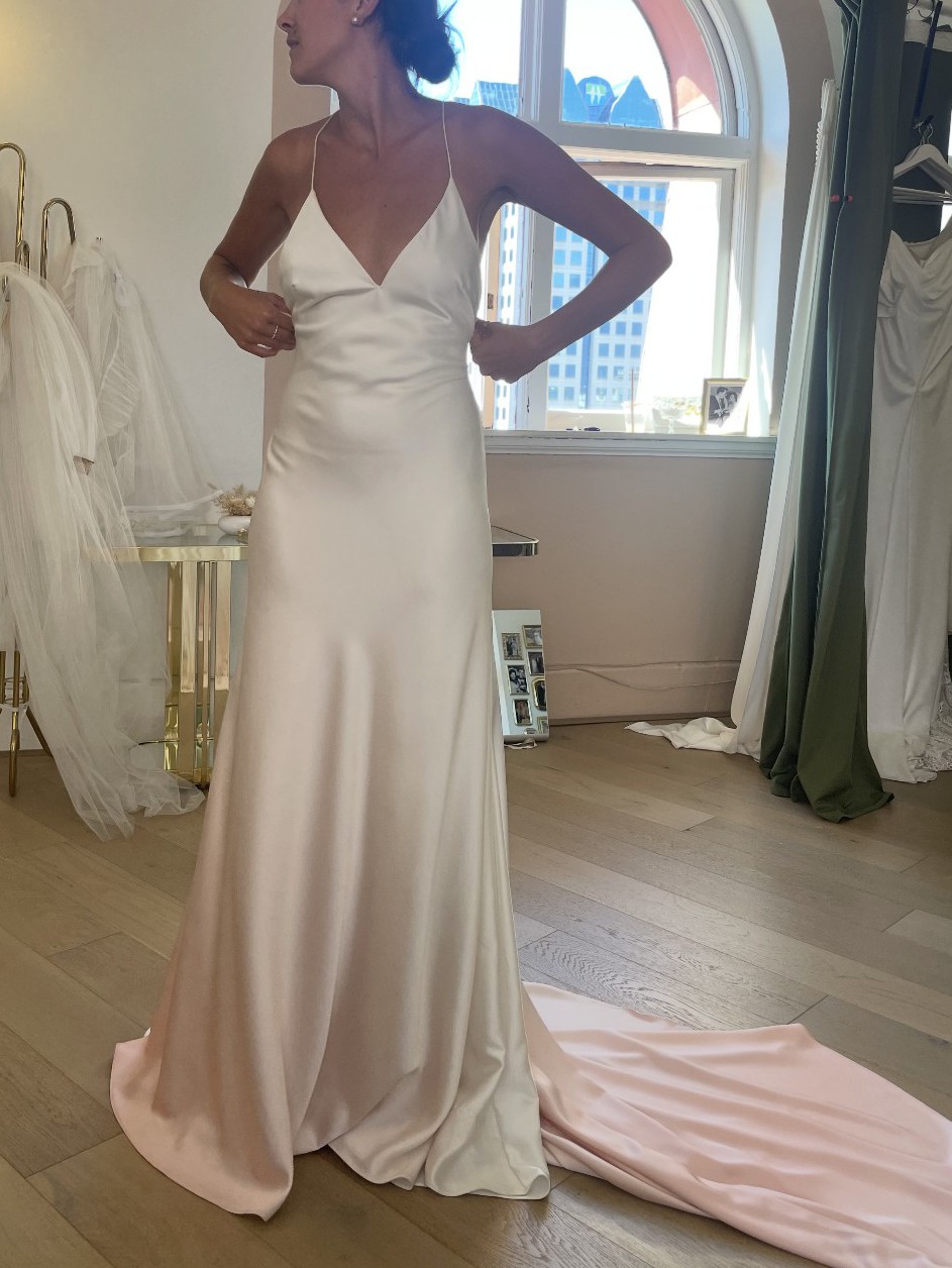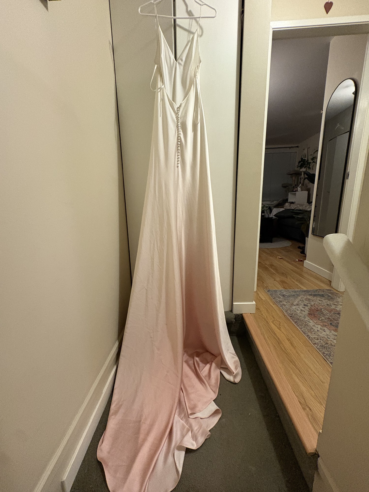 “A lustrous and simplistic glamour of the Palm gown. Crafted in a gradient blush haze , Palm’s body contouring silhouette and luxe soft satin finish. Covered buttons adorn the back with a subtle nod to tradition, while a demi plunge v, daring scoop back, and delicate straps provide just enough edge for our modern brides. Paired with a full train, Palm is perfection for formal and intimate soirées alike and a stunning canvas to build your unique bridal look. “