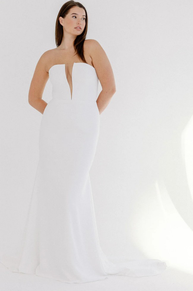 Our sexiest strapless design to date. The plunging deep v-neckline commands attention, while the fully boned bodice provides exceptional support. Crafted from our signature figure-hugging crepe, Sloane effortlessly smooths and accentuates every curve, perfect for the bride who desires an unforgettable, yet sophisticated look.