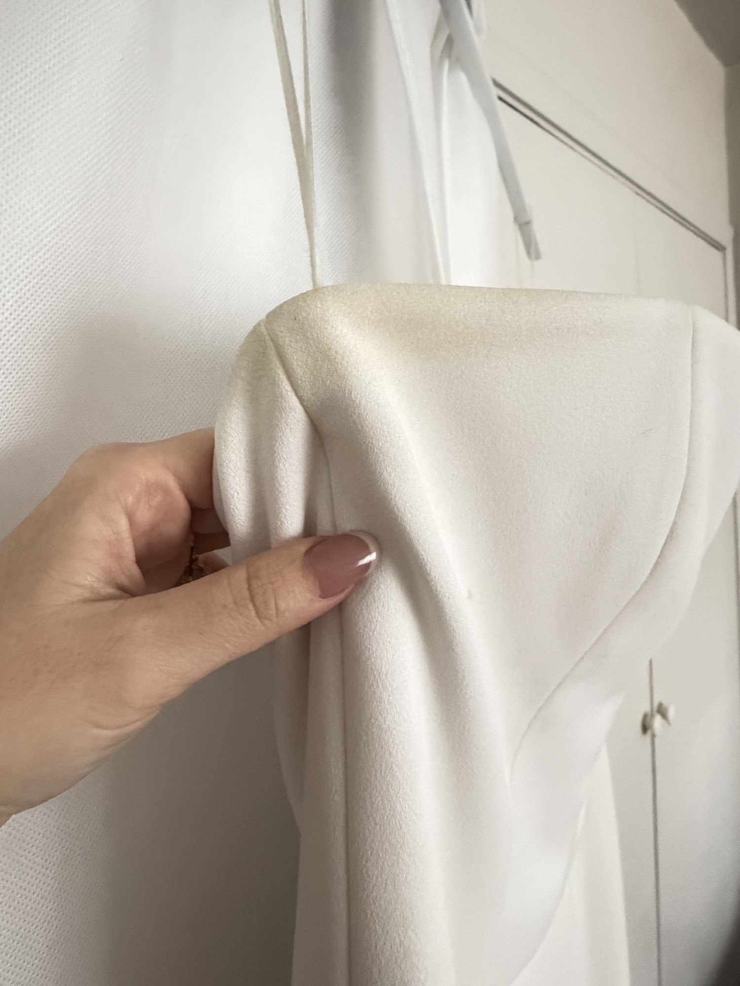 - Discoloration on edge of underarms, Discoloration along back zipper, Small marks toward bottom right back of dress