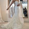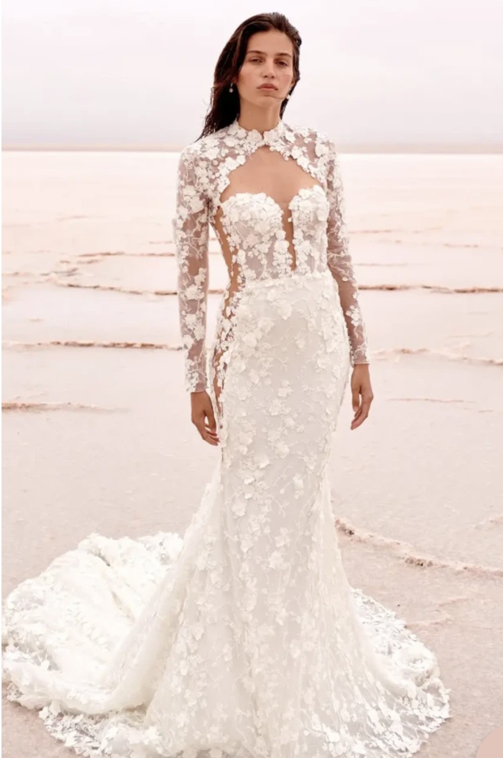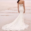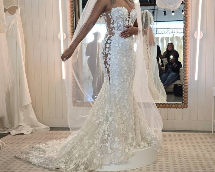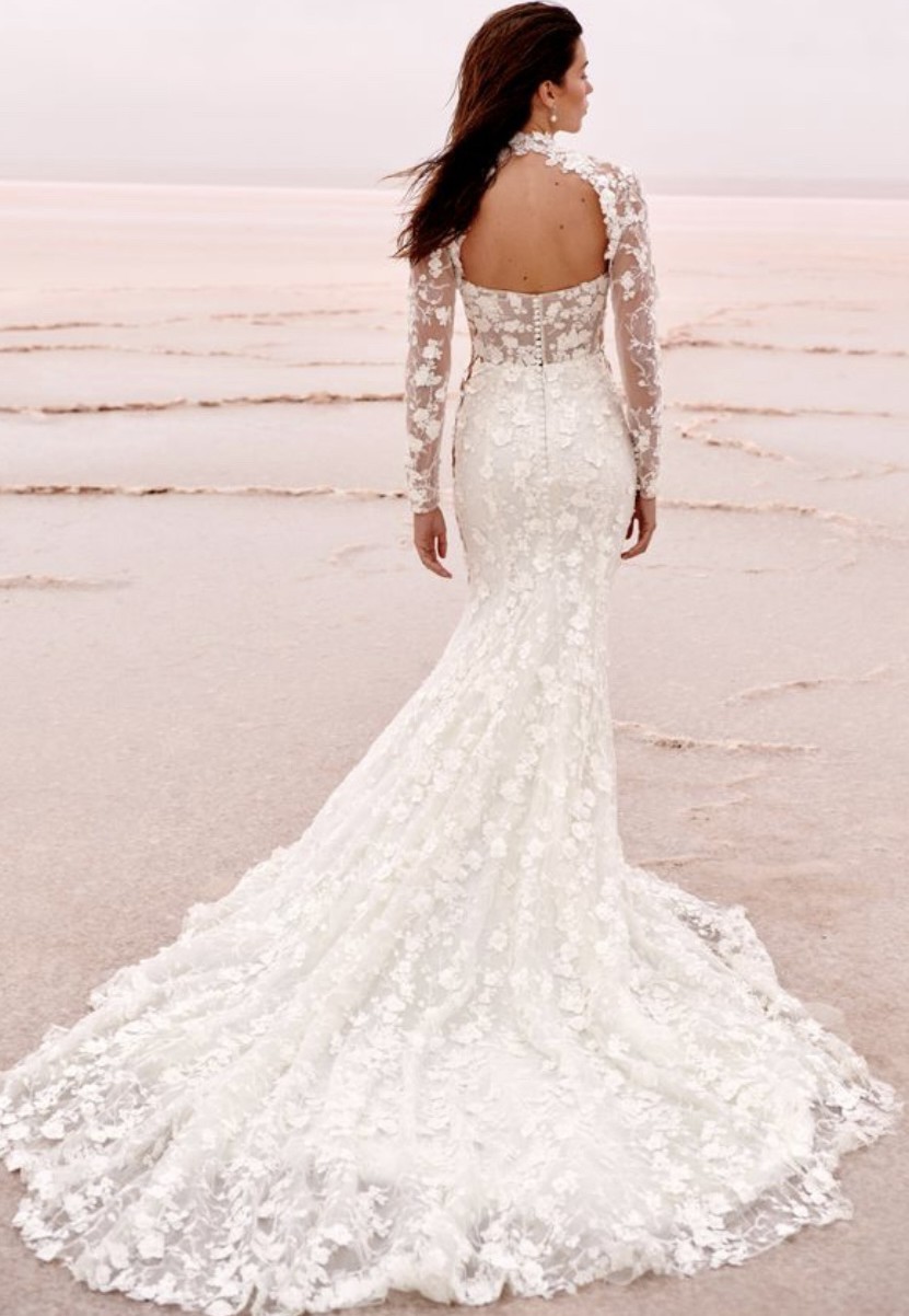 The low back is a showstopper, leading to a floor-length design that leaves a breathtaking trail as you walk down the aisle. Adorned with exquisite 3D flowers, delicate beading, and shimmering crystals, this gown truly sparkles in any light. The added details of embroidery and sequins create a tapestry of elegance that will have you feeling like royalty on your special day.