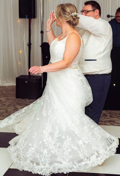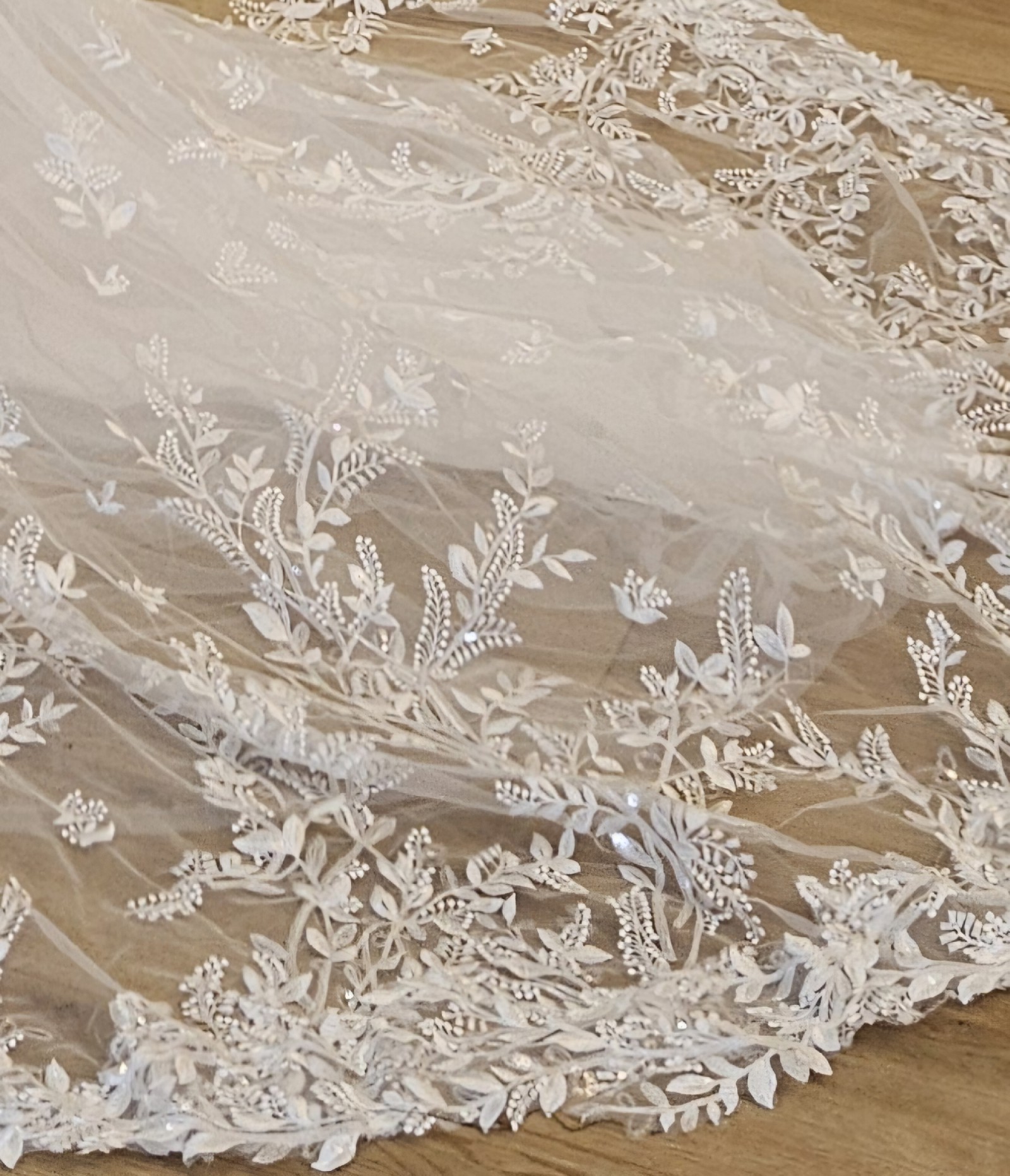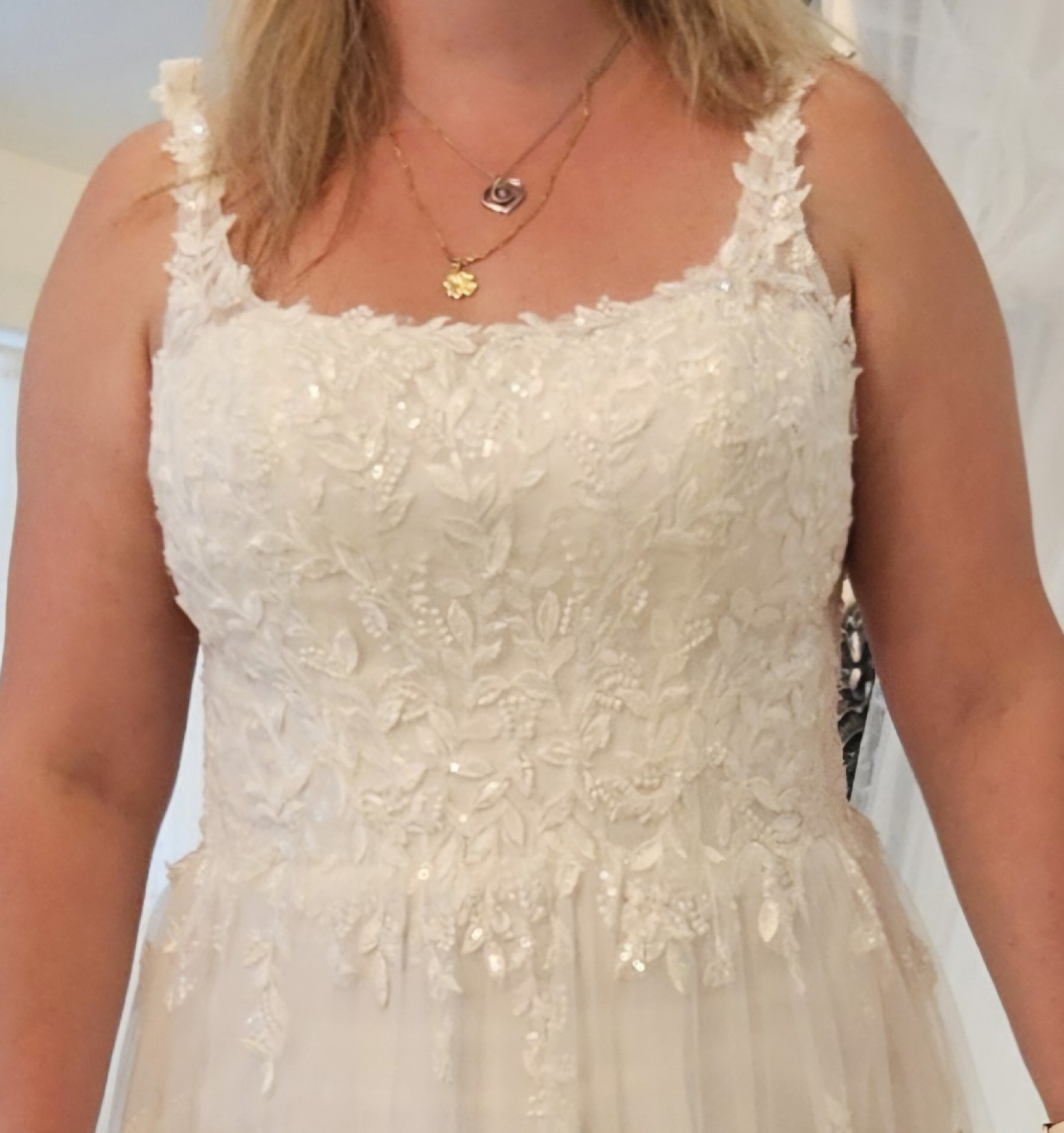 This stunning Mindel gown by Maggie Sottero holds a special place in my heart, and I’m excited to pass it on to another bride who will love it as much as I did. The ivory lace and tulle is delicately adorned with 3D flowers and sparkling sequins, creating a breathtaking look that captures both elegance and romance. The A-line silhouette is incredibly flattering, while the square neckline and backless design add a touch of modern sophistication.