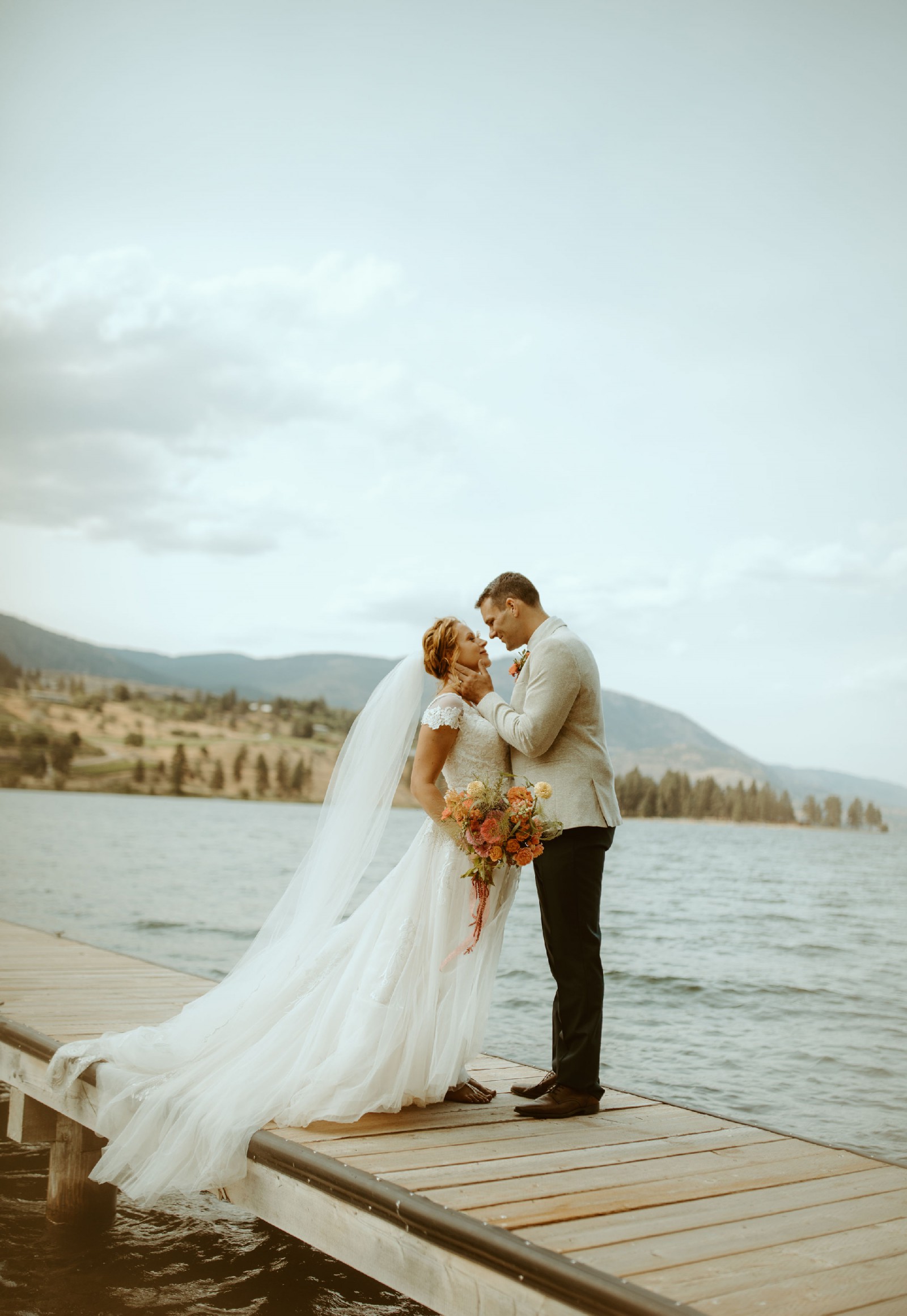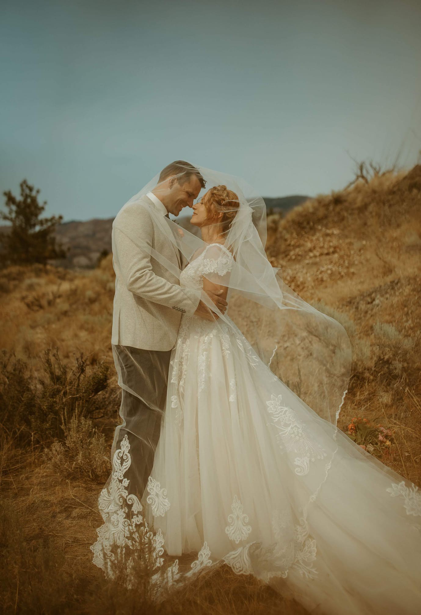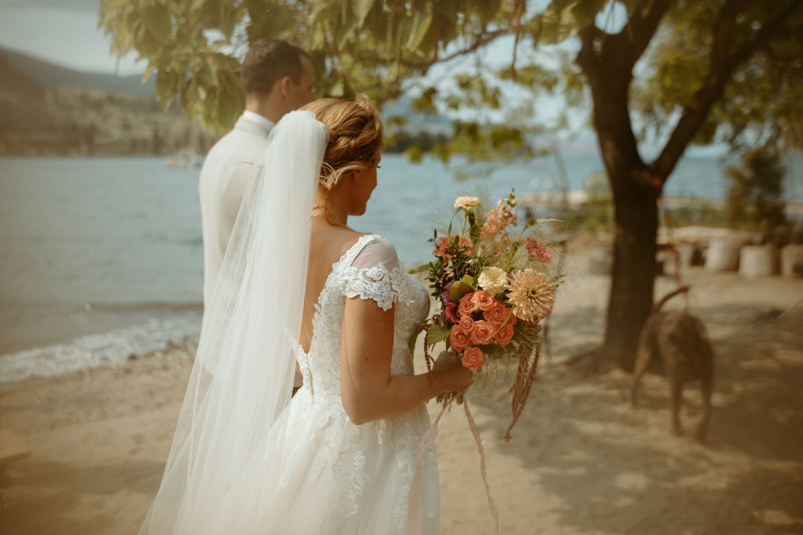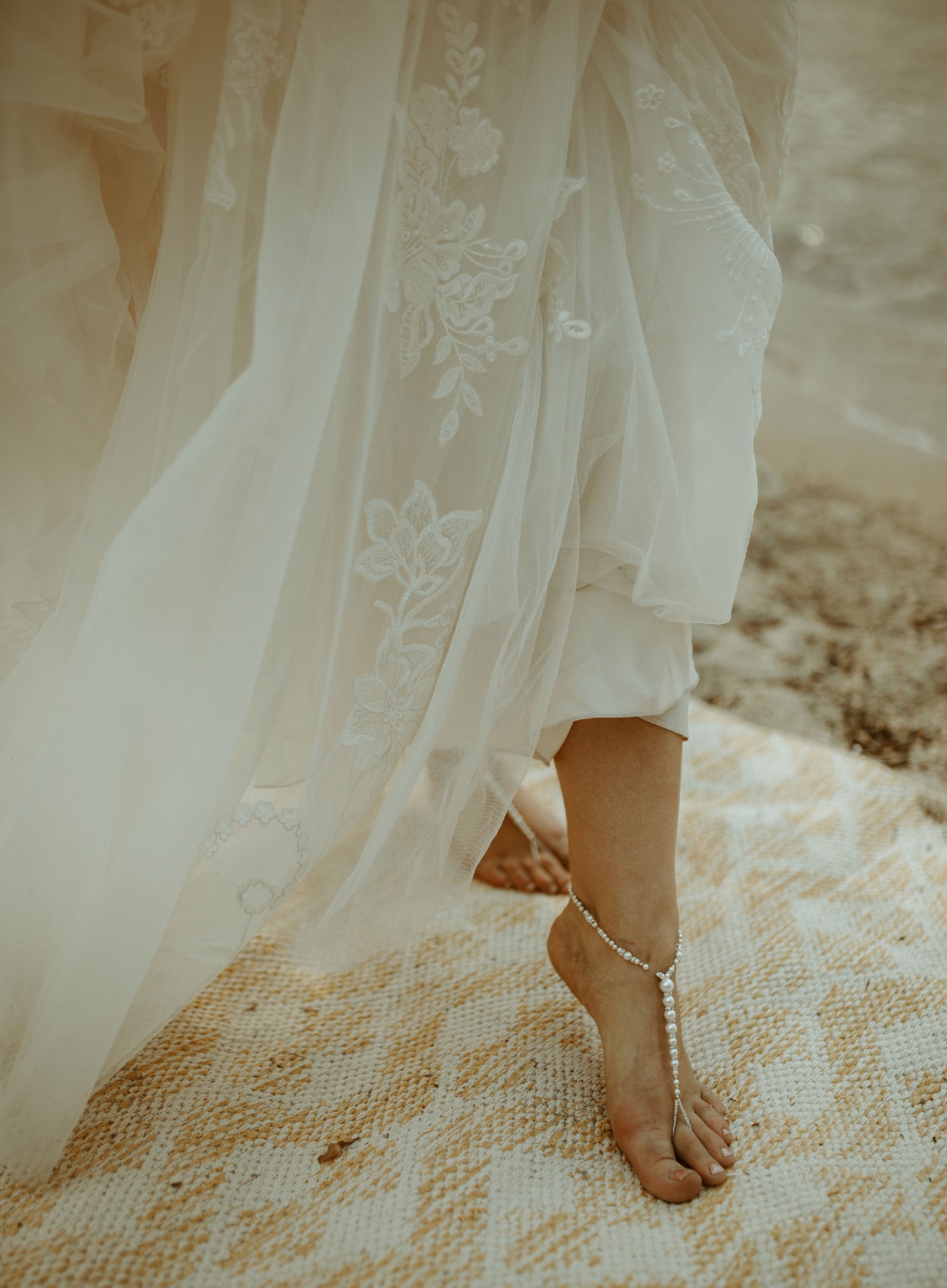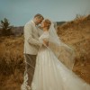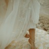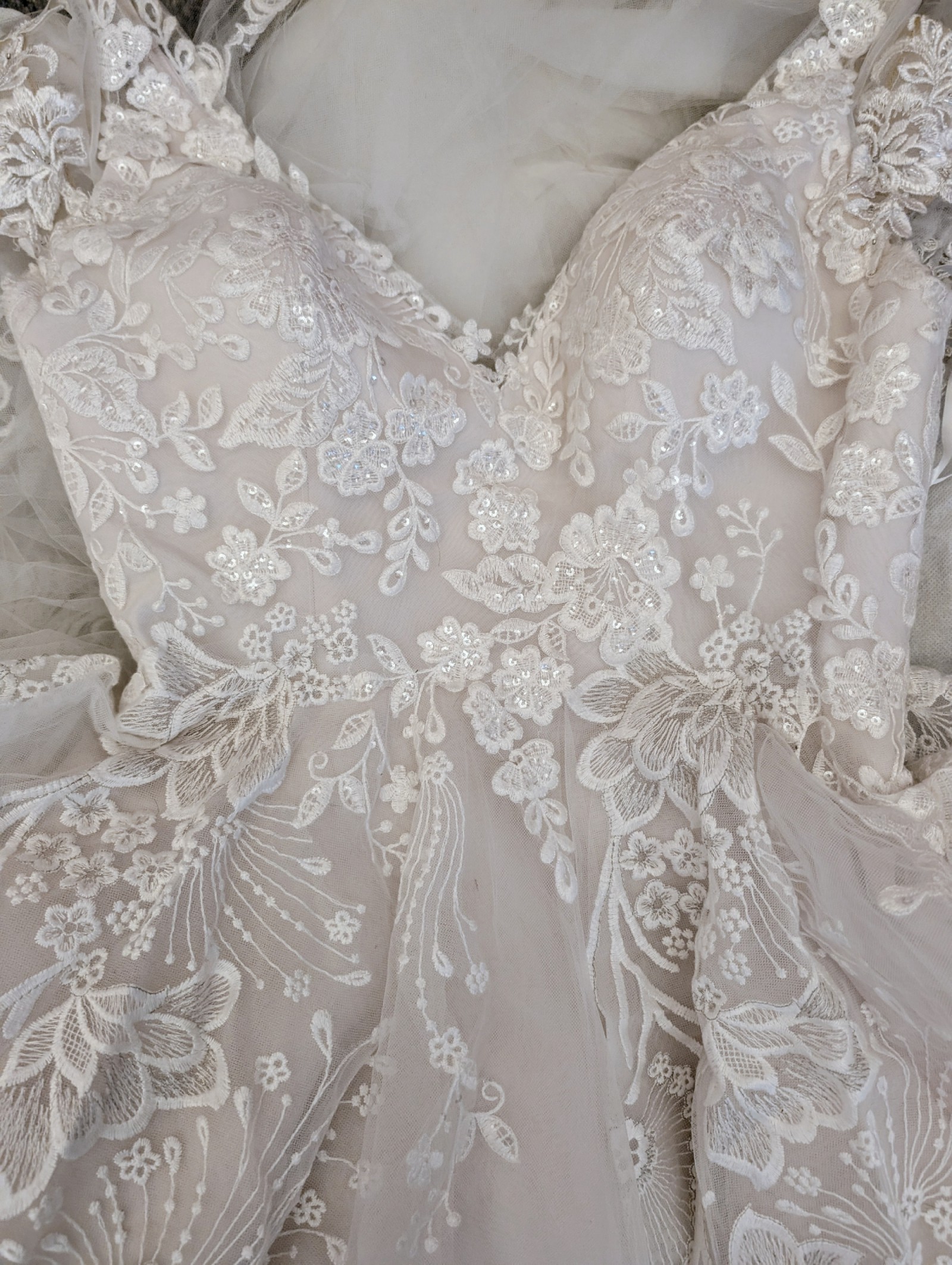 The skirt extends into a soft chapel-length train adorned with beautiful embroidered lace along the hem. The train photographs beautifully and adds a romantic, sweeping effect without being heavy or difficult to manage.
