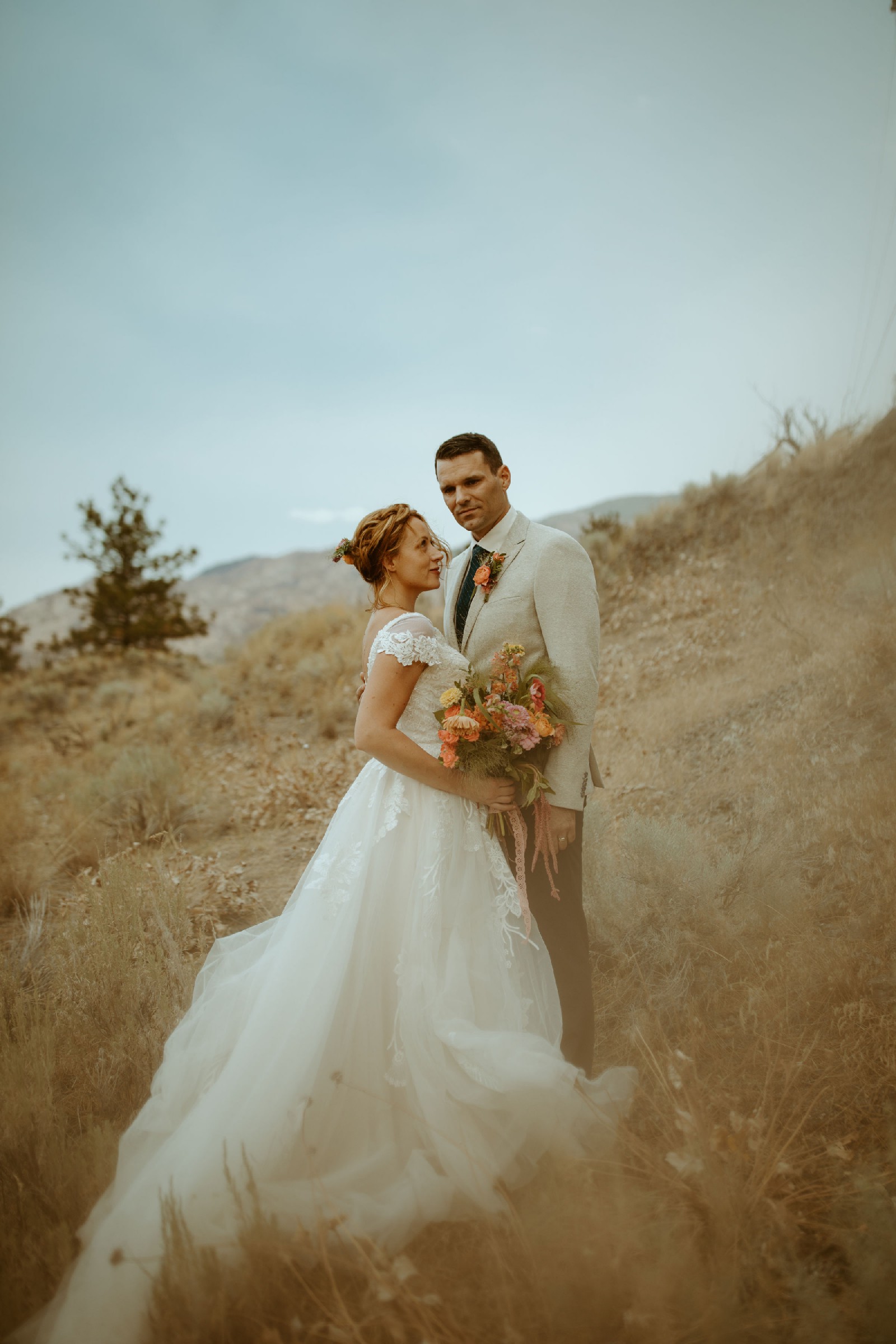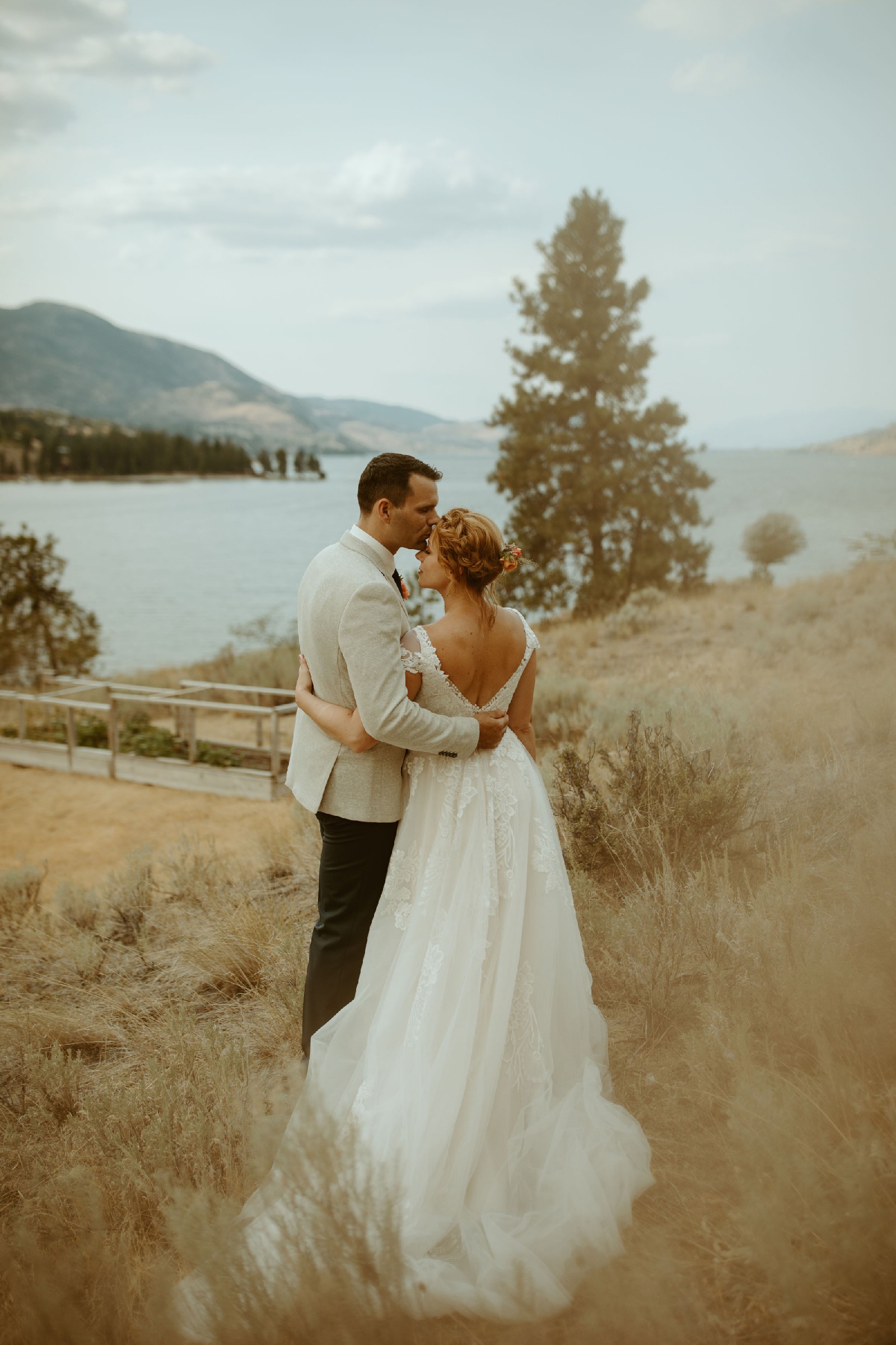 The lace detailing flows organically from the bodice onto the skirt, where it blends into layers of light, airy tulle that create a graceful, floating effect as you walk. The back of the dress features a gently scooped design, adding a touch of timeless elegance.