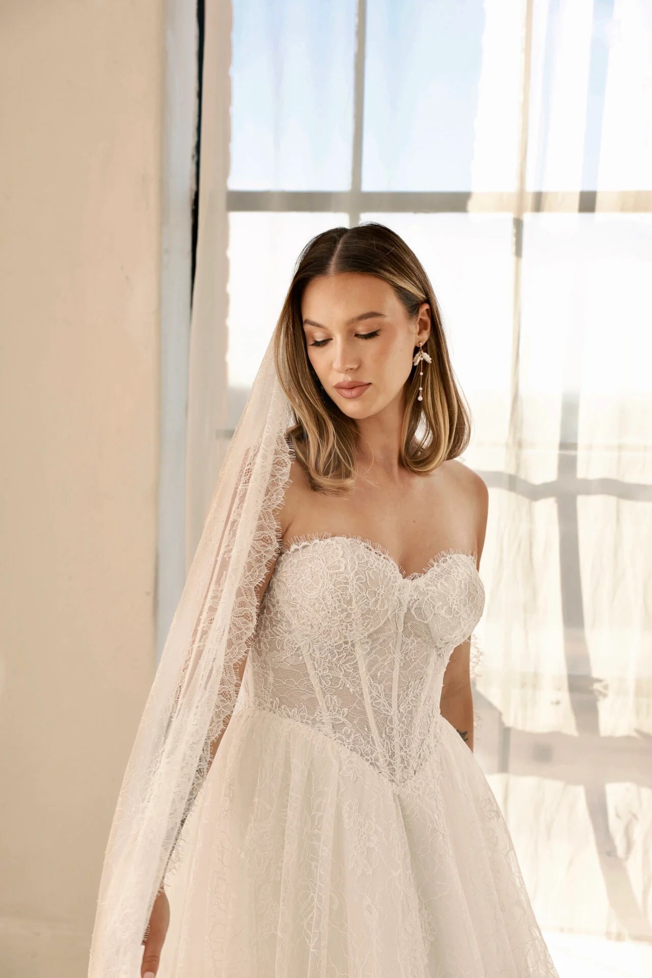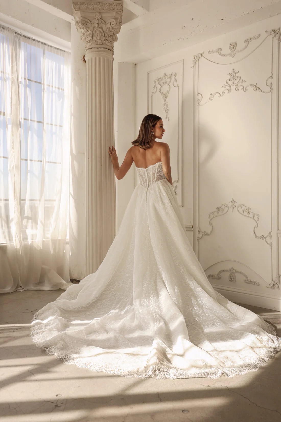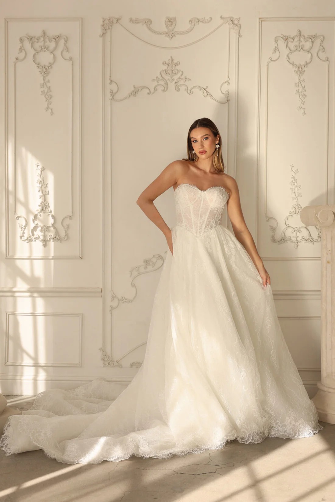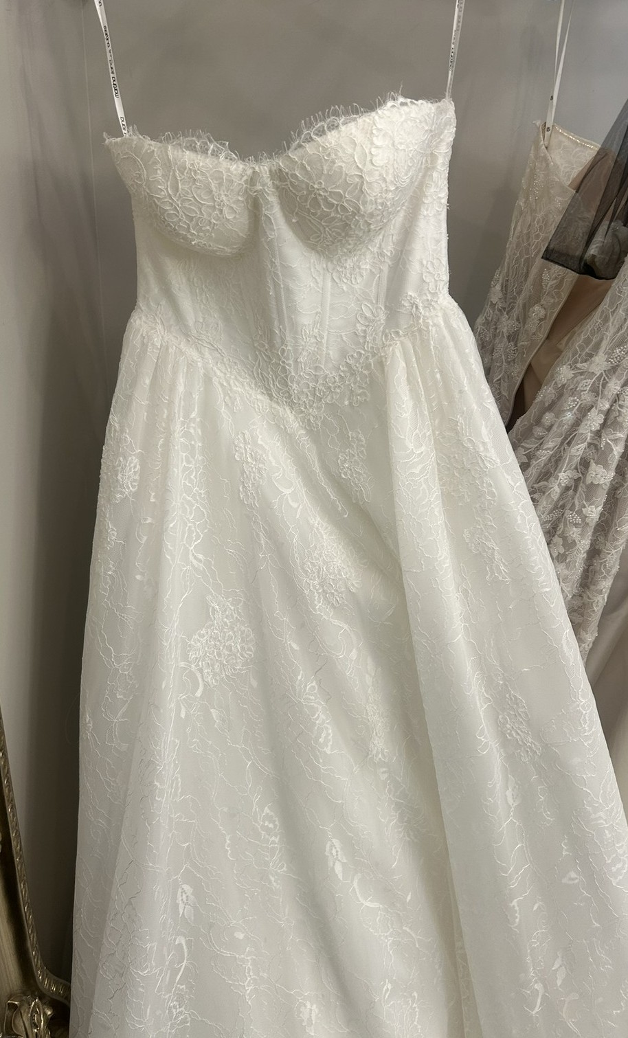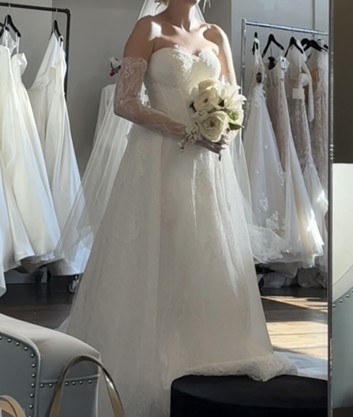 This is a 2025 Martina Liana dress in the style 1882. I picked it up from the bridal store recently and has never been worn/altered/out of its bag! (The photos of me are of the sample dress I tried on when shopping) I ended up falling in love with a different dress and I’m hoping I can help a bride out that may be interested in this one! Feel free to message me with any questions, I also will be including lace gloves I purchased with the gown ($450 value & in the photos) for free!