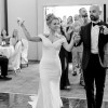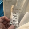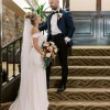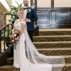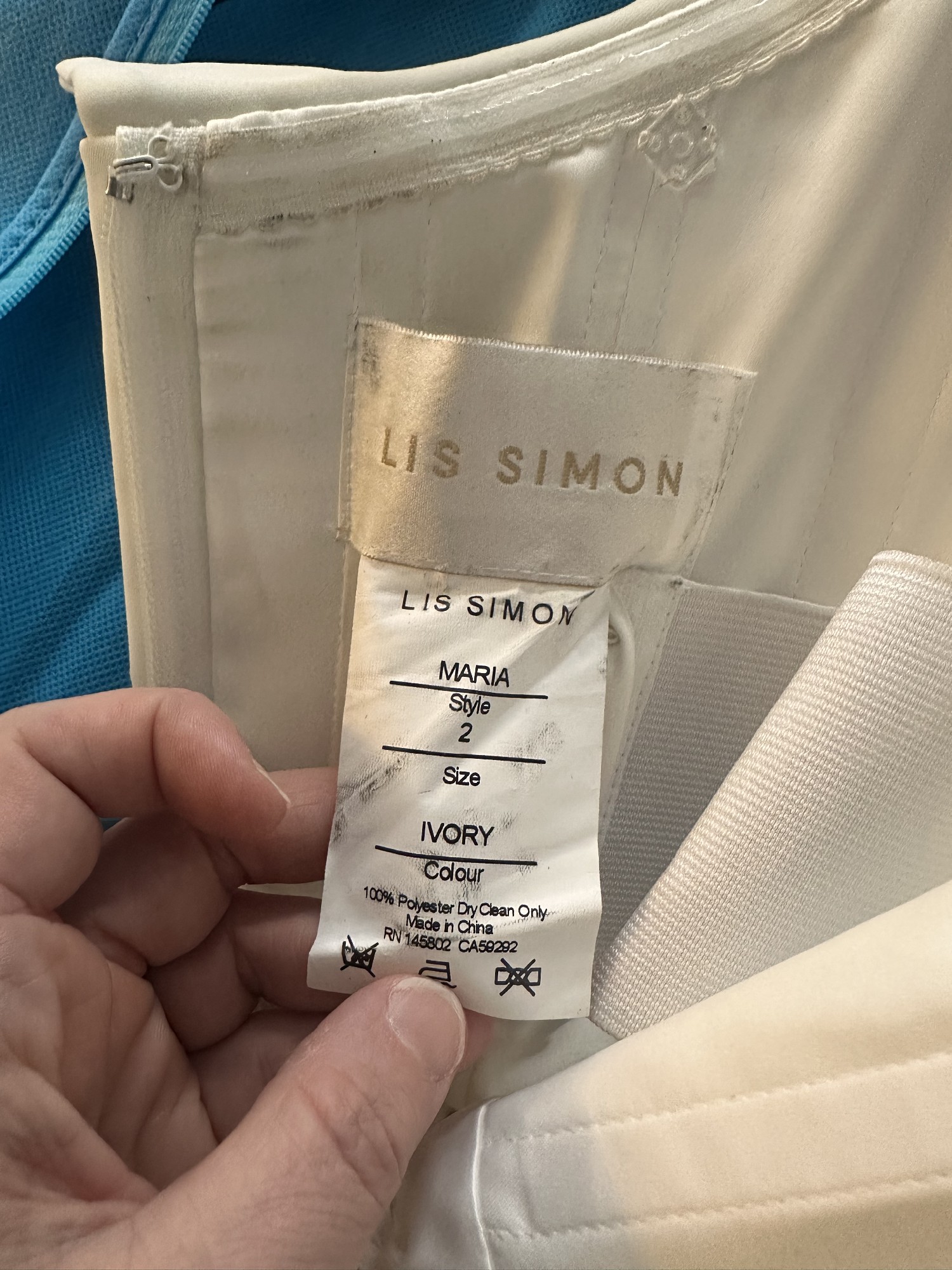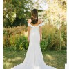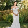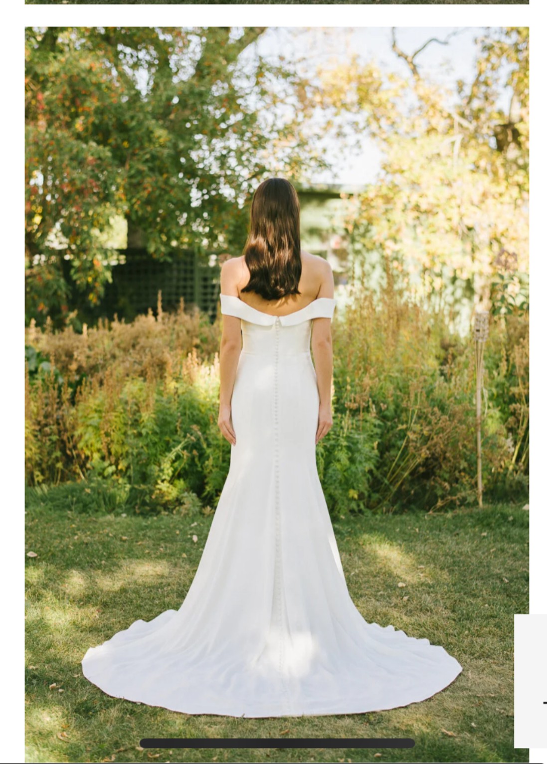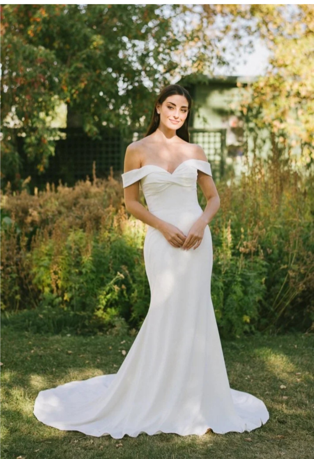 Ivory Jersey-satin off-the-shoulder bodice with pleated sweetheart bust. Fit and flare skirt, with buttons down the entire length of bodice and chapel length train. Zipper back.