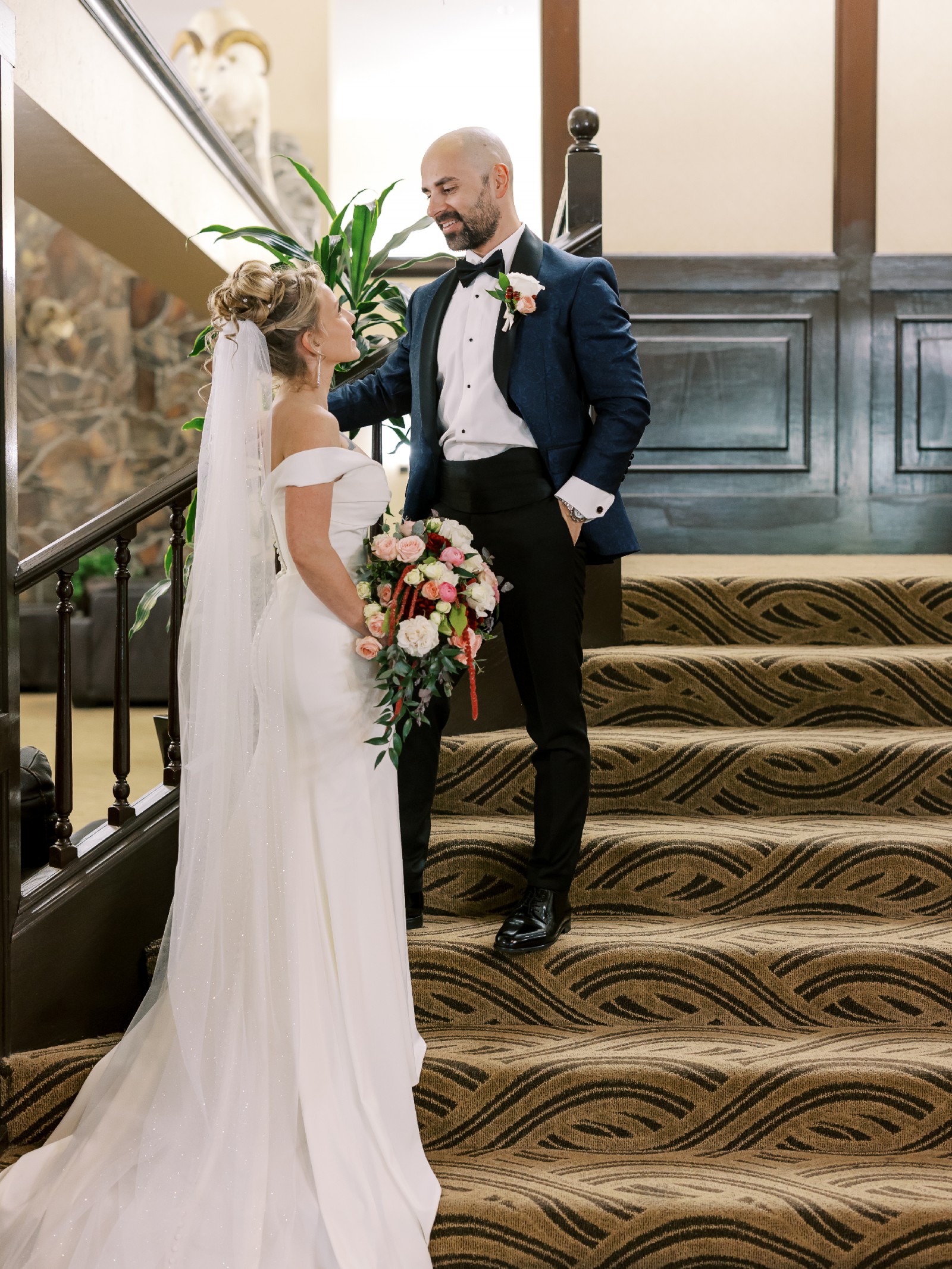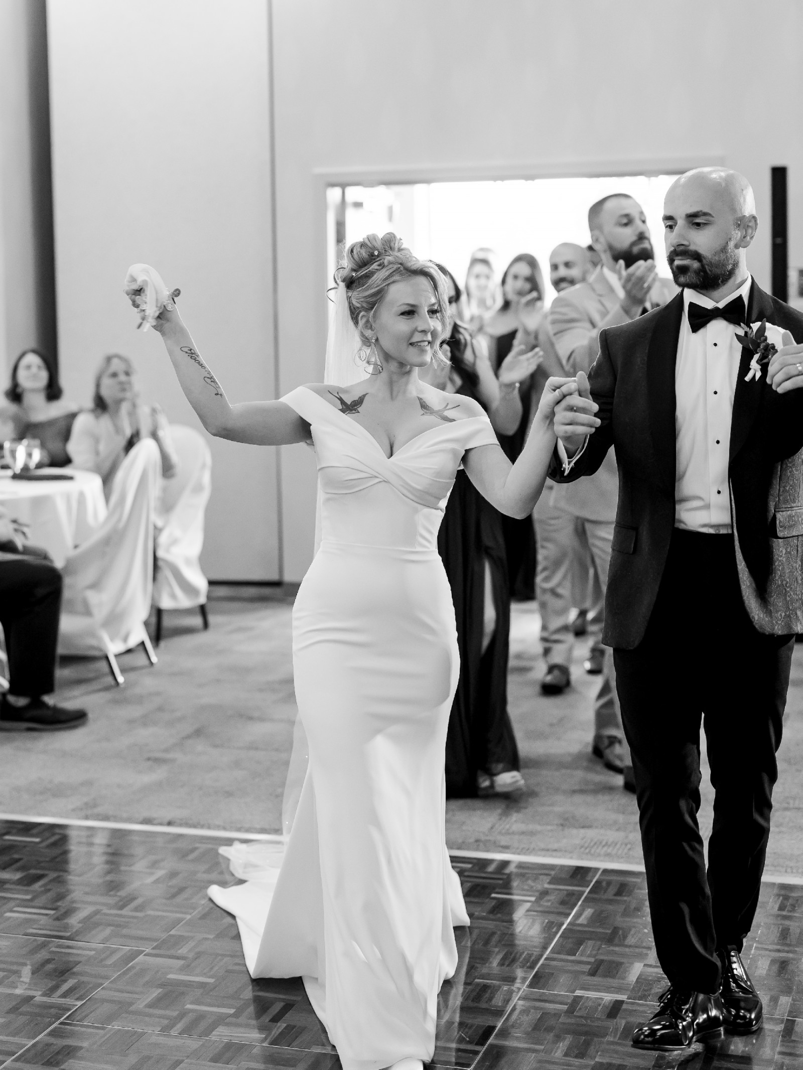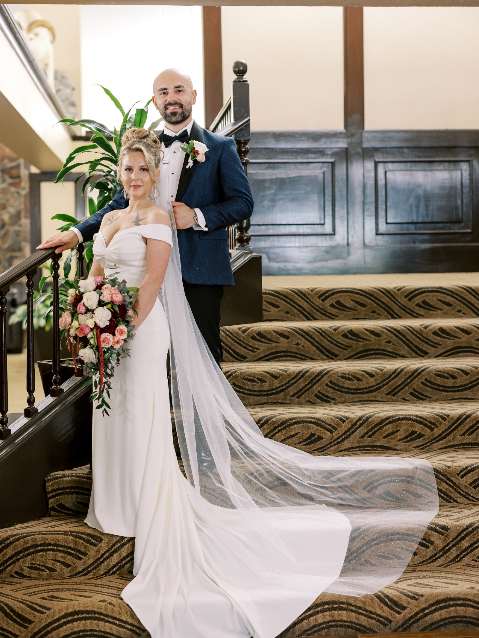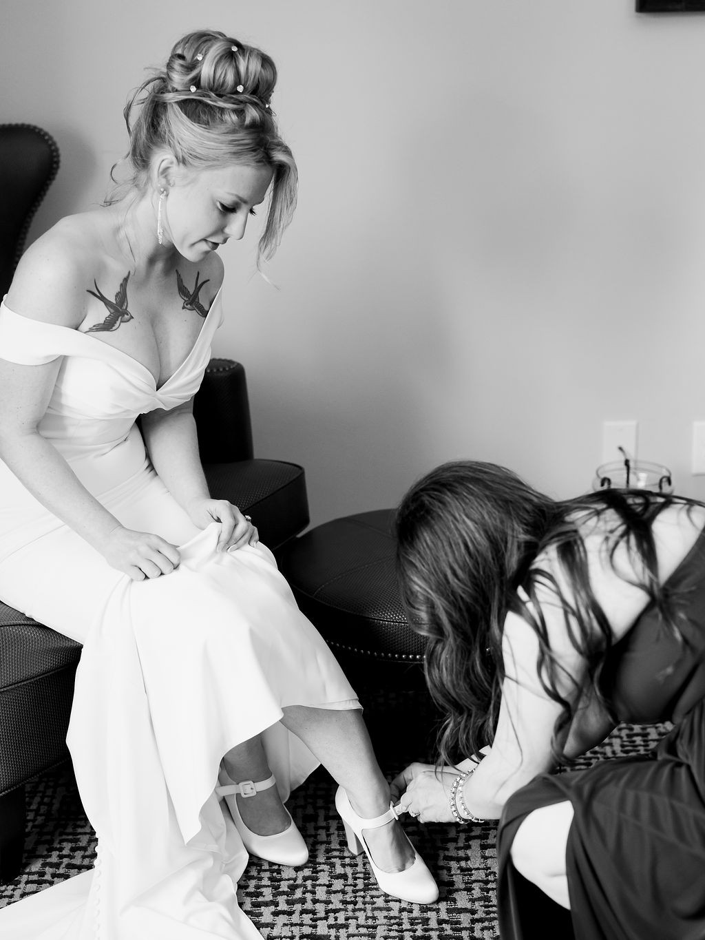Ivory Jersey-satin off-the-shoulder bodice with pleated sweetheart bust. Fit and flare skirt, with buttons down the entire length of bodice and chapel length train. Zipper back.