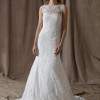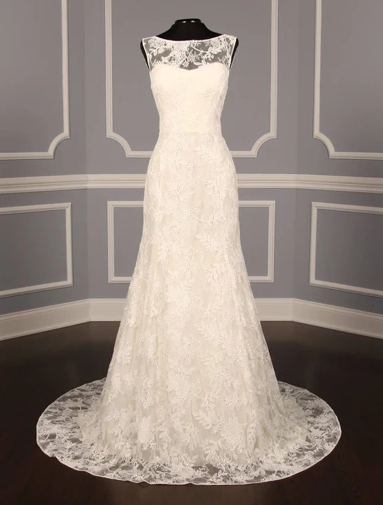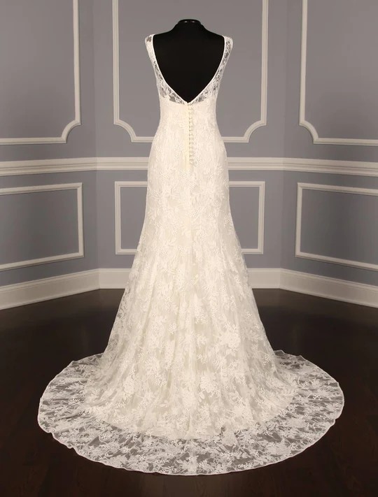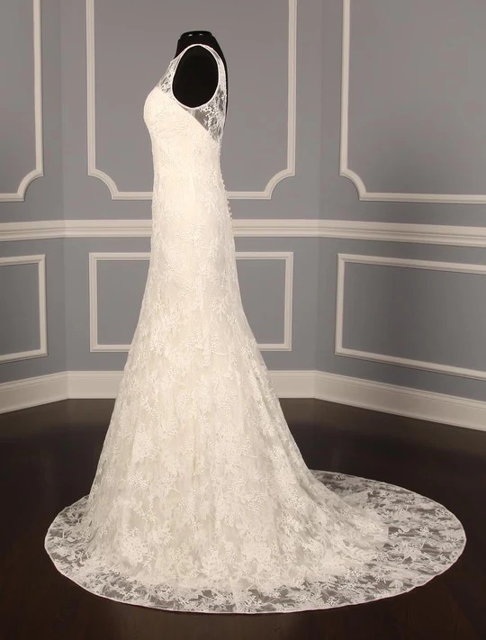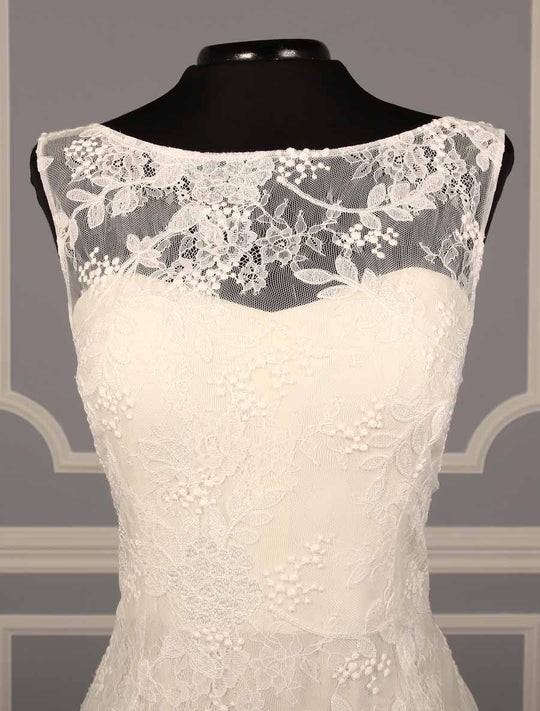 This beautiful Lela Rose The Estate Wedding Dress is such an incredible gown! This gorgeous lace wedding dress is made from embroidered Chantilly Lace with a sexy, yet elegant, v-back. The fabric-covered buttons complete the sophisticated look! The sleeveless wedding dress with a bateau neckline would be a perfect choice for a church wedding.