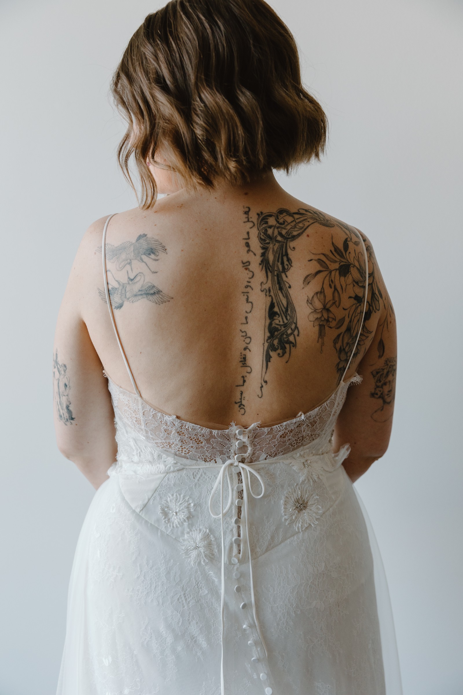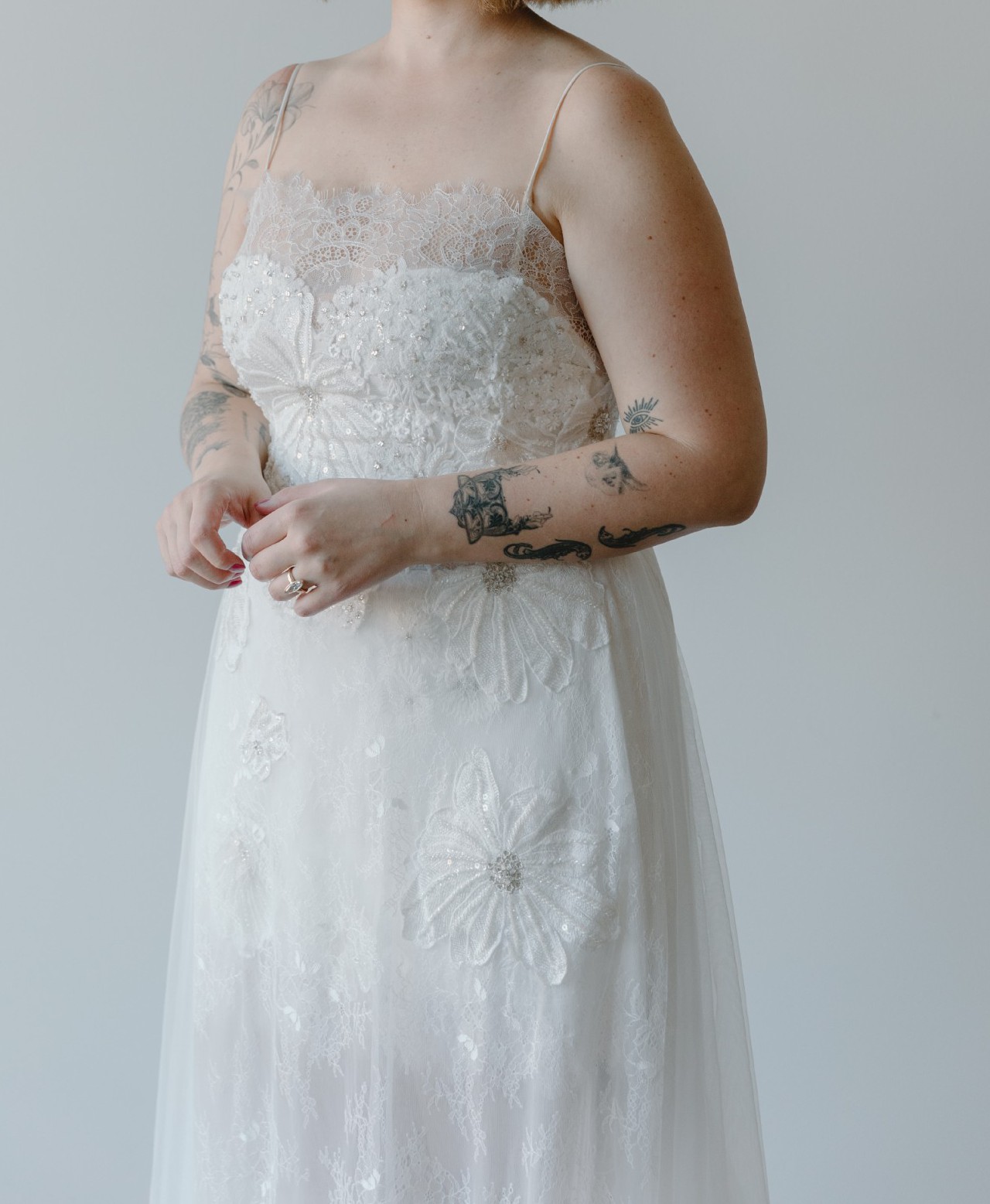 Drawing inspiration from 1920s glamour, this lace wedding dress features a sheer design layered with delicate lace and adorned with hand-placed floral embroidery that cascades down the train. Rosie offers both beauty and structure – you'd never know it has built-in shapewear and boning, providing subtle support without sacrificing its light, effortless feel.