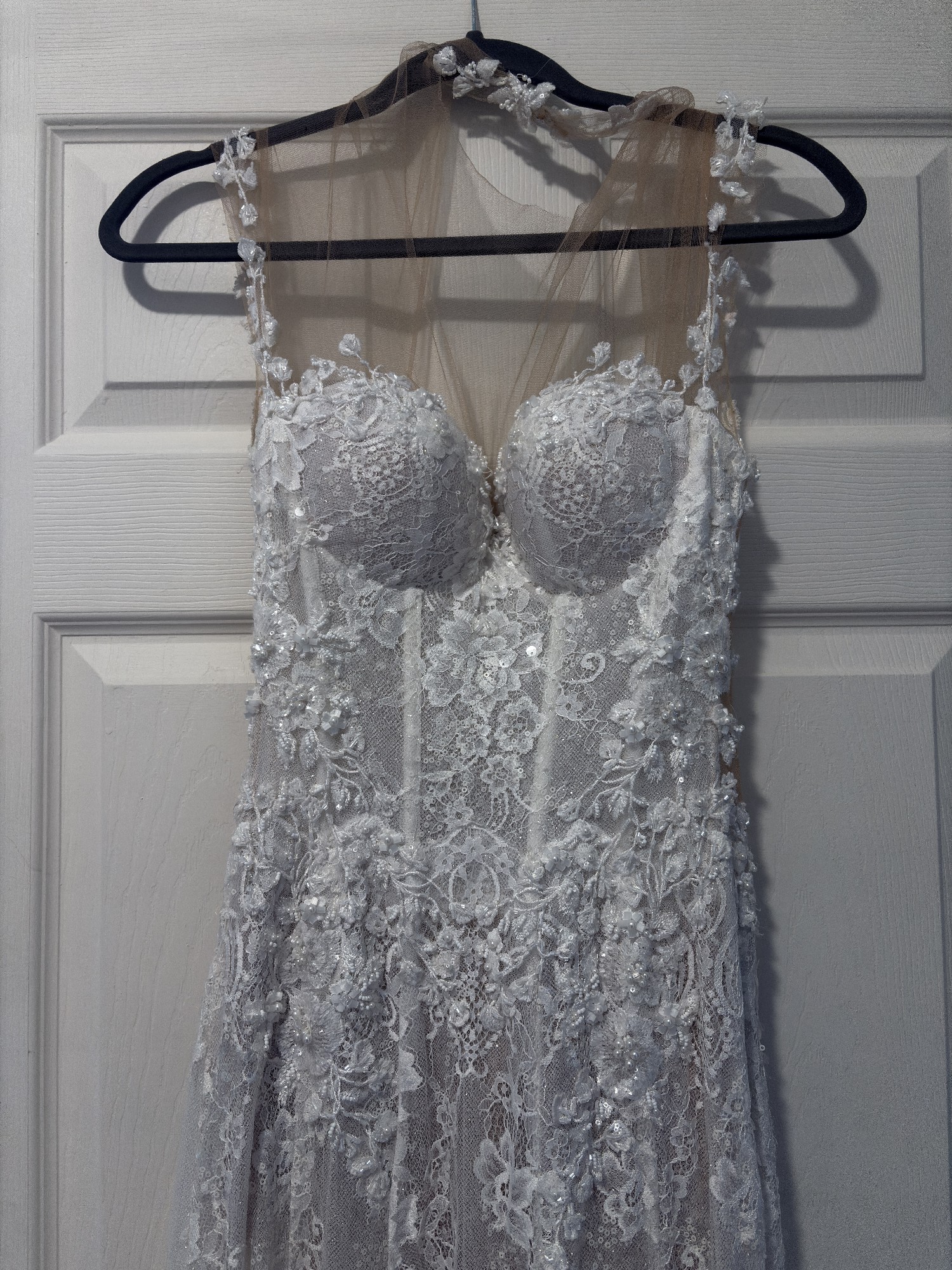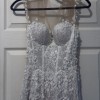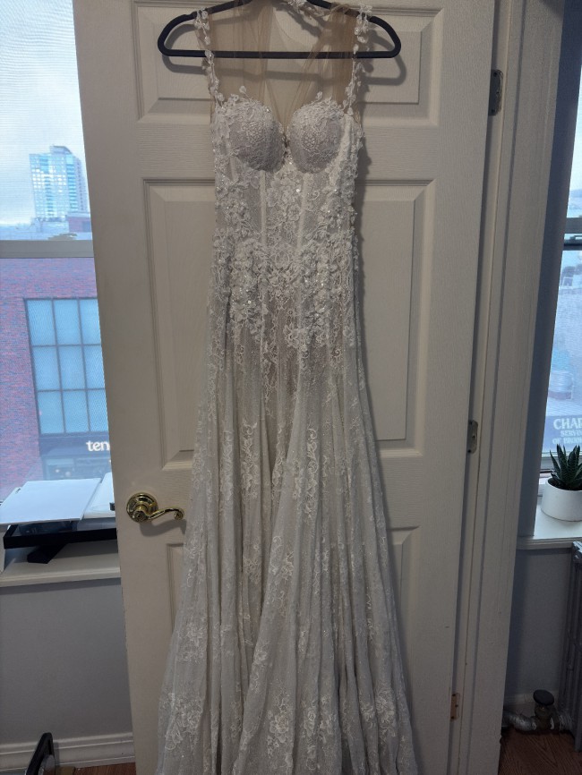 This G-203 by Galia Lahav is an exquisite masterpiece that beautifully combines elegance and romance for your special day. With its A-line silhouette, this dress gracefully flows from the waist, creating a flattering shape that complements a variety of body types. The sheer neckline adds a touch of allure, framing your décolletage with delicate beauty while hinting at a confident yet understated charm.