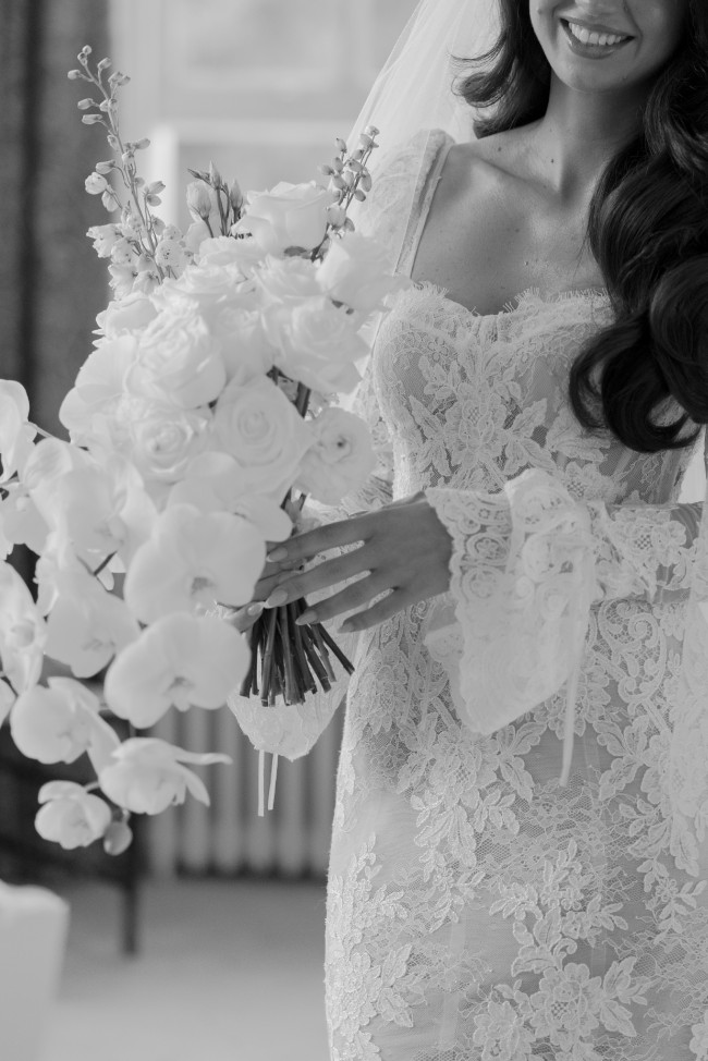 The gown includes dramatic flared cuff sleeves, a comfortable stretch lining, and the inbuilt signature Berta bodysuit. Released in bridal boutiques in Summer 2024, this style is Berta Privee 24-P101.