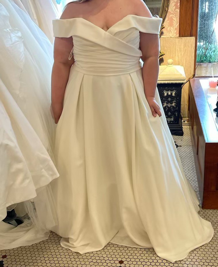 FYI - this dress is a little large on me, I am more of a bridal size 24, so the fit in the picture is loose. But even so, the A-line silhouette and draping around the bodice and in the back, really gives a stunning effect for us plus size girlies. With alterations I know it would have been even more snatched. And I absolutely LOVED the drama of the train that would also look great bustled.